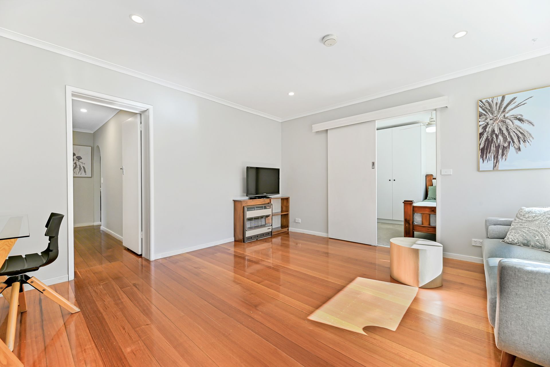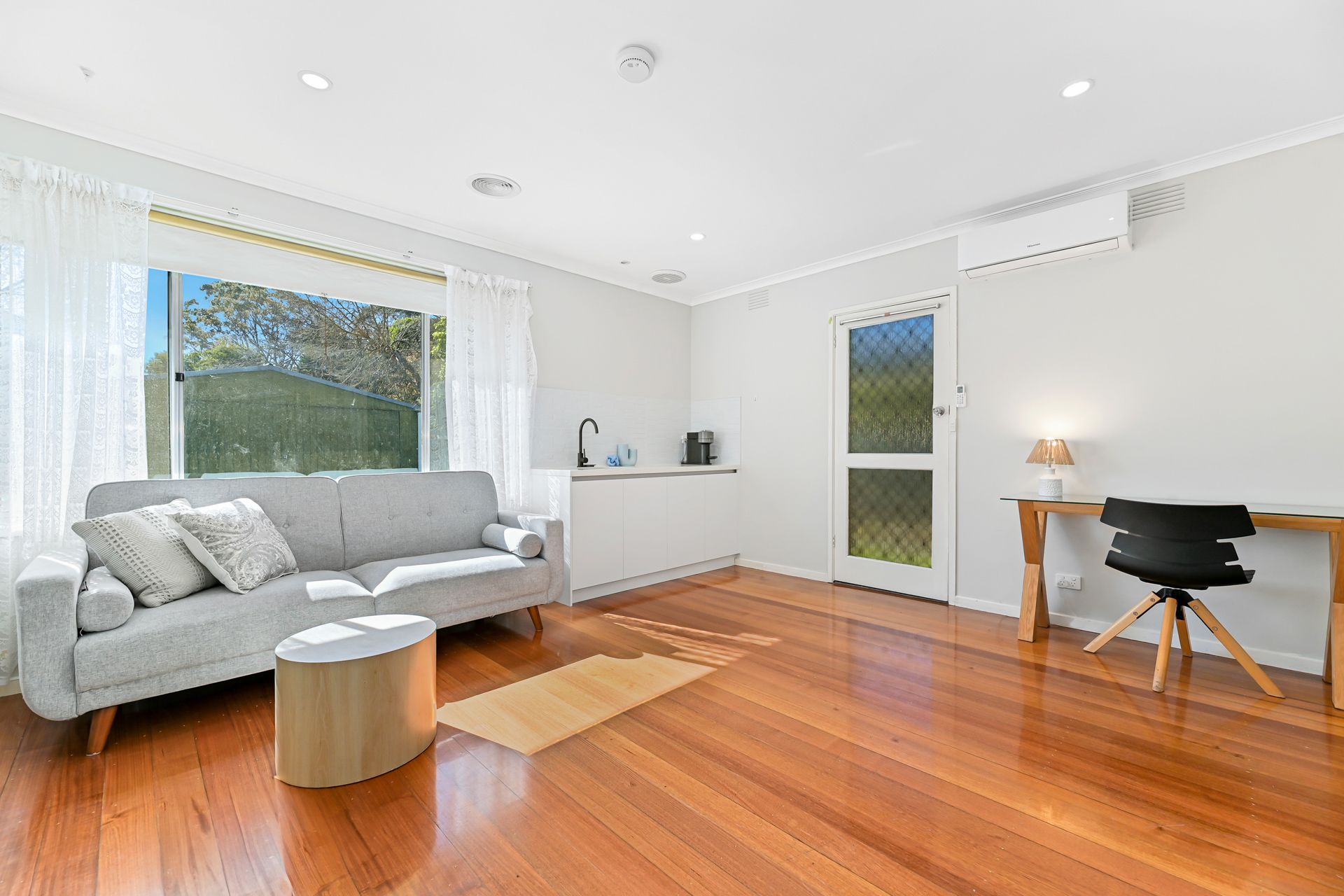 The spacious L-shaped lounge and dining area is bathed in natural light through tall windows, with ducted heating and air conditioning ensuring year-round comfort. A stylish kitchen and meals zone features gas cooking, a breakfast counter and ample storage, while three robed bedrooms are serviced by a sleek modern bathroom with spa bath, separate toilet and laundry.