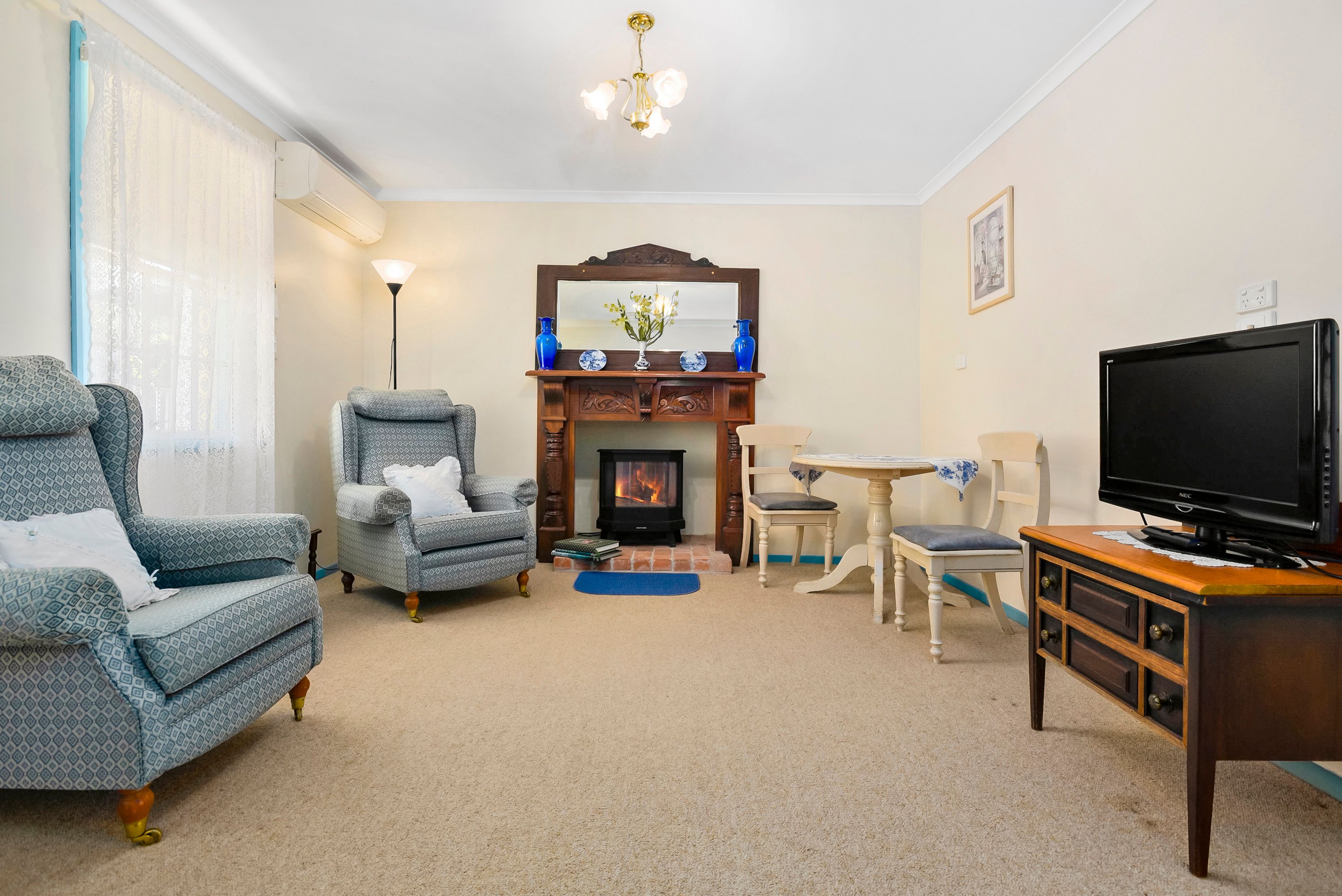 Little Quinn Cottage - Tucked behind a fresh white picket fence sits this charming 1 bedroom rendered brick residence. Offering an open plan with a split system, lovely colonial bar double sash timber windows and periwinkle blue feature leadlight windows. The compact kitchen is rustic with timber benchtops and a gas cooker. There is a 3-piece bathroom with a tiled niche. Outside you will find an undercover veranda and a vintage lamp post.