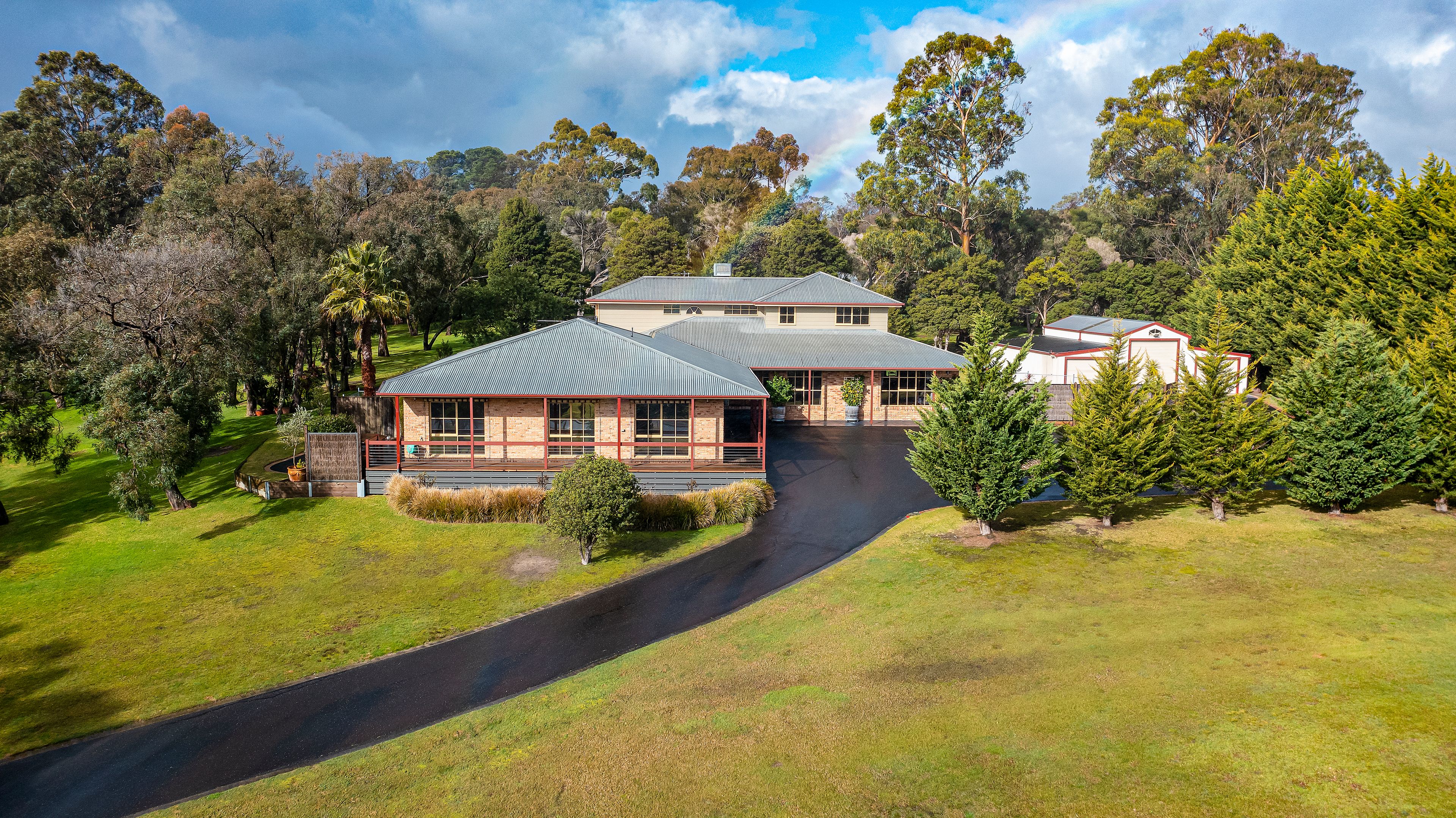 A grand facade at the end of a meandering asphalt drive secrets an expansive interior, styling its ground floor with formal and casual living spaces, the latter with a gas log fireplace by an open dining and kitchen domain lavished with superior appliances and rich timber cabinetry. The master bedroom headlines four total bedrooms and an enclosed study, featuring a walk-in robe and a dual-vanity ensuite with a double rainfall shower, with the remainder upstairs around a family bathroom and third living space.