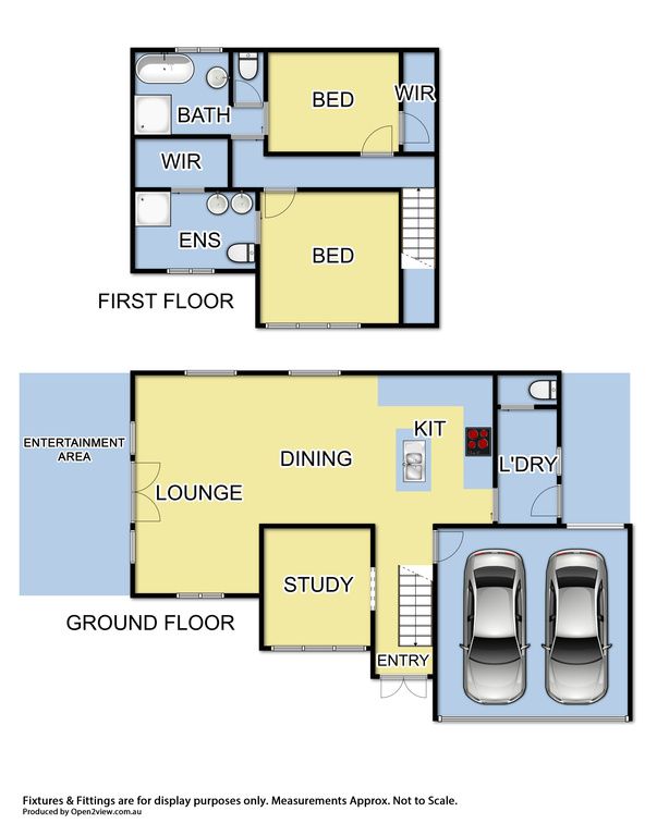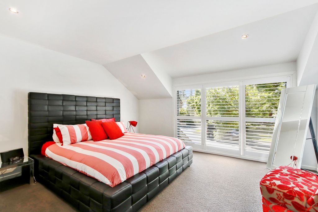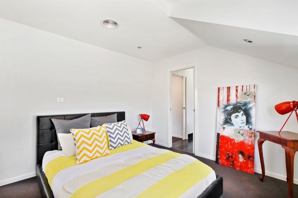 Two upstairs double bedrooms with soaring ceilings, with large windows are light bright and well proportioned. Both are fitted with extensive walk in robes, the stunning main bedroom has its own sumptuous ensuite, double vanity and features porcelain tiles with a metallic finish. The full family bathroom with freestanding bath and large shower also allows access via the second bedroom as an ensuite effect or off the main hallway.