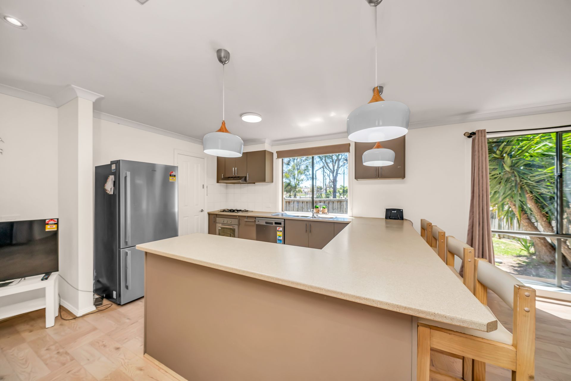 - Modern kitchen complete with open fridge space, stainless steel appliances, dishwasher & ample storage in the walk in pantry