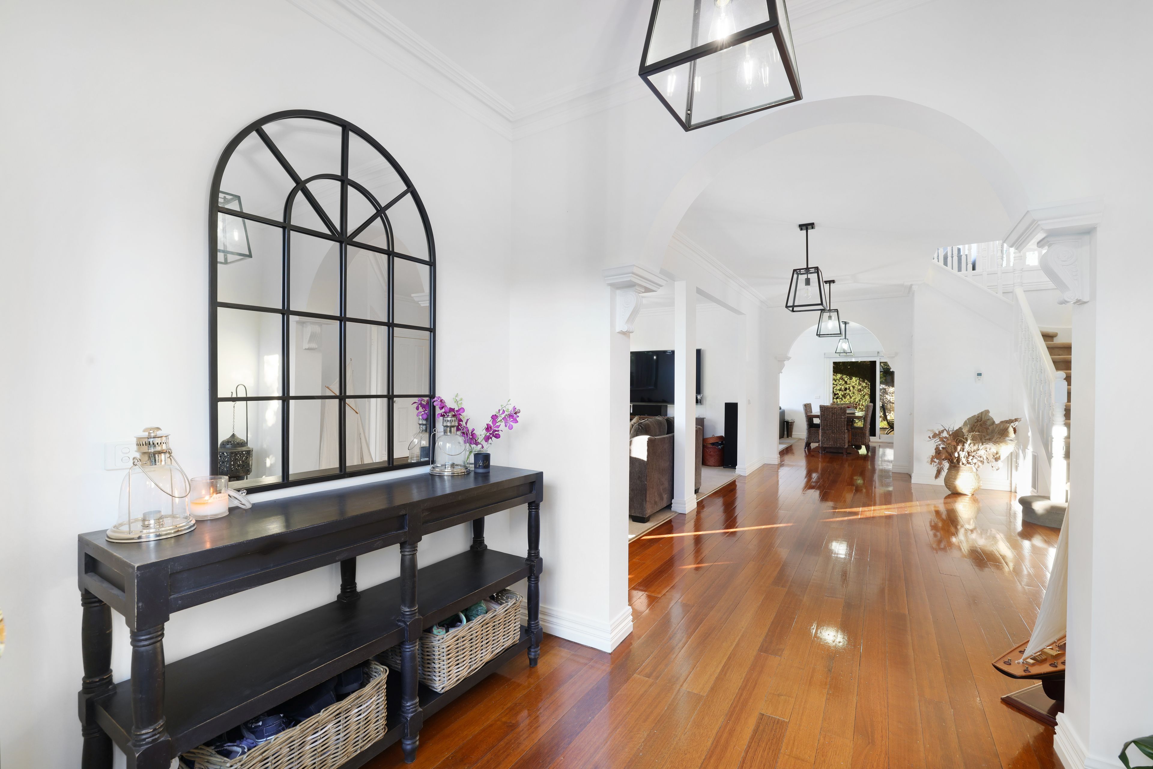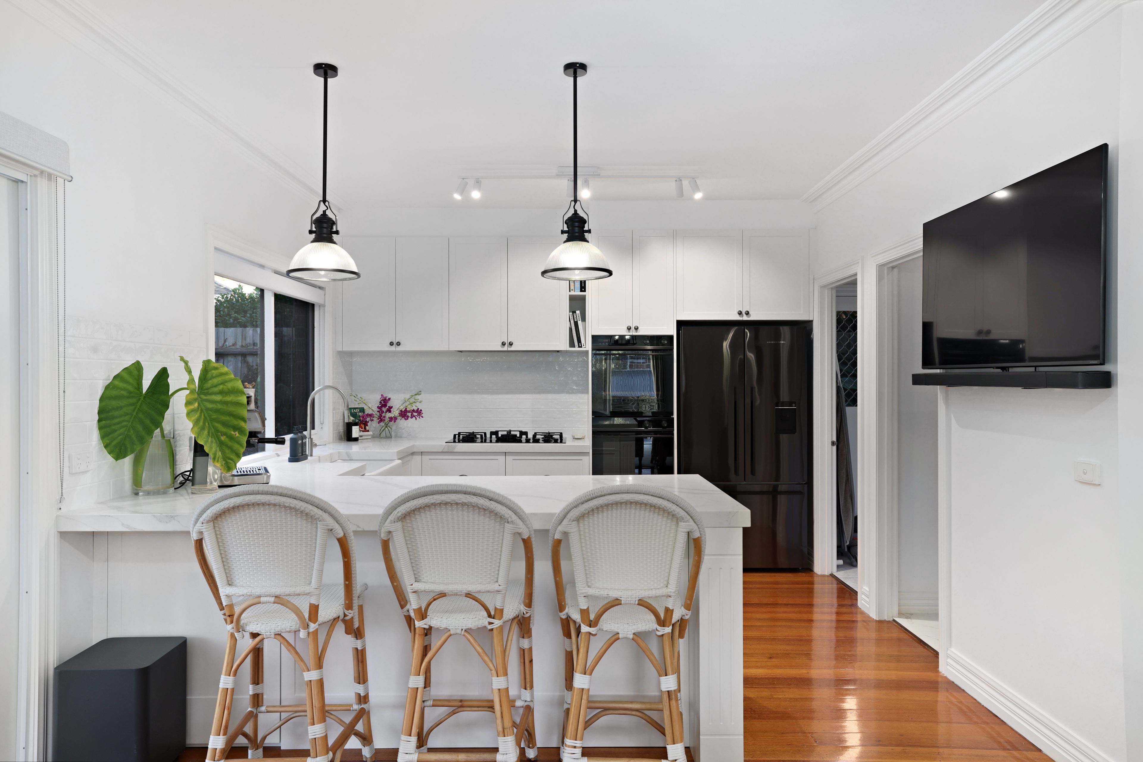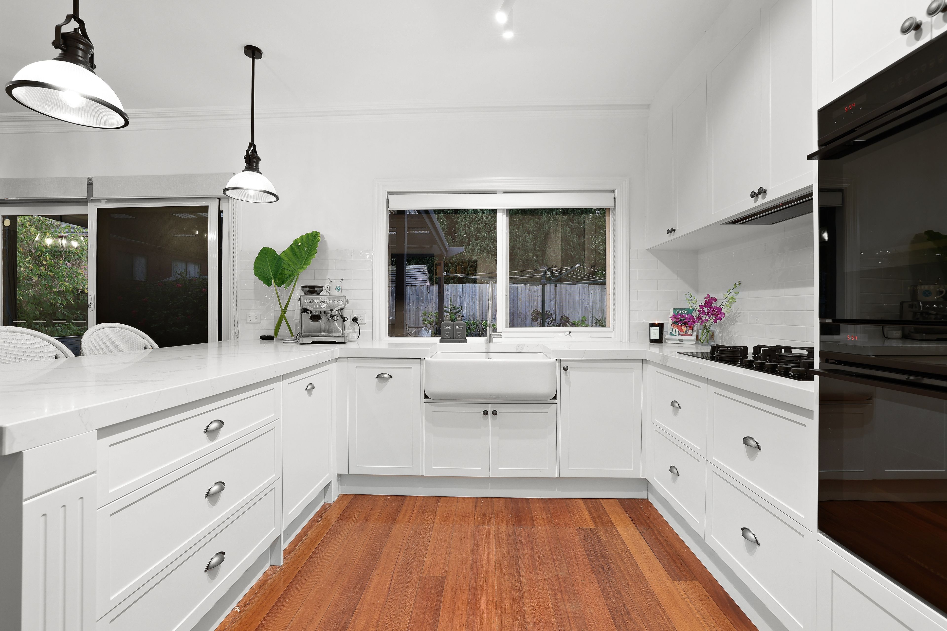 Step into, a spacious entryway that sets the tone, to the left you're greeted by an expansive living area and a versatile home office on the right, catering to diverse professional and personal requirements. Just beyond, the open-plan design seamlessly integrates the kitchen, dining, and family areas, forming a central hub for daily activities. The kitchen is modern, renovated and radiates contemporary elegance with its premium features such as marble stone benchtops, a deep farmhouse sink, a walk-in pantry, pendant lighting, and a suite of high-end appliances including dual electric ovens and a gas cooktop, facilitating culinary endeavors with ease.
