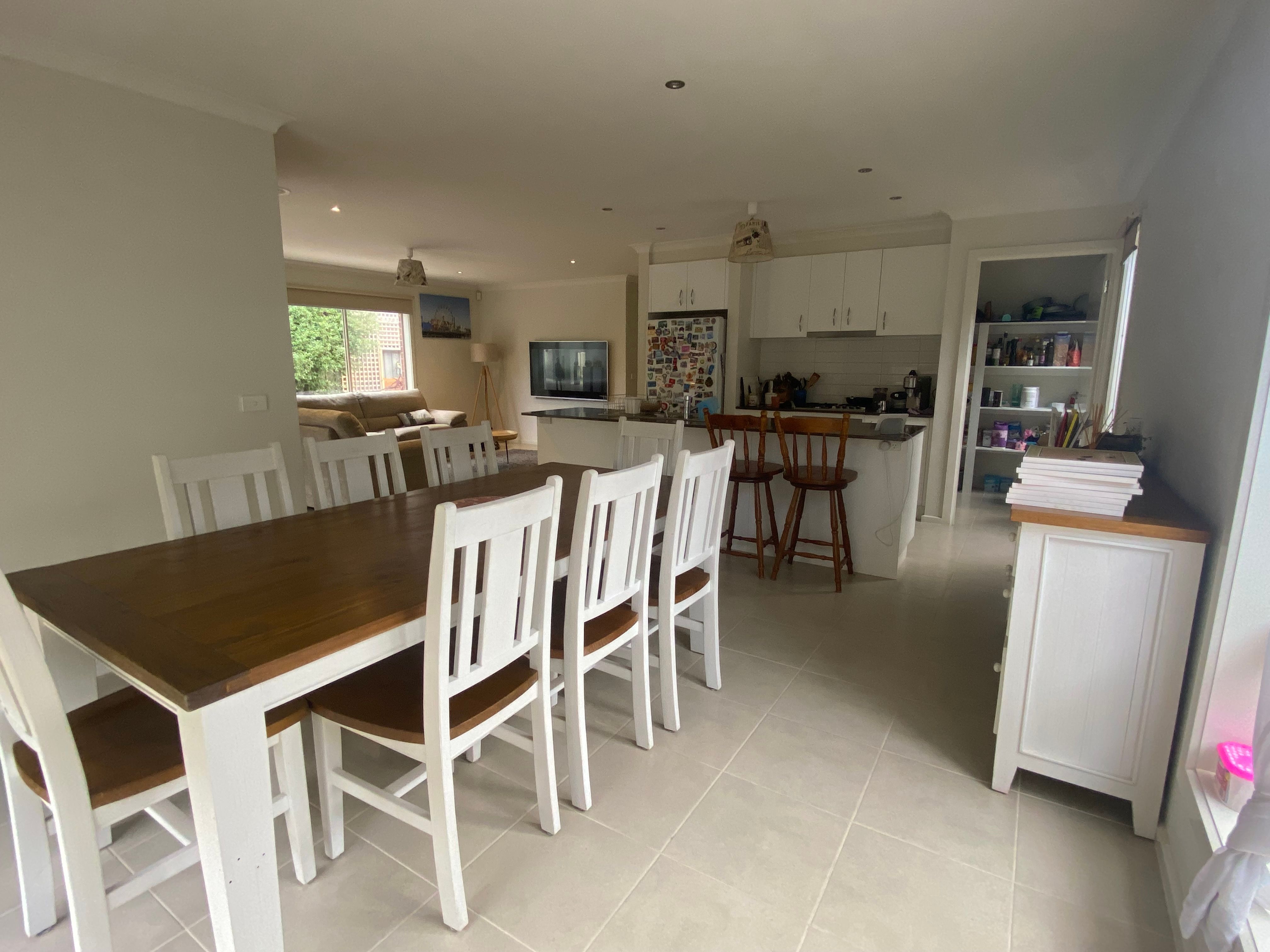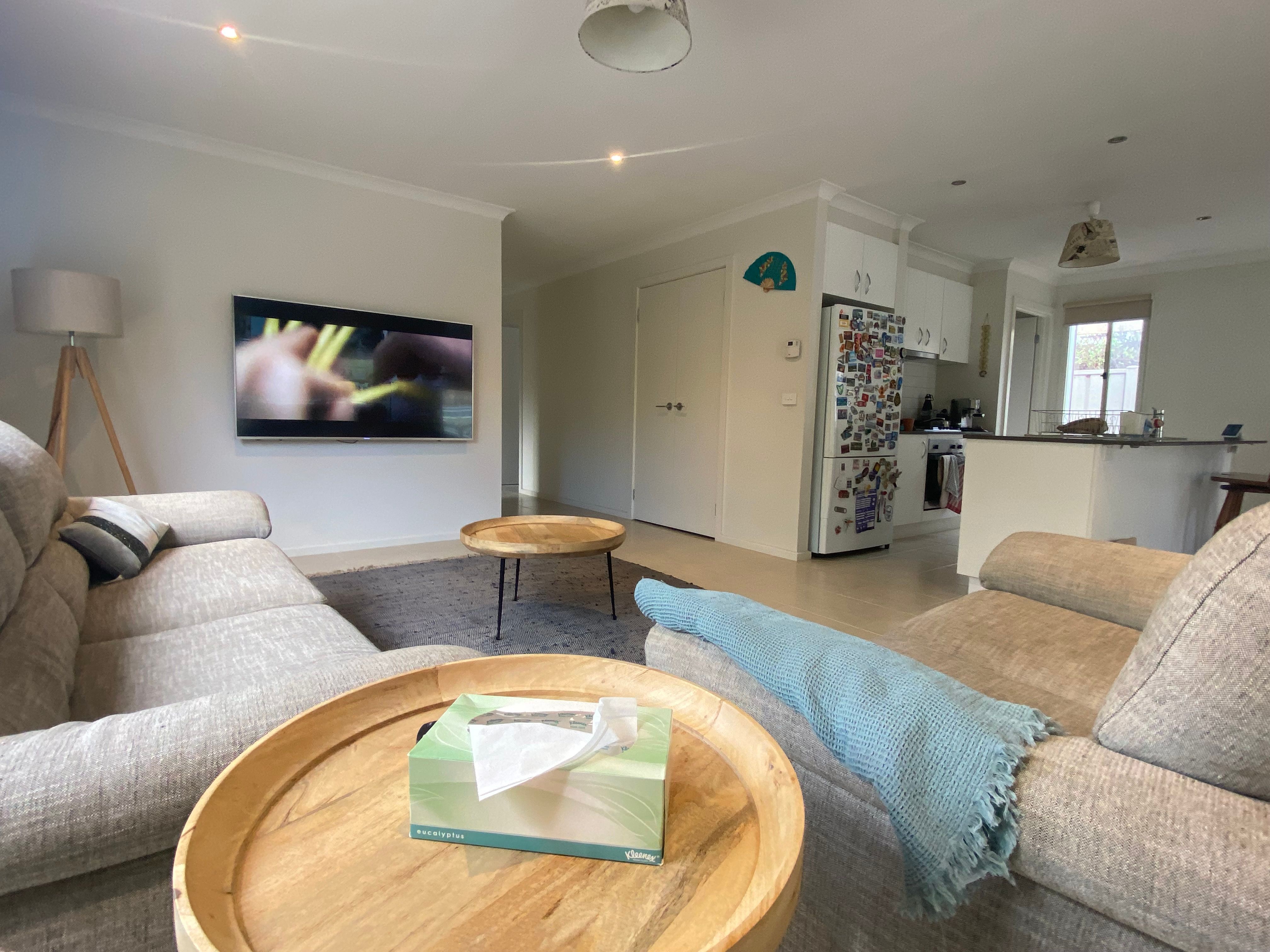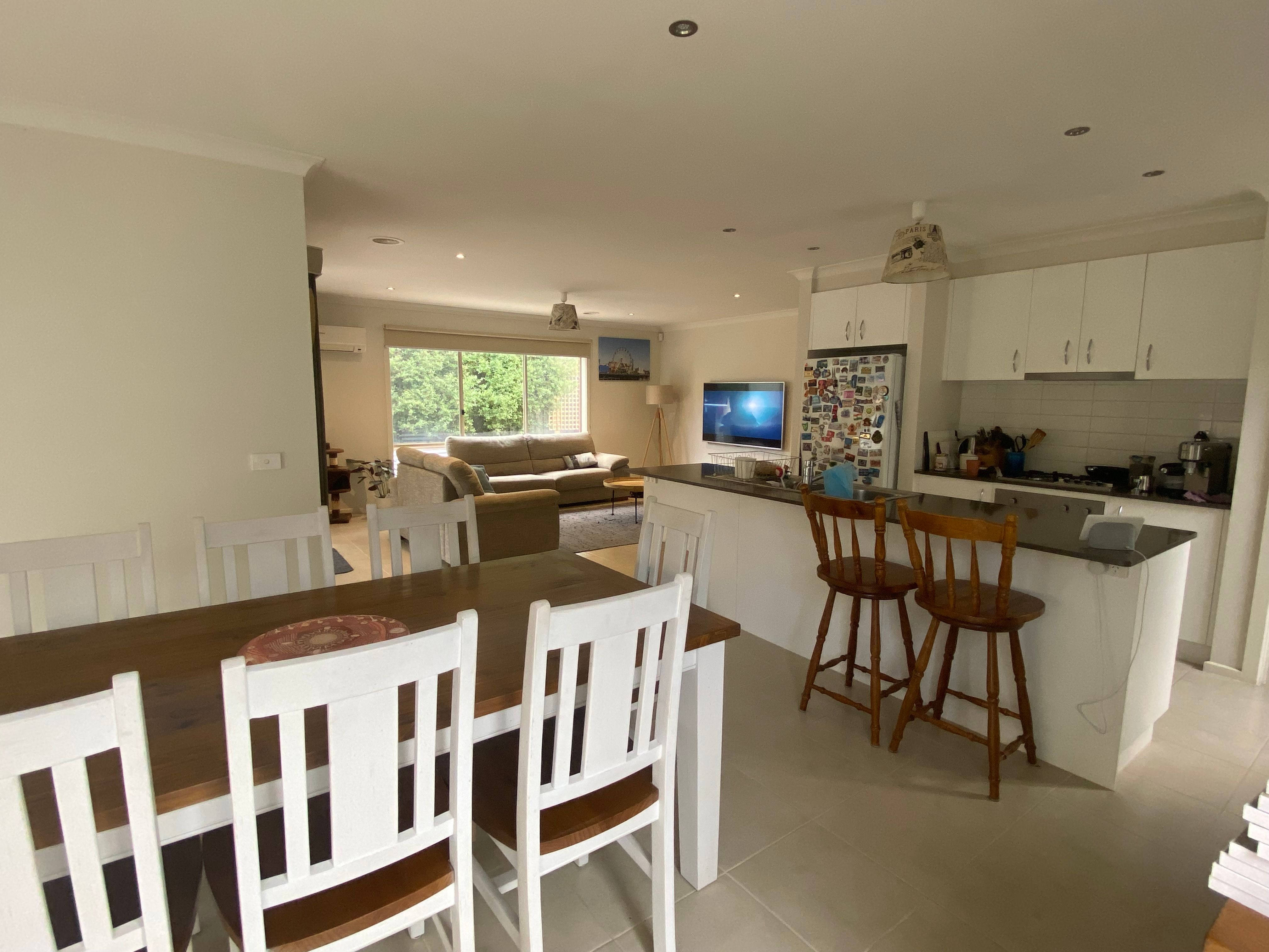 The kitchen/living area awaits you, featuring a large island bench, white cabinetry, stone benchtops & stainless steel appliances. The kitchen overlooks your open plan living area which further opens to your outdoor living area with manicured and landscaped gardens