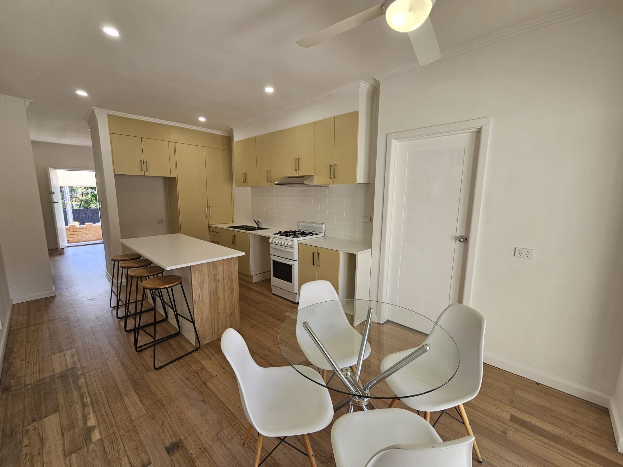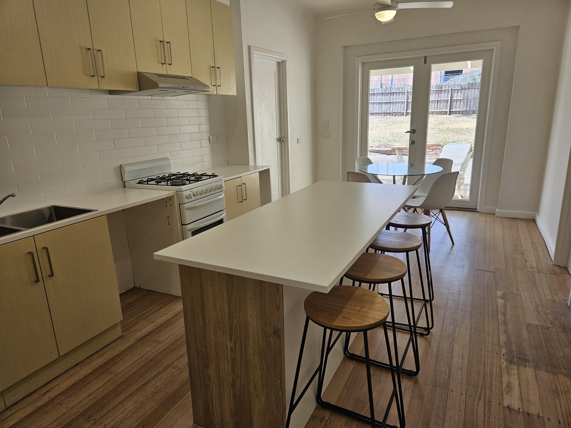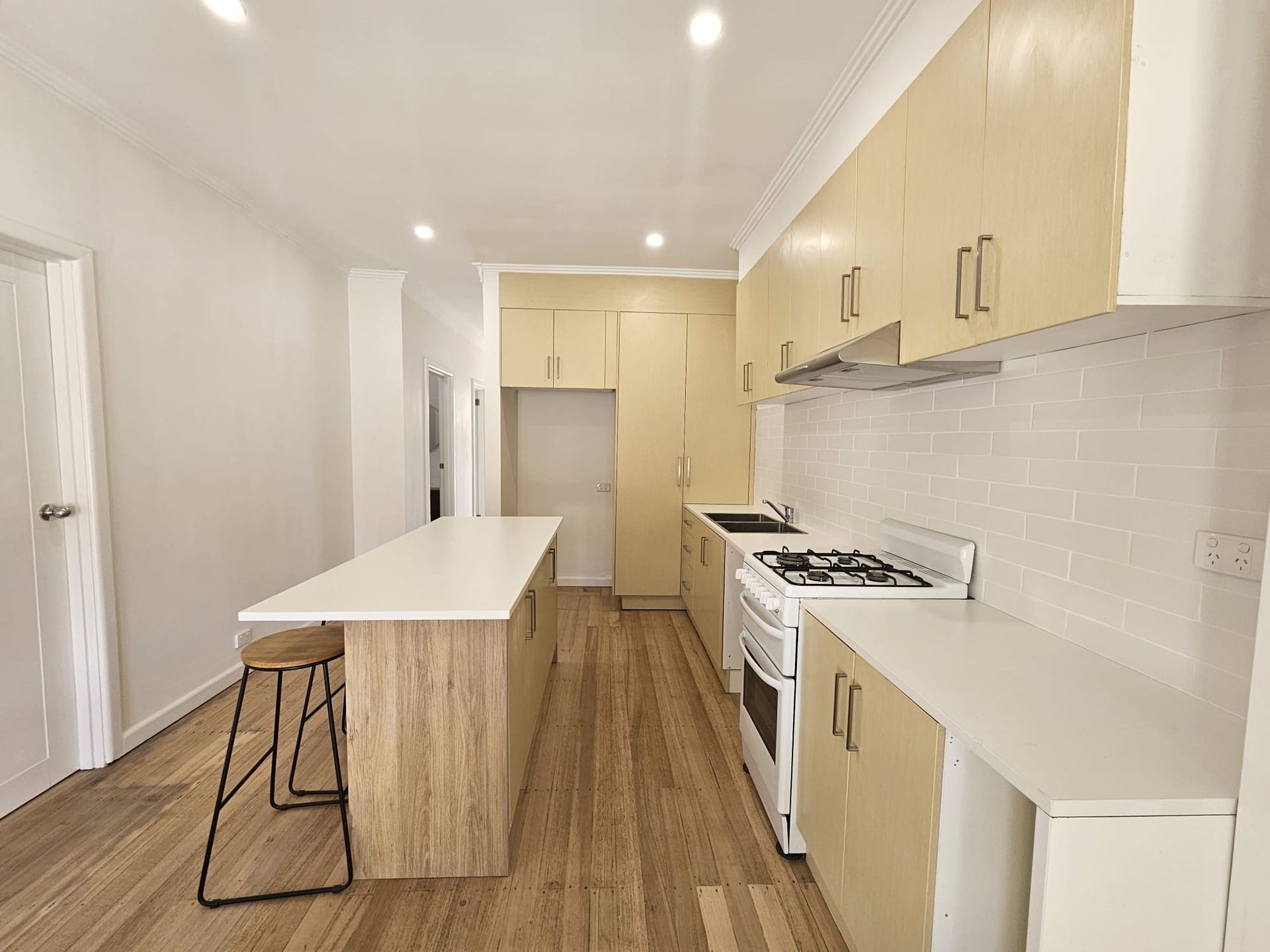 * Kitchen with plenty of cupboards, island bench and gas cooking