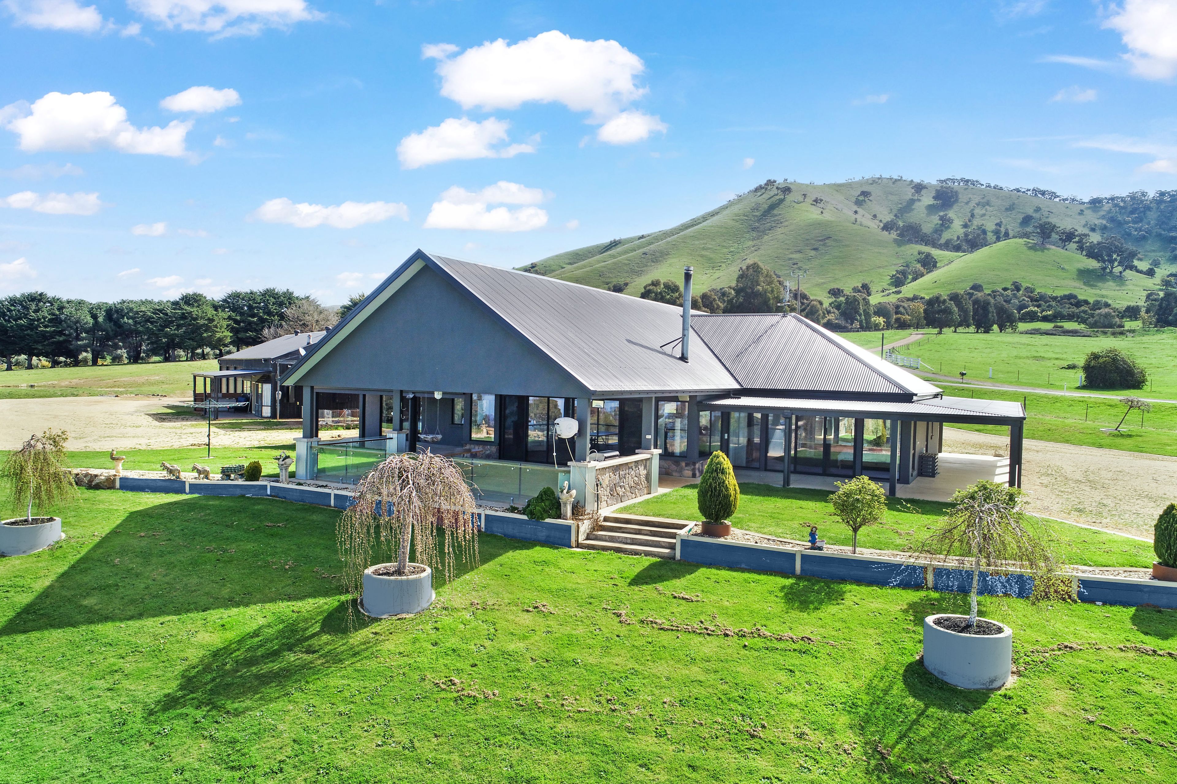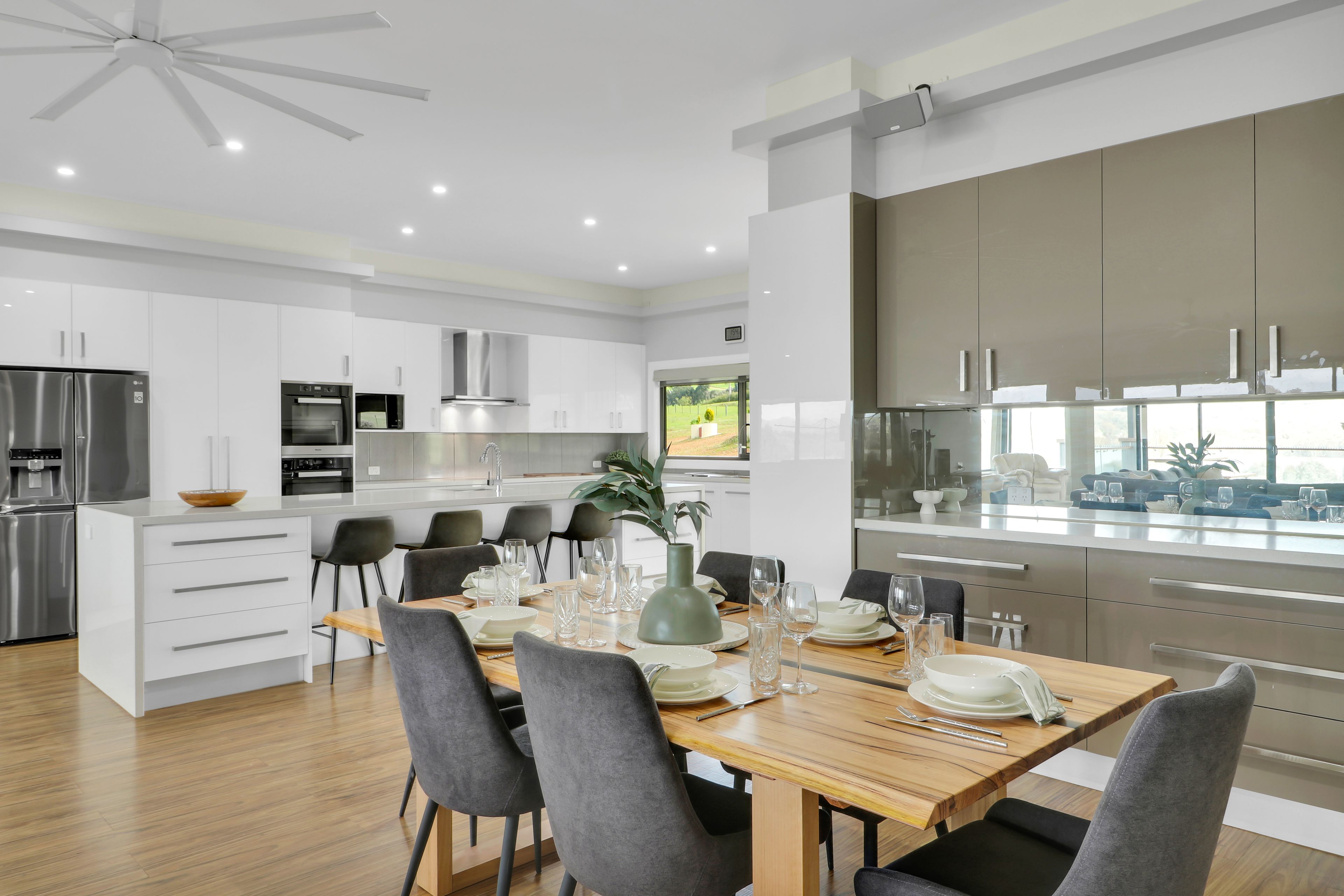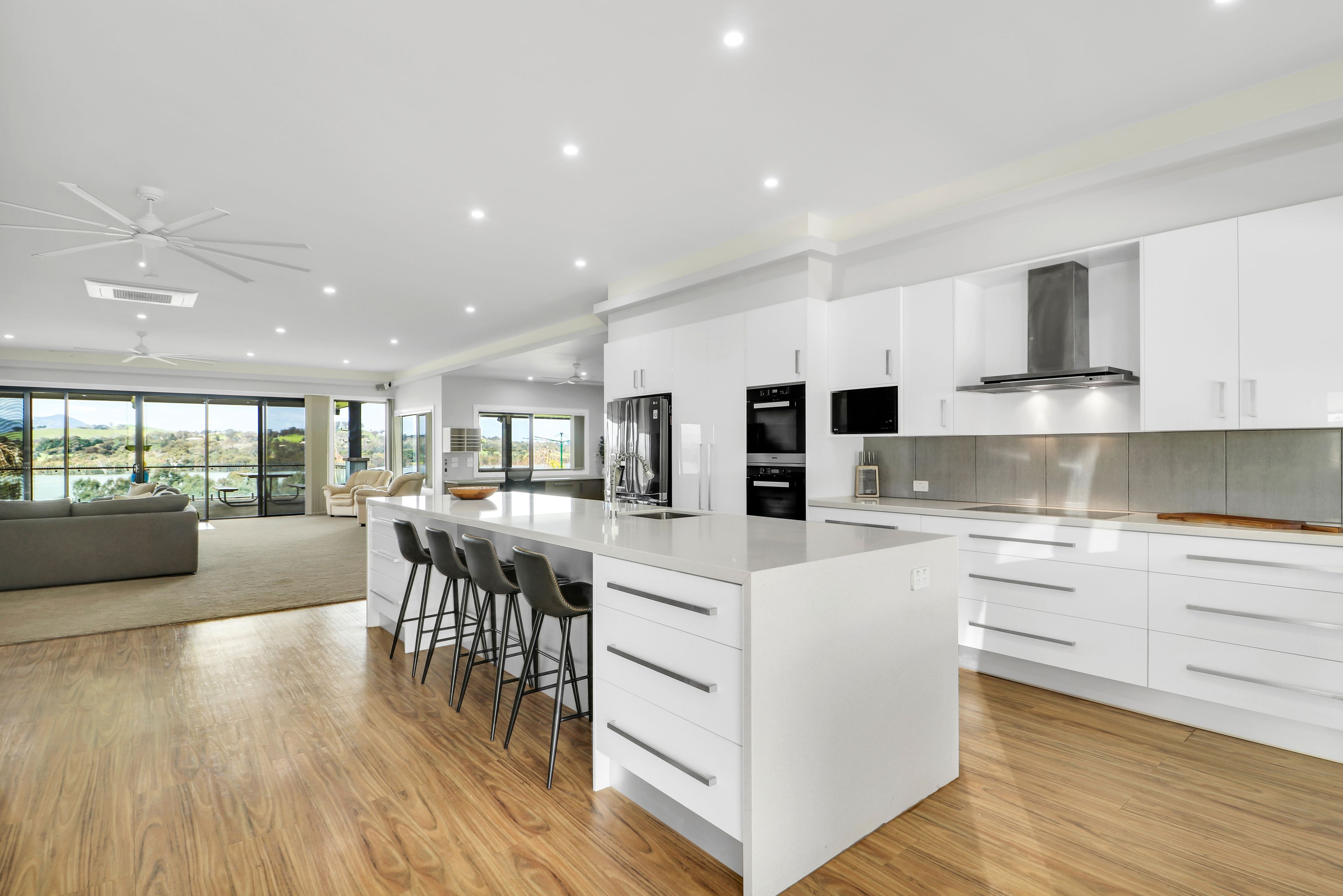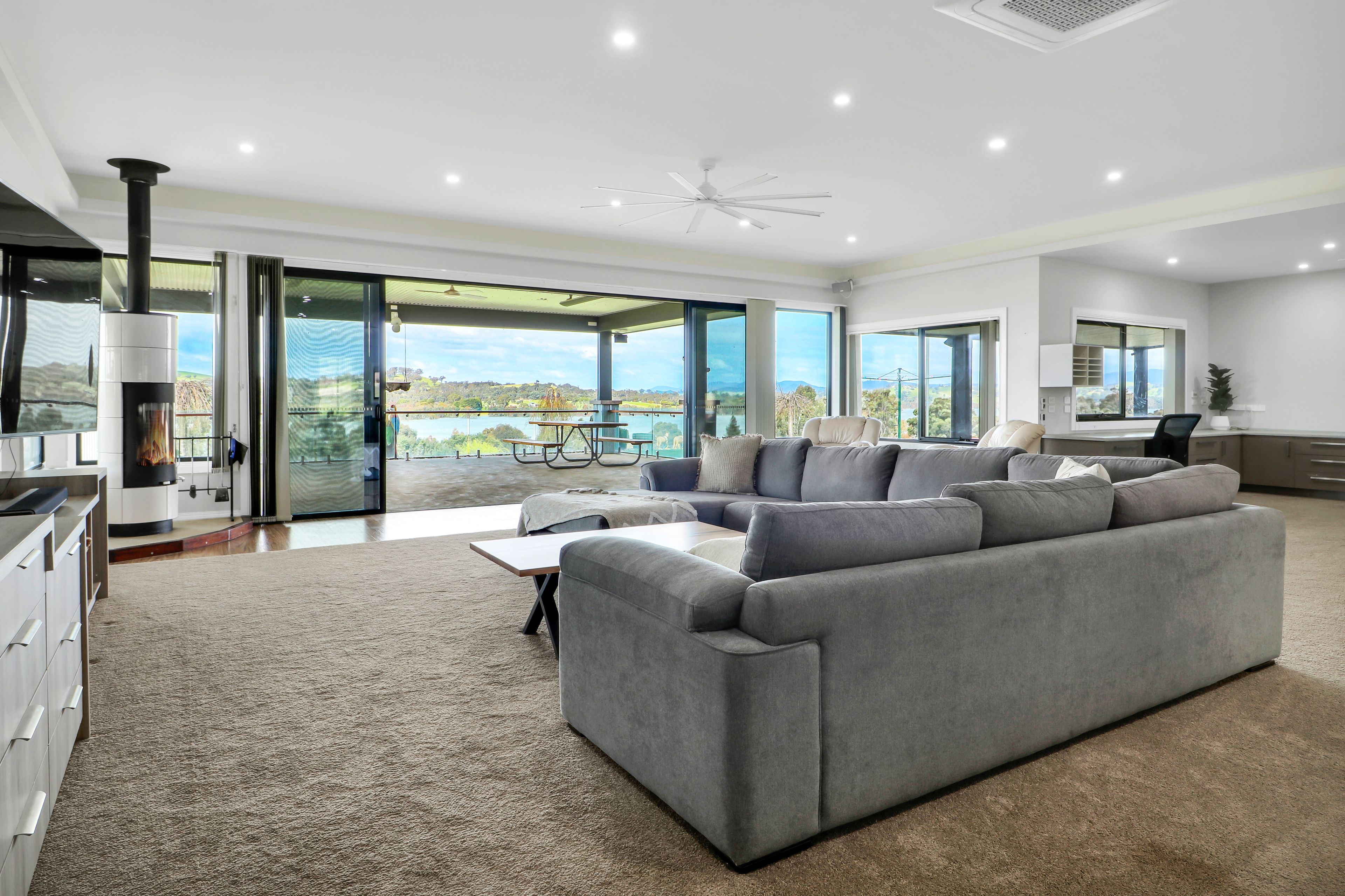 Inside, the heart of the home is a chef's dream kitchen featuring stone bench tops, a sprawling 4 x 1.2m island bench with premium Miele appliances, and ample storage. Flowing seamlessly from the kitchen, the generous living, dining, and meals areas extend to an outdoor entertaining oasis. Here, a covered area with a built-in kitchen overlooks breathtaking views of the lake and Mt Buller, creating an ideal setting for gatherings with family and friends.