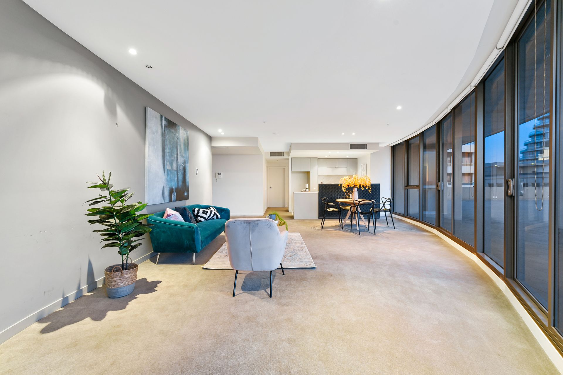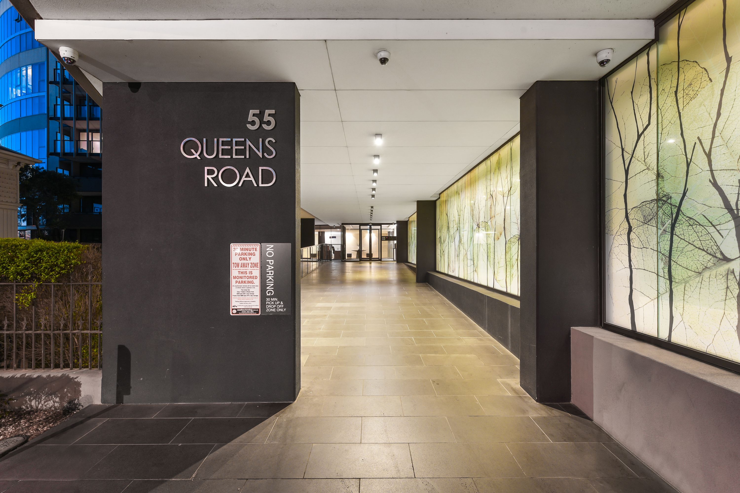 Positioned on the 10th floor of Grosvenor On Queens', the stunning apartment begins with a generous open plan kitchen, dining and living area enjoying an abundance of natural light and amazing views through the wall of floor to ceiling windows. The sleek kitchen impresses with marble benchtops and splashback, 900mm wide cooktop and oven, in-built microwave, integrated dishwasher, underslung double bowl sink and pull out pantry. Continue through to the comfortable accommodations comprising of two bedrooms with full width windows and mirrored built in robes, a stylish main bathroom with European laundry facilities and a master bedroom with terrace access, ensuite and walk in robe.
