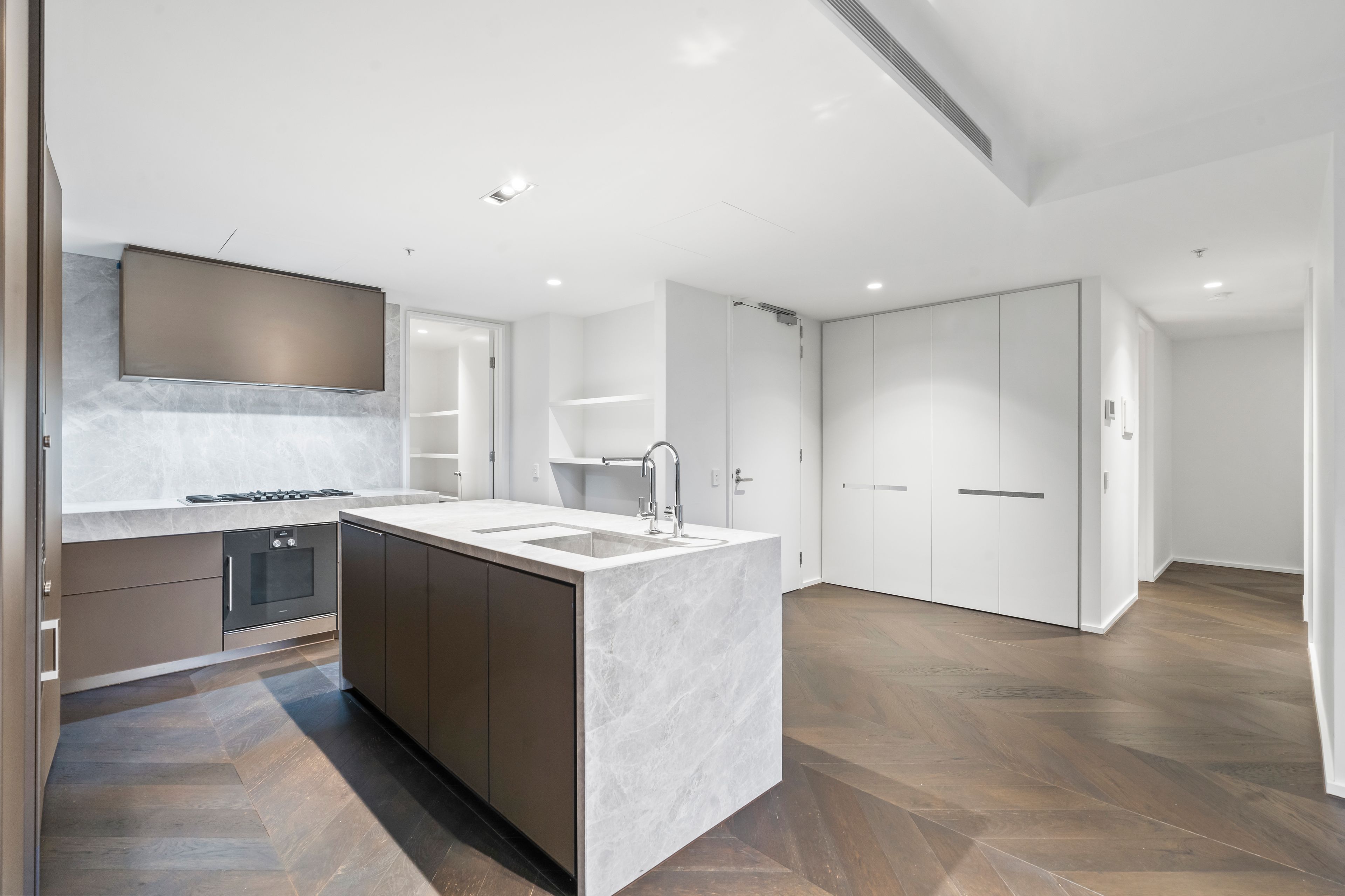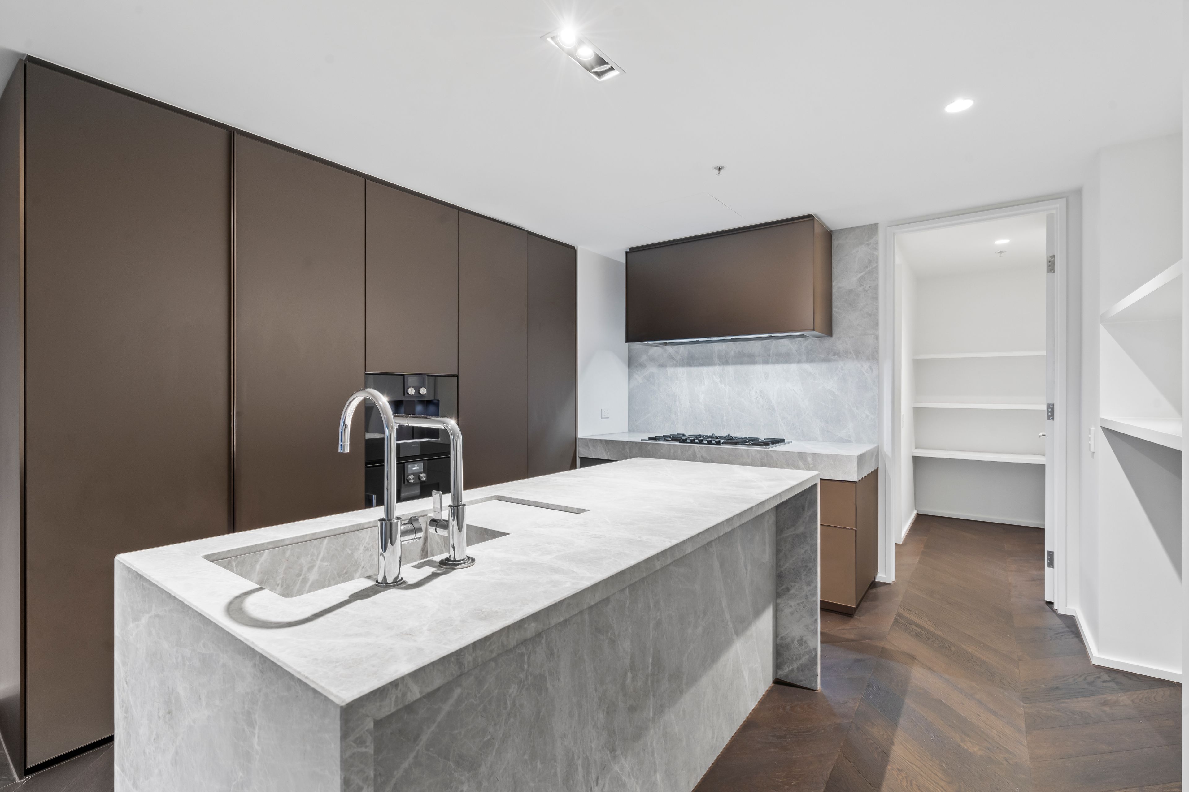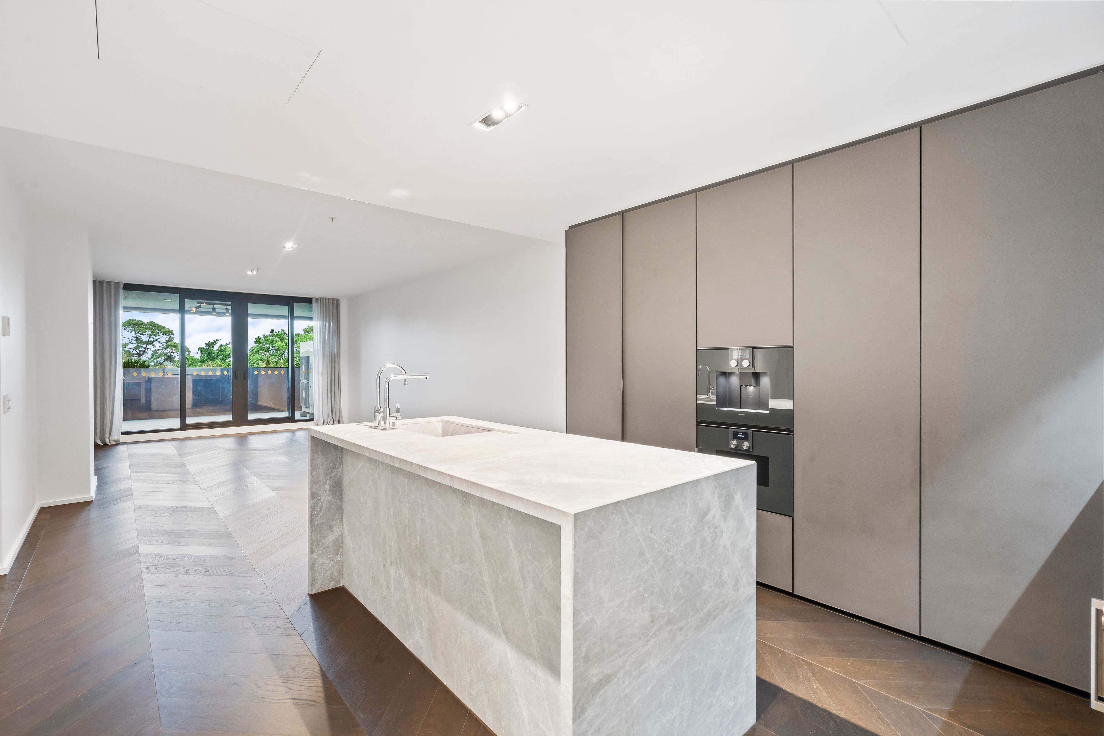 The gourmet kitchen is a chef's dream, adorned with stone countertops, ample bench space for stools, and high-end Gaggenau appliances, including a five-burner gas cooktop, convection microwave oven, integrated coffee machine, and a full-size Liebherr double-door fridge/freezer. Thoughtful details such as a filtered, instant boiling, and sparkling water tap enhance convenience, while custom lighting adds ambiance to every corner.