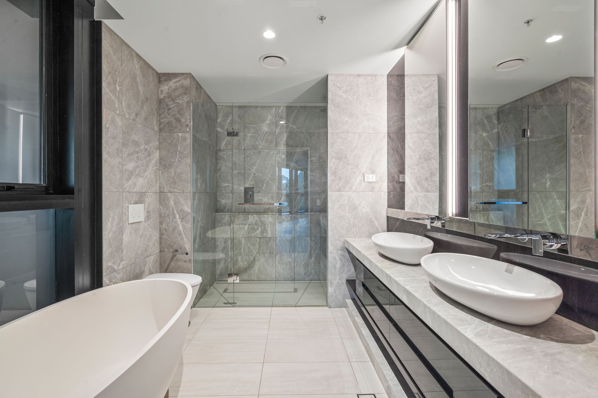 The main ensuite exudes elegance with its stone tiles, large walk-in shower, double sinks, generous storage, and a spacious bathtub with a handheld shower feature. It also has opening windows with fly screens, making it a serene retreat. The second bedroom is equally inviting with access to a private balcony, abundant wardrobe space, and independently controlled ducted heating and cooling. The main bathroom complements these spaces, featuring stone tiles, a walk-in shower, drawer storage, and a toilet hidden behind the door on entry.