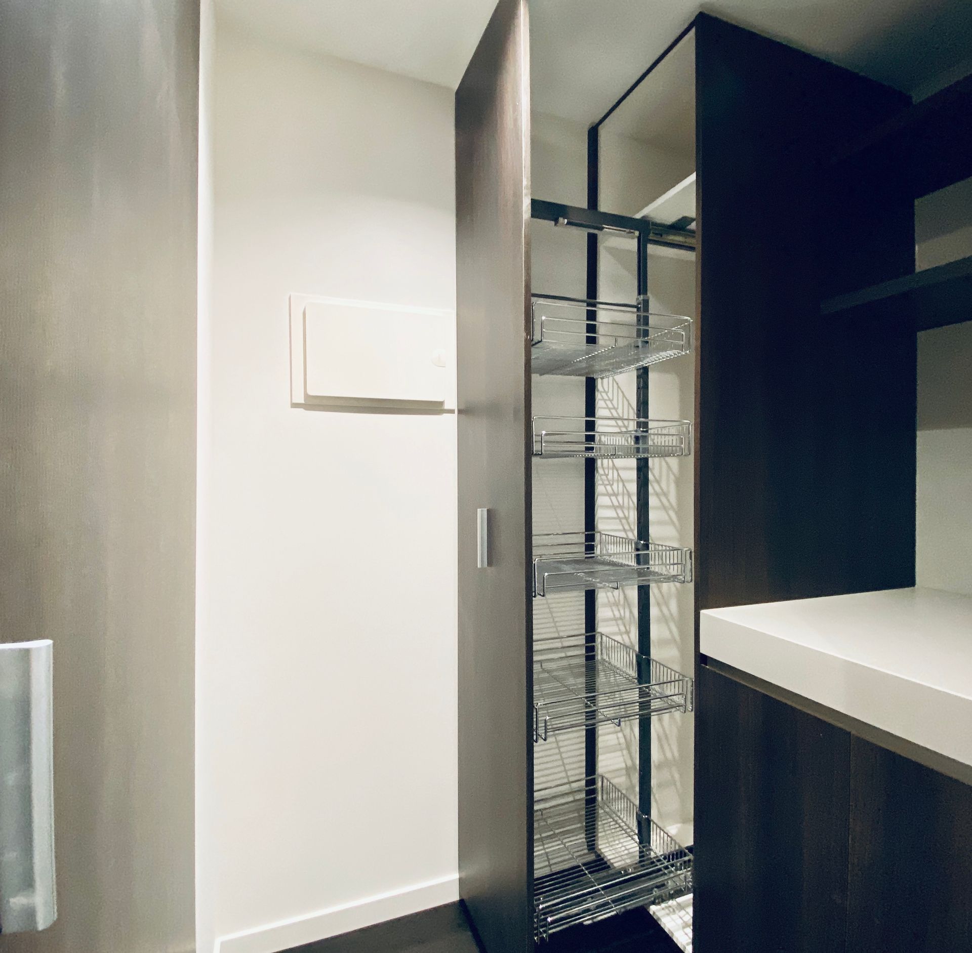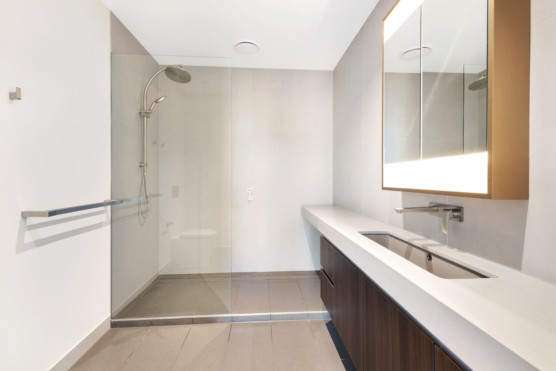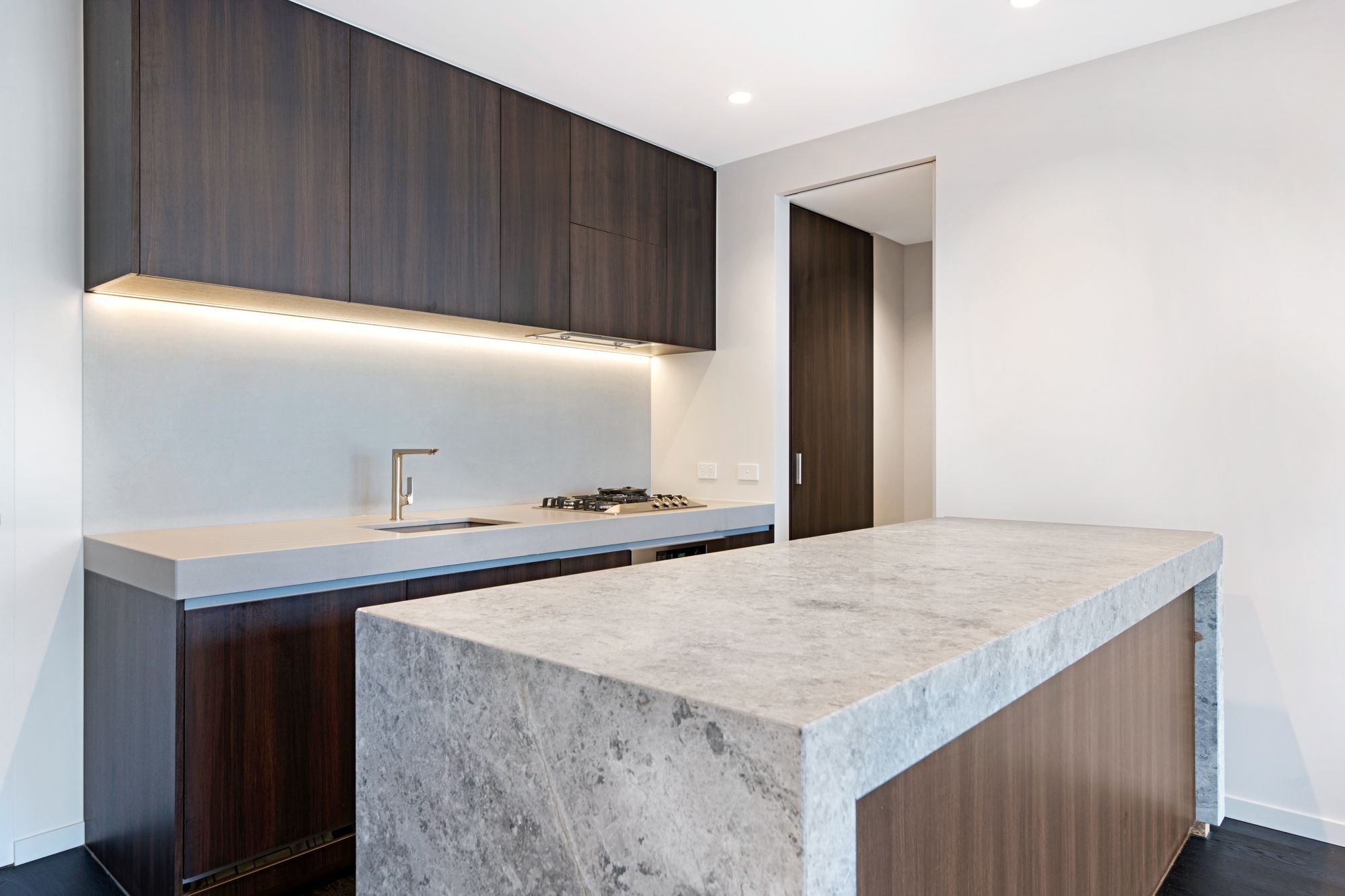 The apartment comes with natural stone bench tops, an integrated sink and crafted soft close joinery with Miele gas stove top, oven and dishwasher.