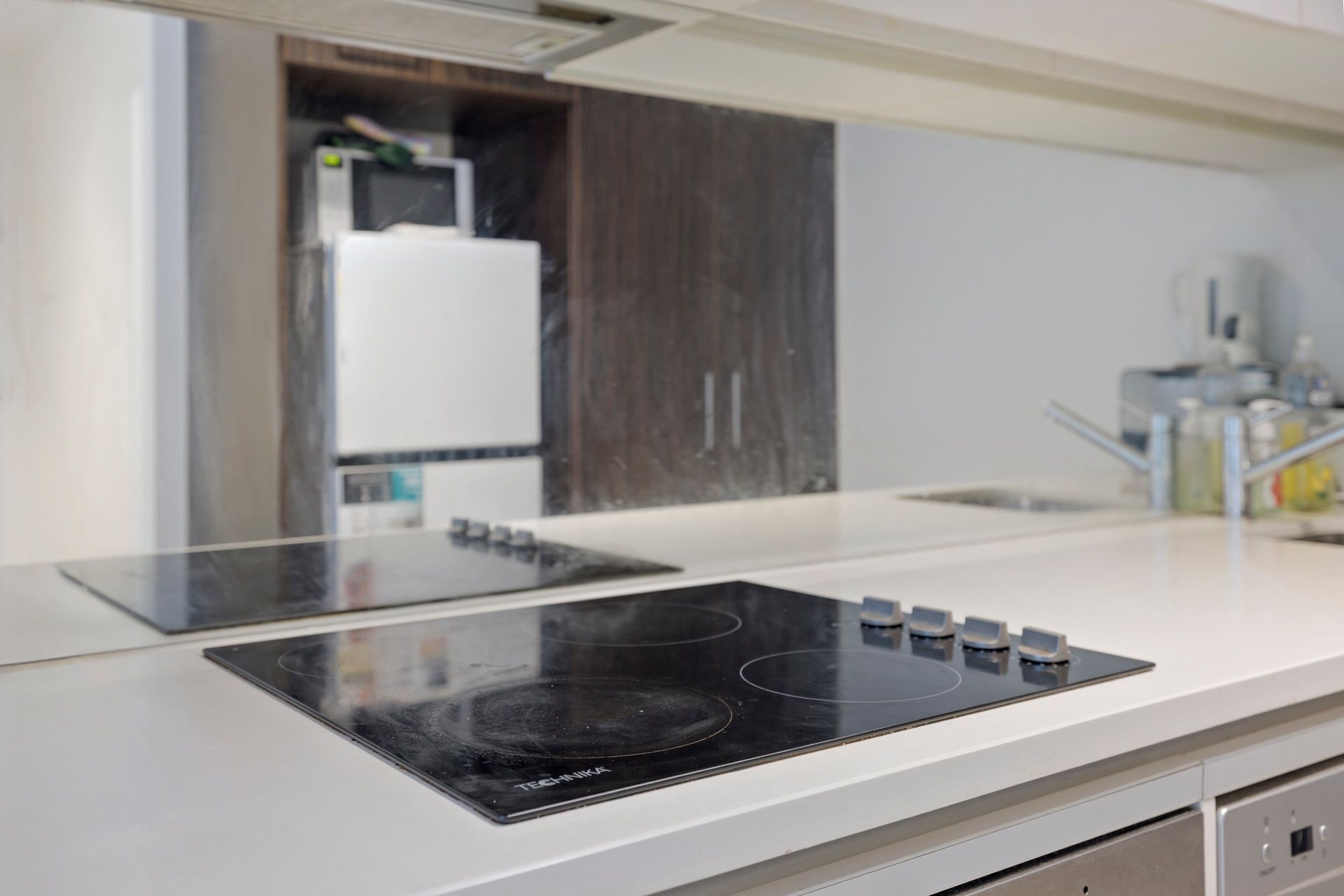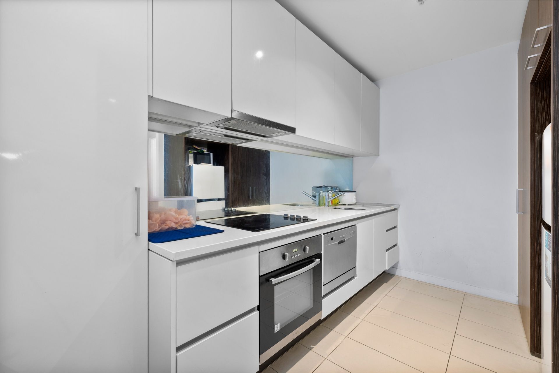 -Stylish stone-topped kitchen with stainless steel appliances, mirrored splashback, and ample storage