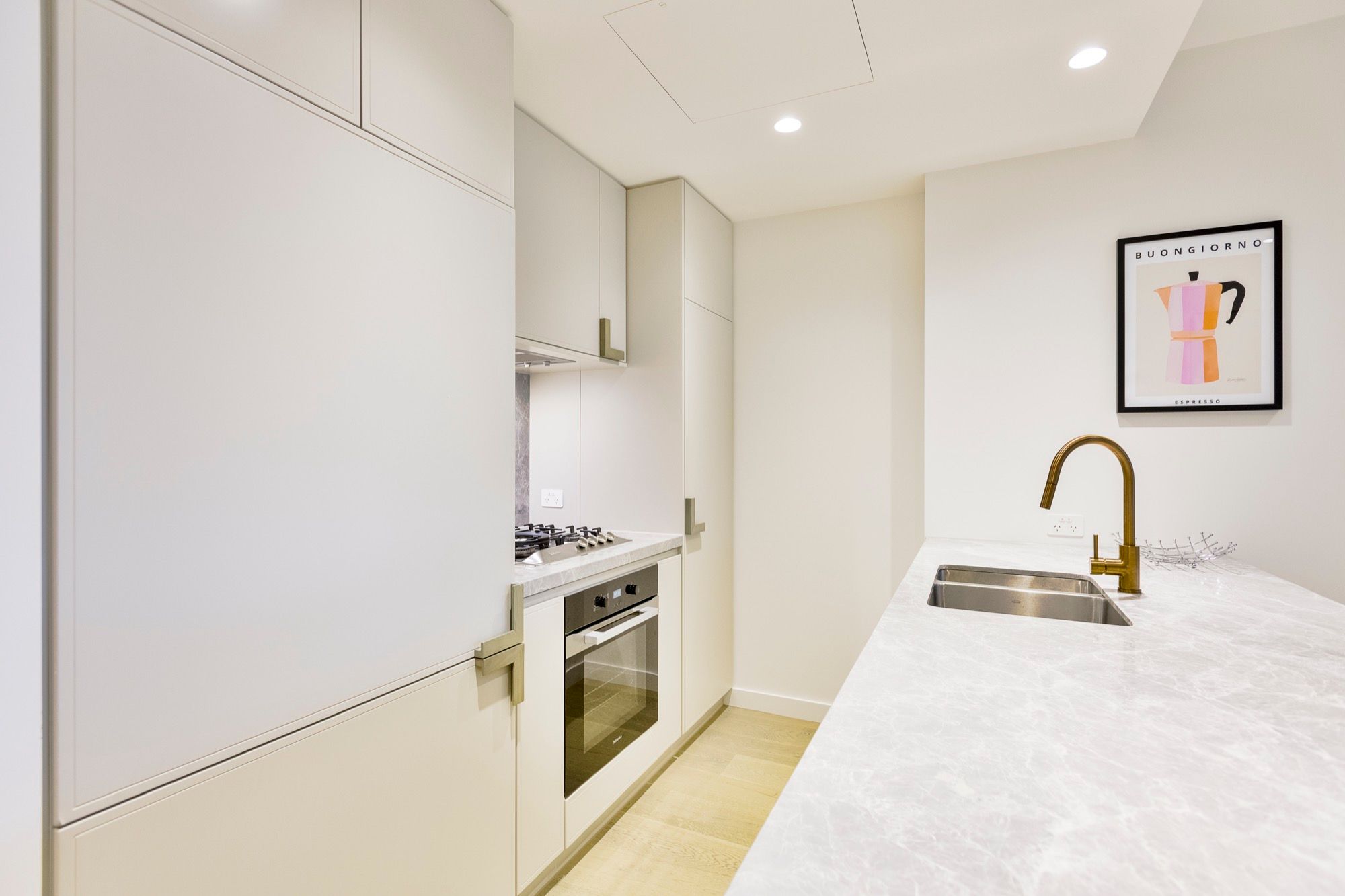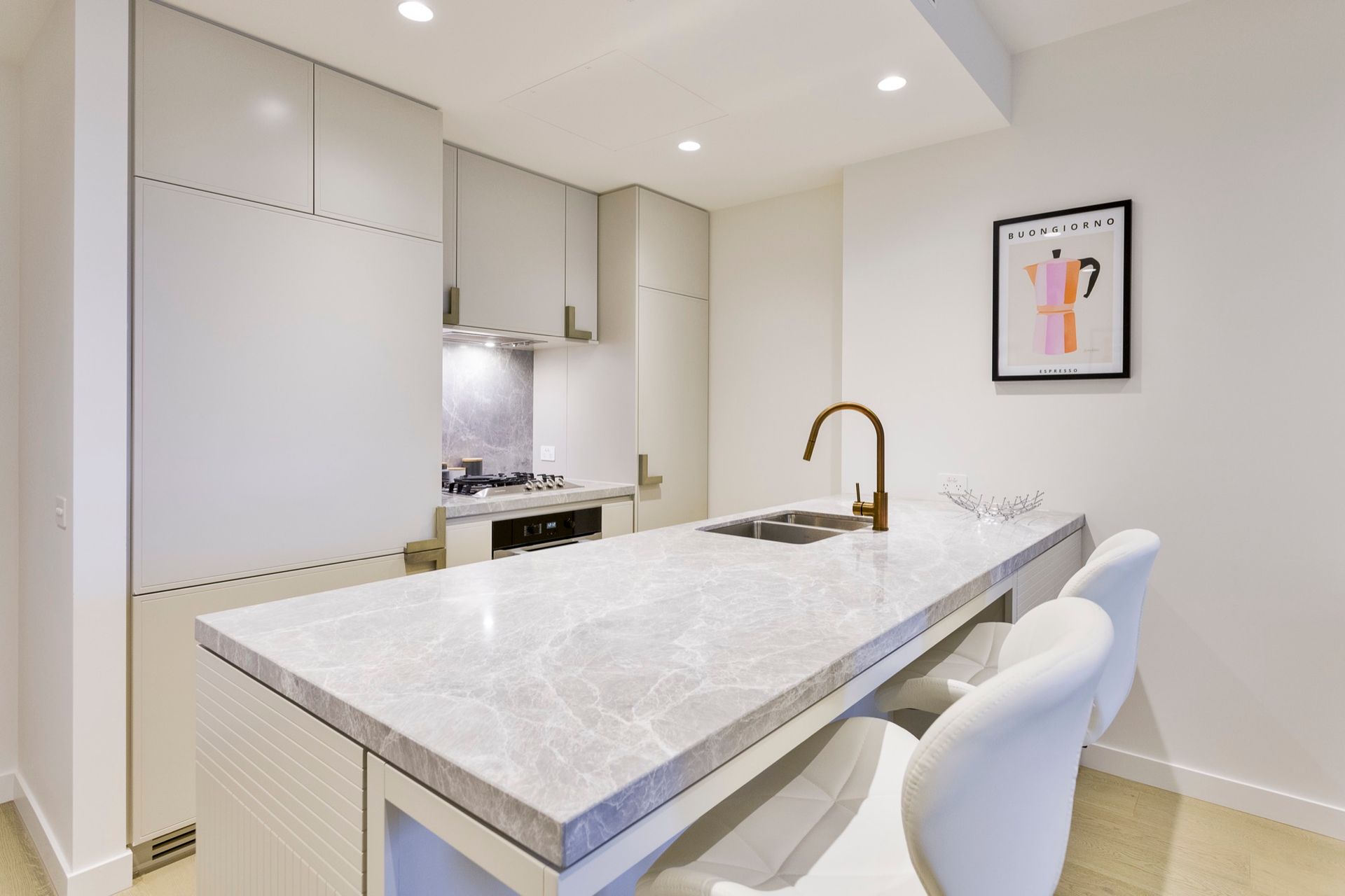 - Kitchen with stone benches, breakfast bar, brass tapware, Miele Appliances, integrated fridge and dishwasher