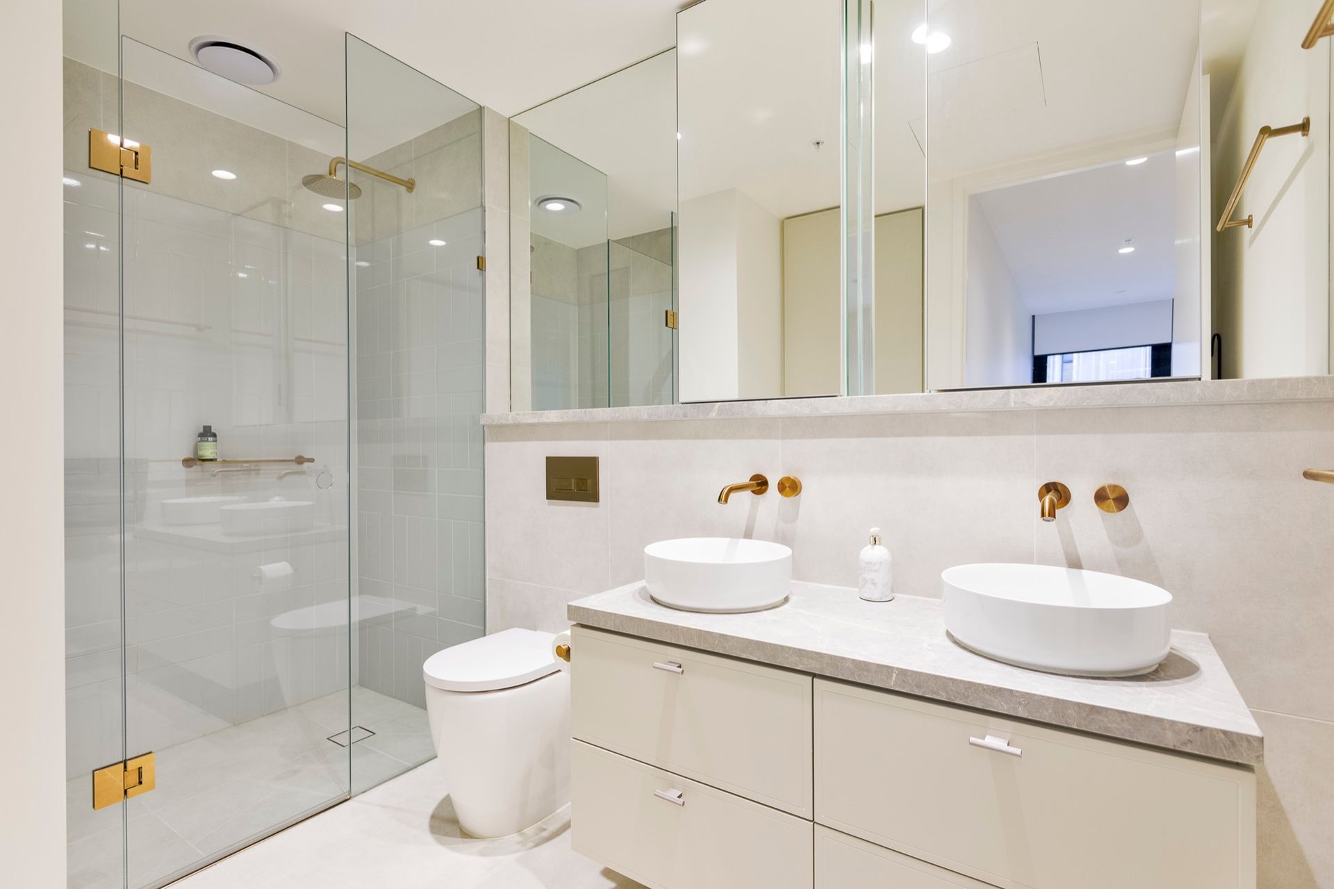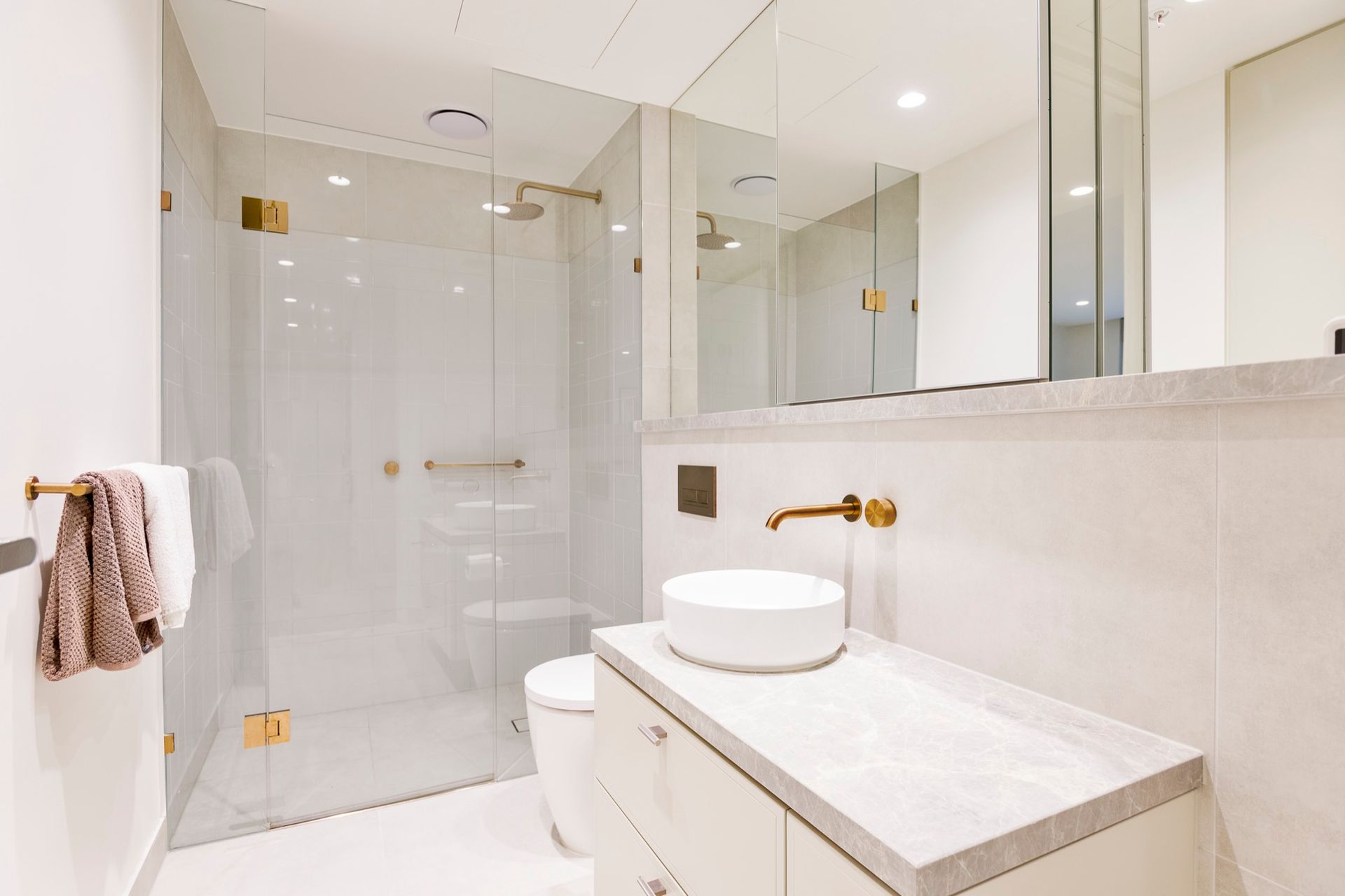 - Main bathroom with a large shower, brass fittings and stone benchtop