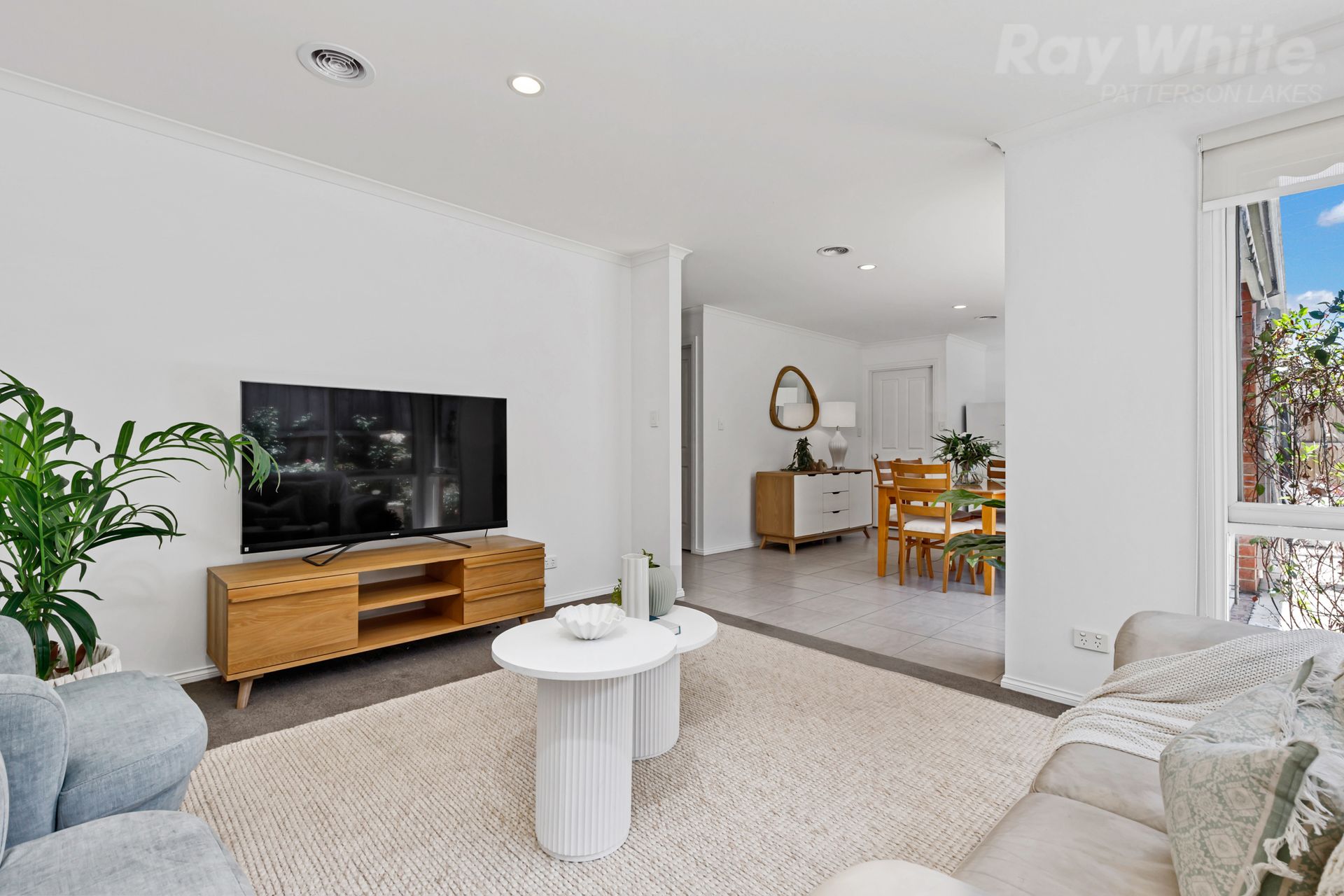 Inside, you'll find a practical floor plan with a spacious living area that seamlessly connects to the open-plan kitchen and dining space, perfect for entertaining or cozy family dinners. Large windows flood the area with natural light, creating a warm atmosphere.