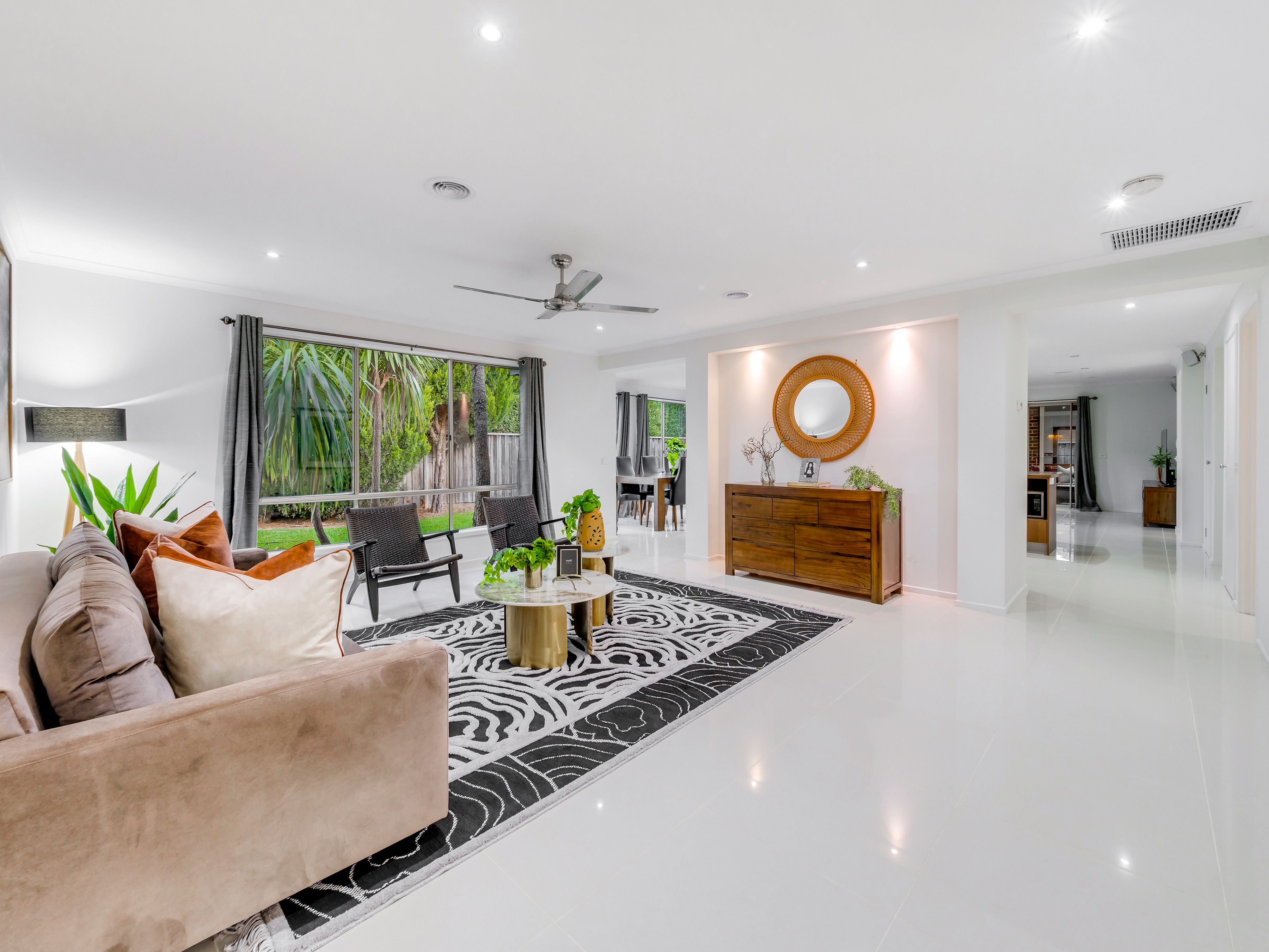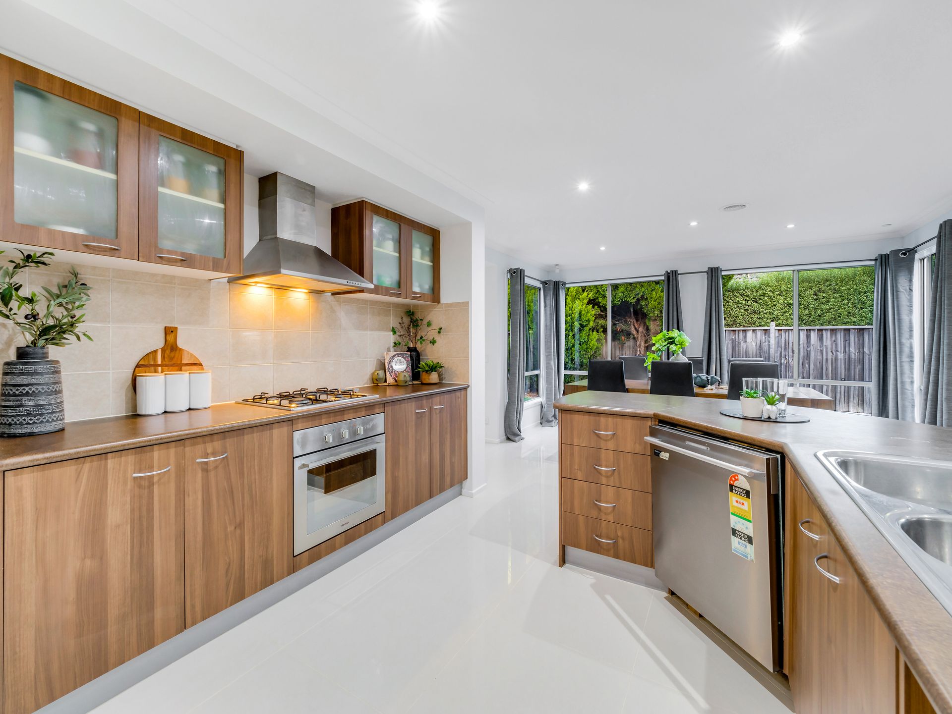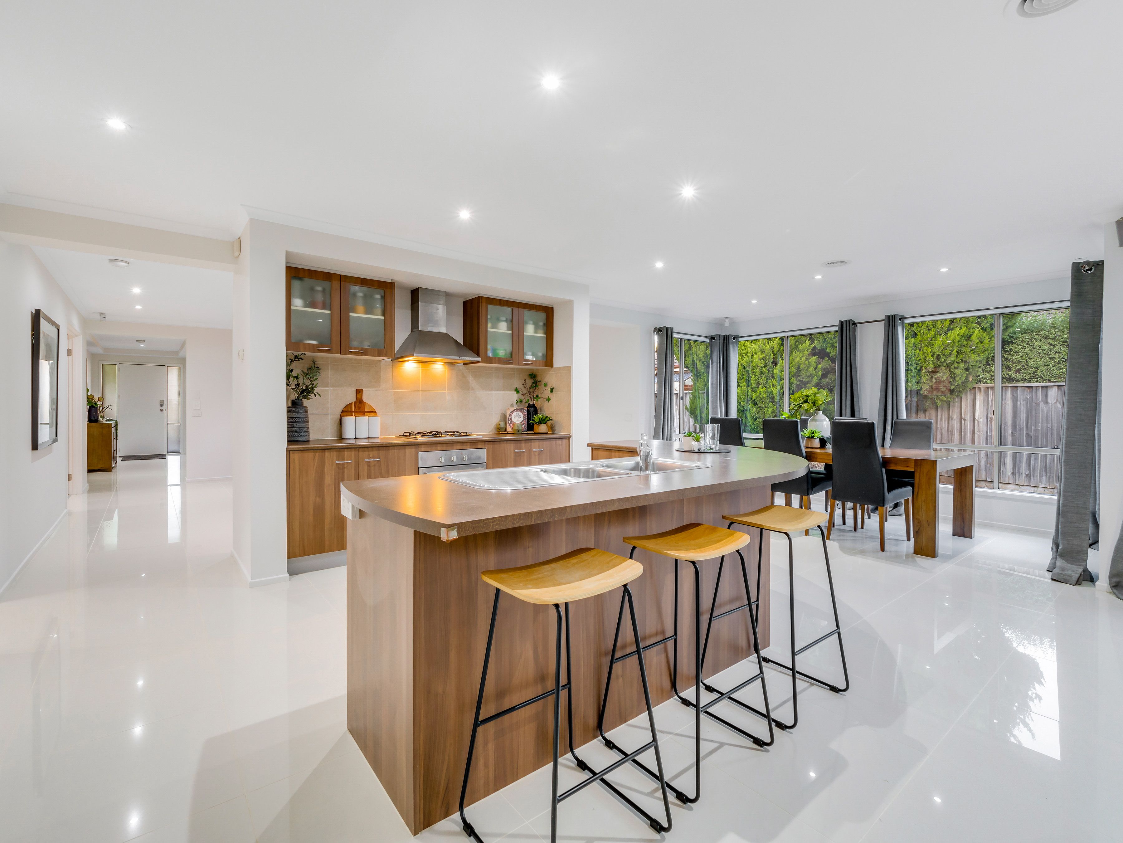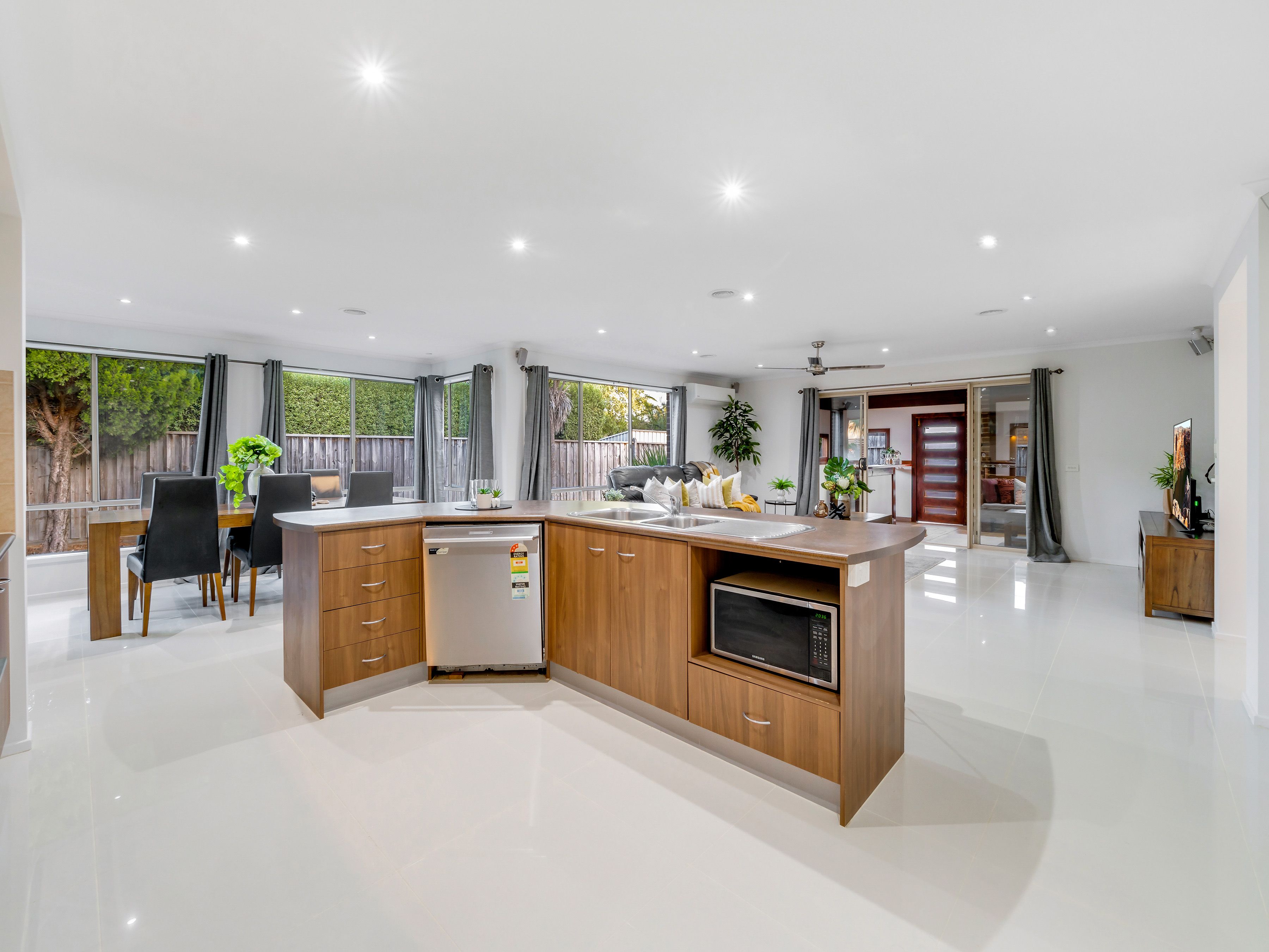 The kitchen seamlessly flows into the open-plan dining and living area, making it the heart of the home for family gatherings.