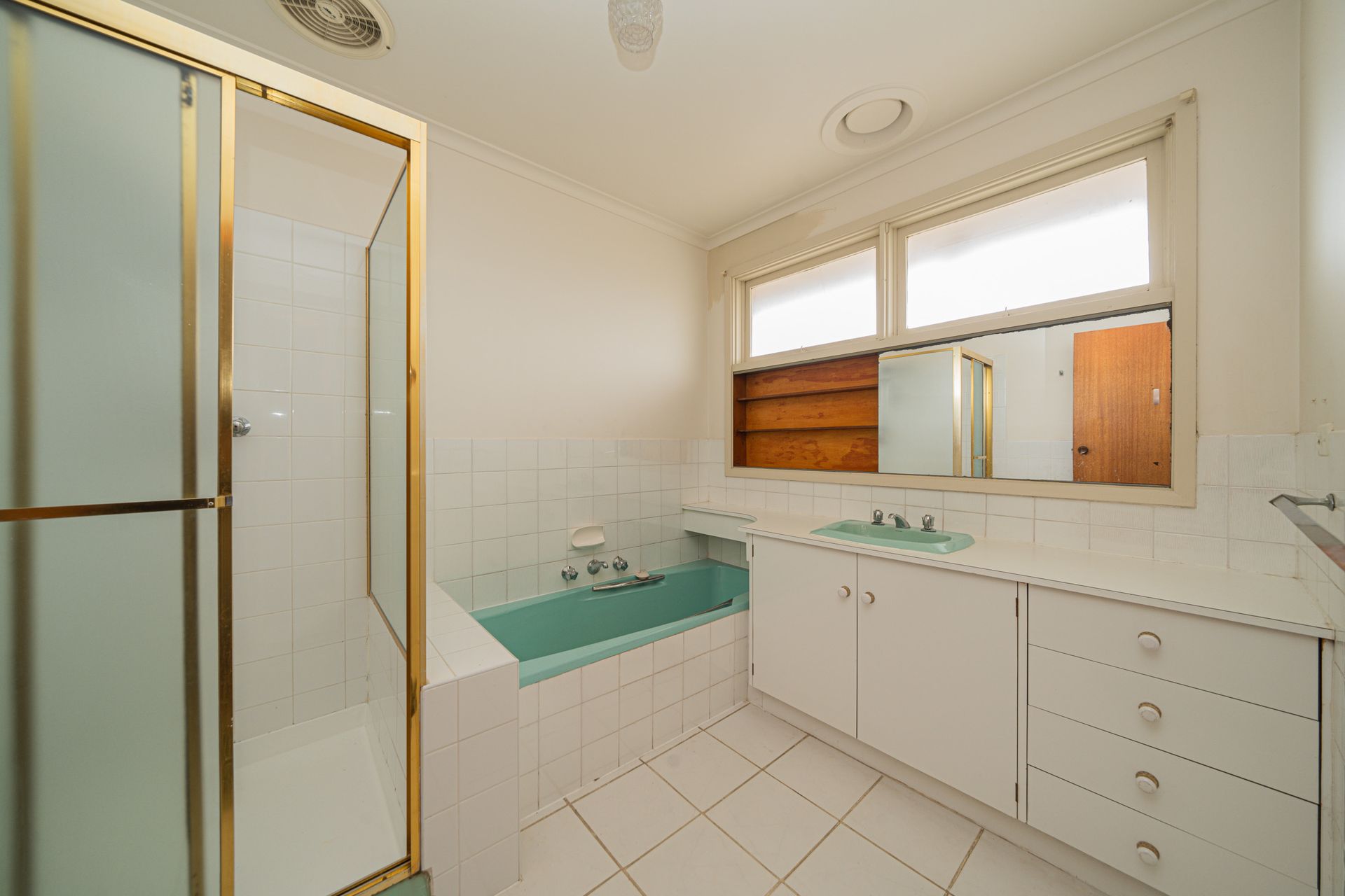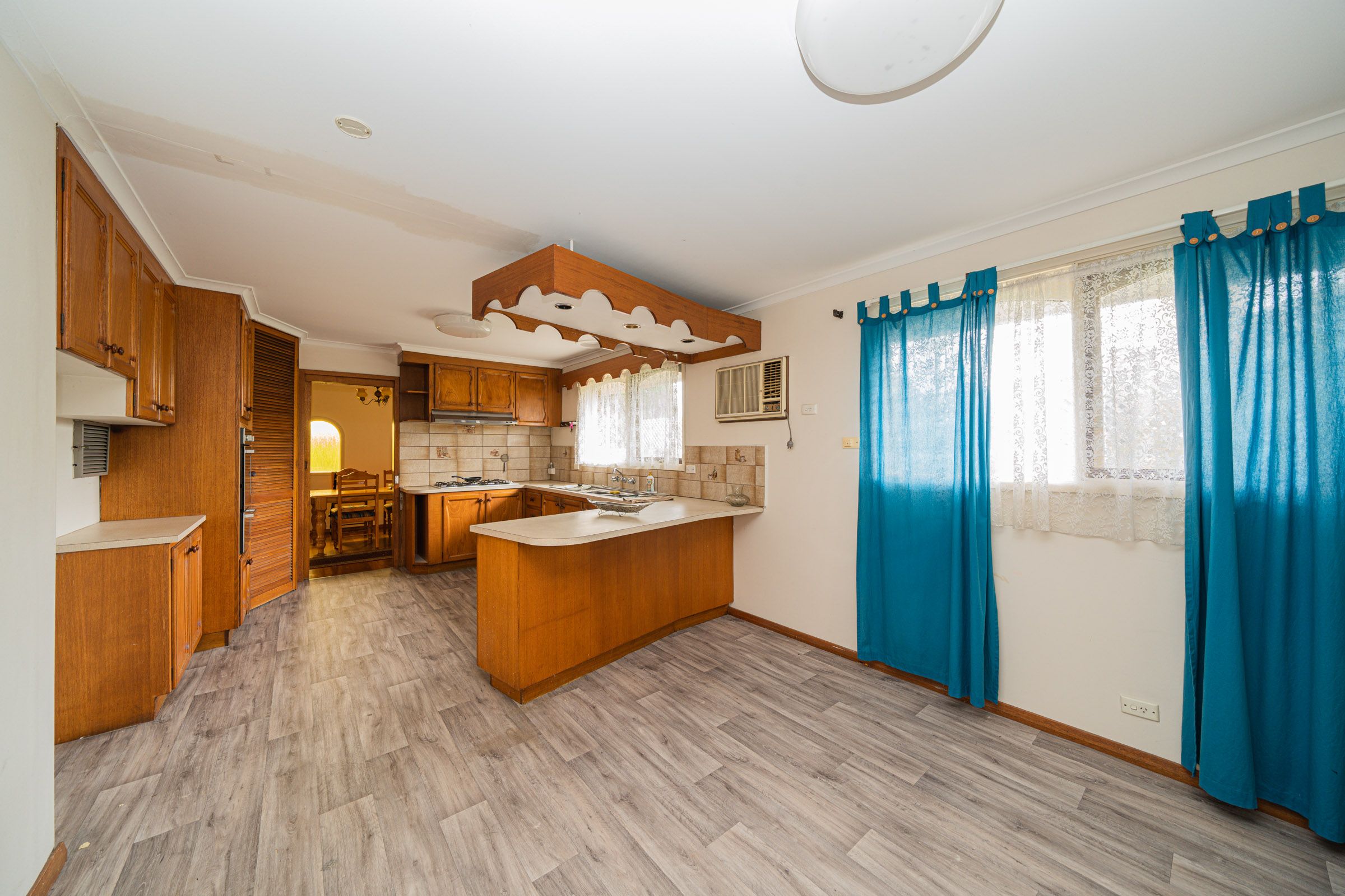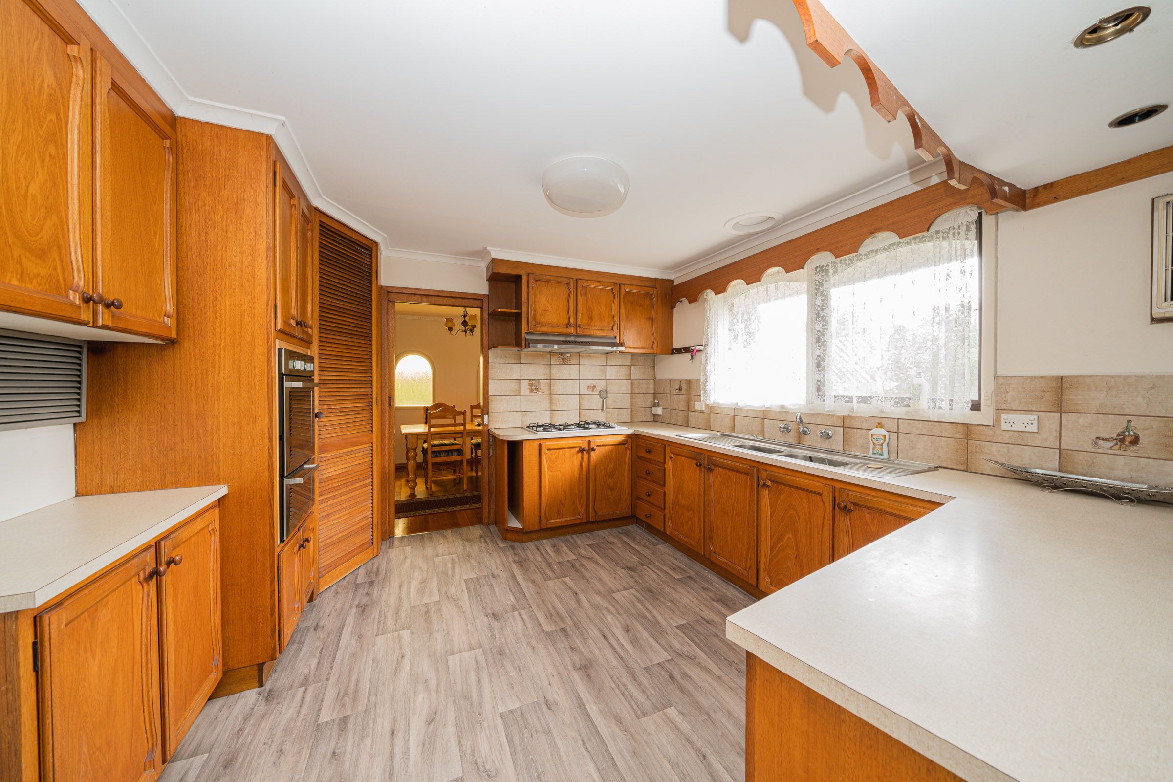 -Original timber kitchen cabinetry with ample storage space, gas cooktop, separate electric oven & grill, adjoining meals area.