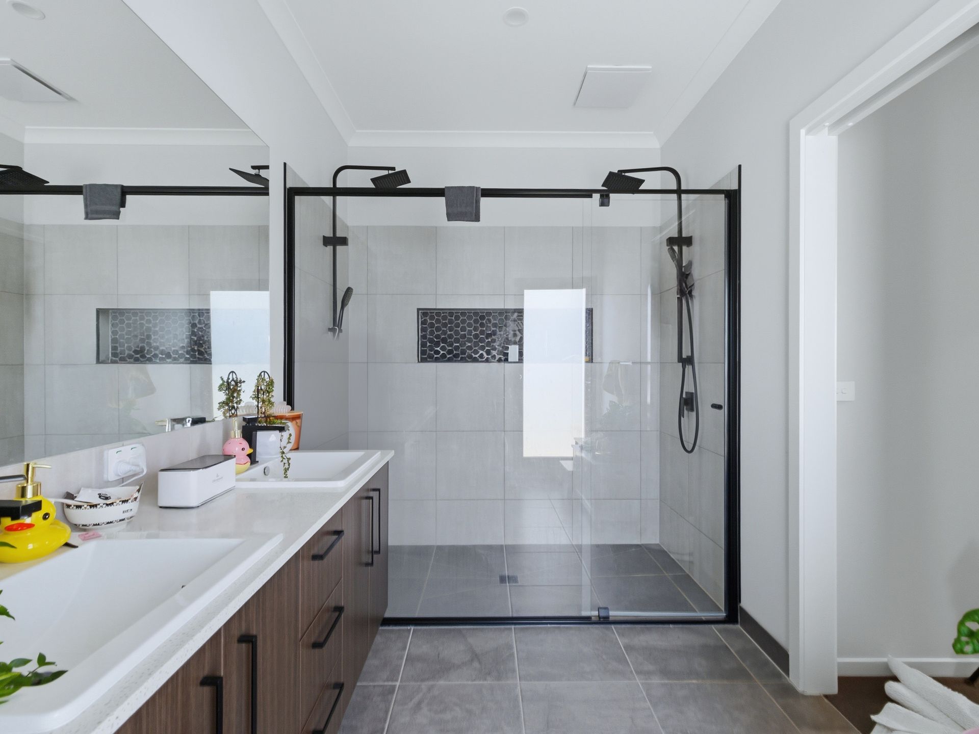 When it is time to retreat, the master suite offers a peaceful haven at the front of the home, boasting generous proportions, a walk-in robe, and a sophisticated ensuite with dual shower heads and modern black tapware. The three additional bedrooms are tucked away in their own space, each featuring built-in robes and easy access to the central family bathroom, which impresses with a deep freestanding bathtub and a large walk-in shower.