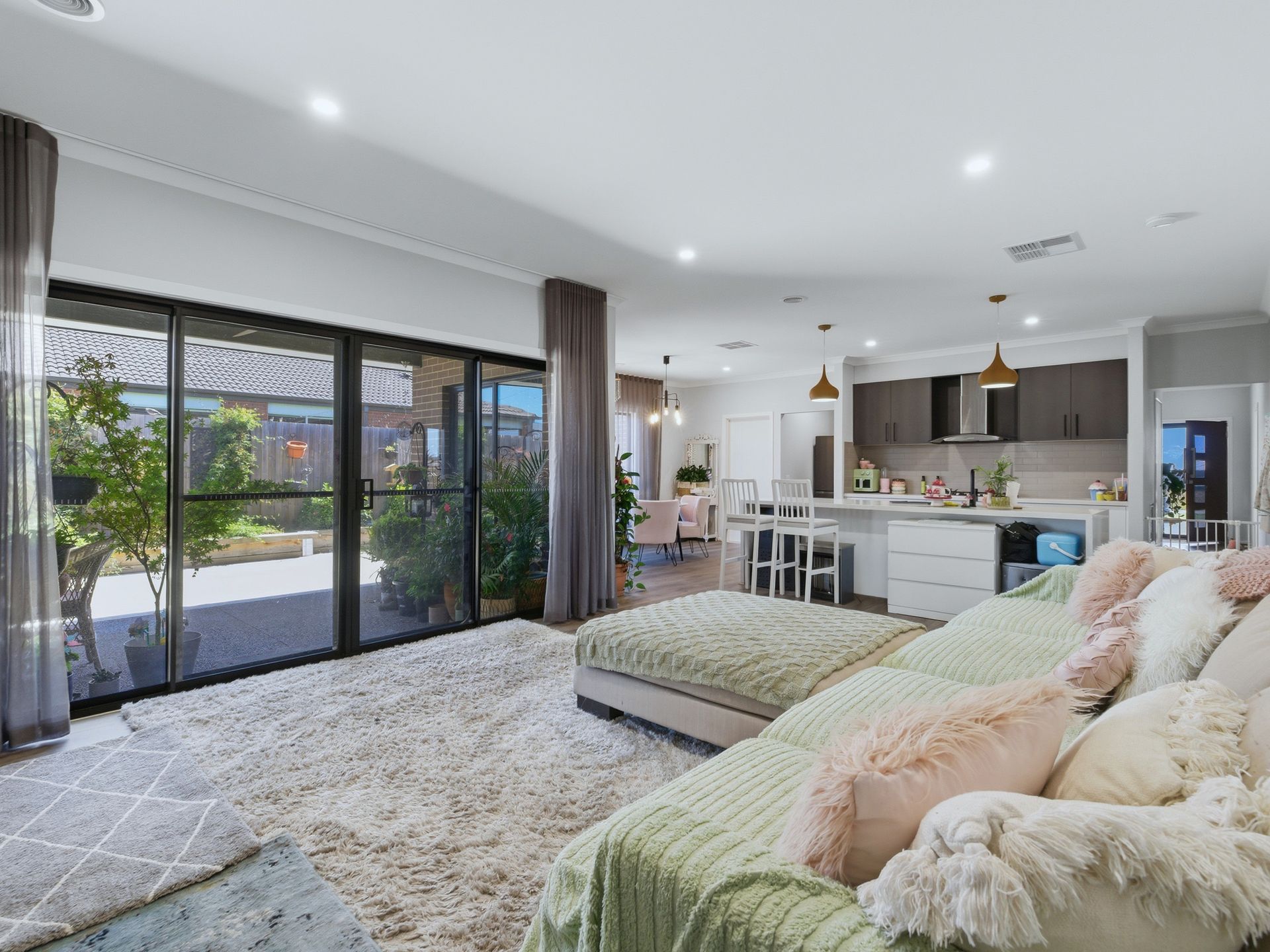 Stepping through the wide entry foyer, you are immediately greeted by the first of three living areas, a light-filled formal lounge that offers a quiet sanctuary away from the main hub of the home.