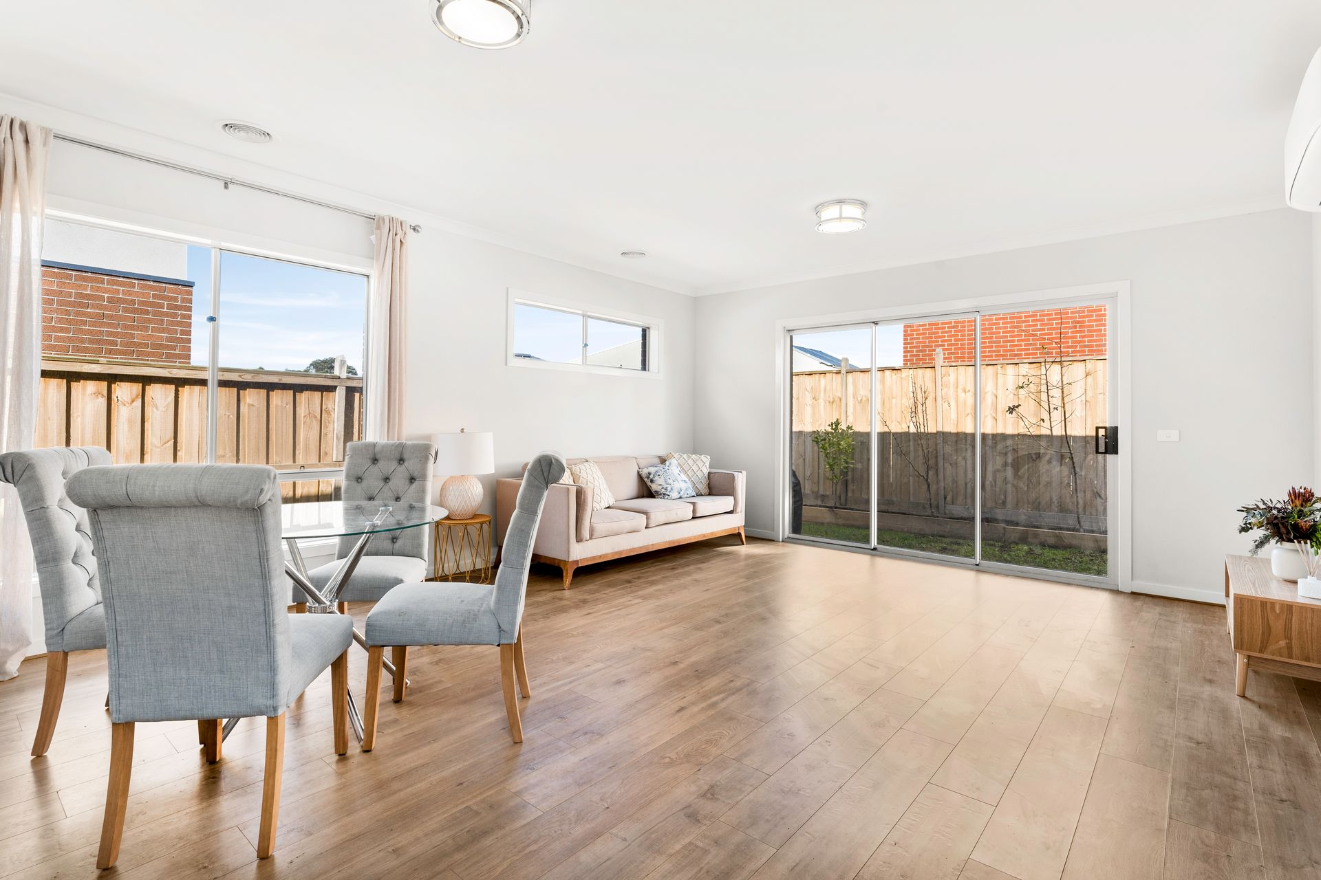 Modern open plan living and dining area with air conditioning
