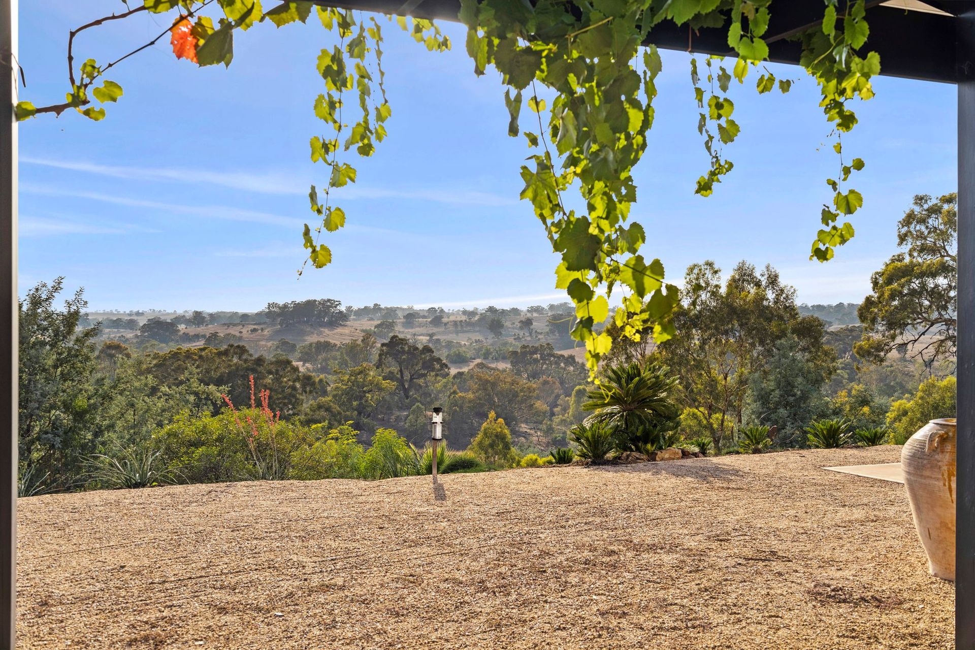 The grounds, curated by renowned landscape architect Philip Stray, blend resilience with beauty. Thoughtfully placed Cycads, Palms, and Prostrate Casuarinas thrive with minimal intervention, supported by an automated irrigation system fed from a 90-metre solar bore servicing the gardens. The result is a flourishing ecosystem providing a home to native birds, wombats, echidnas, and kangaroos. A lower terrace, ideal for vegetable growing, adds yet another dimension to this self-sustaining retreat.