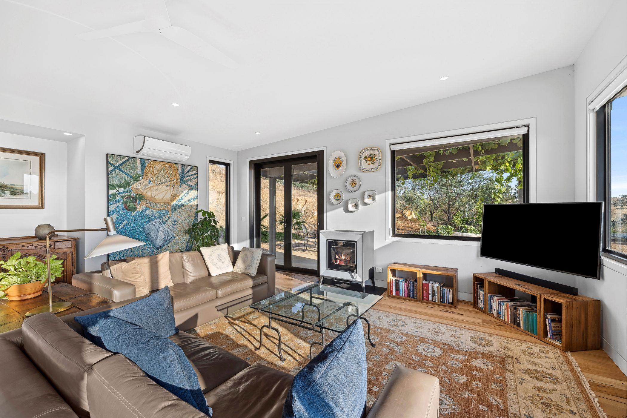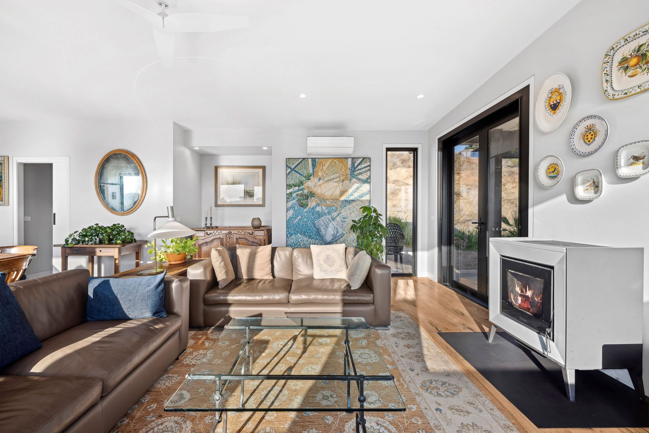 Designed to embrace its landscape, the home is orientated to capture panoramic views across the dam and valley, uninterrupted by development. An east-facing wall of glass floods the interior with natural light, while double glazing and full insulation maintain an ideal indoor climate. For cooler months, an Italian Piazzetta automatic wood pellet fire can be remotely activated, ensuring a warm welcome on arrival. The home features automated blinds throughout for an ease of living.