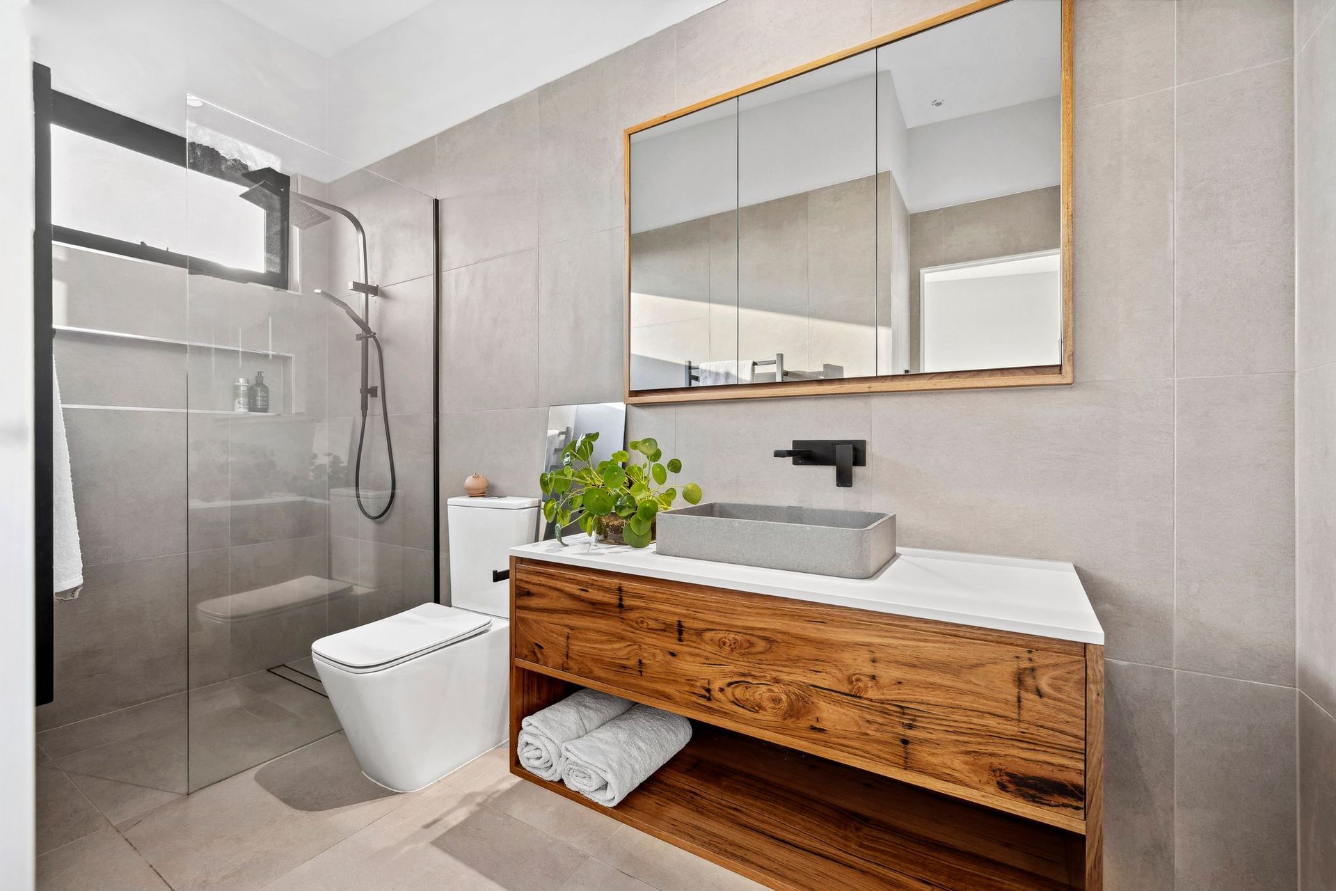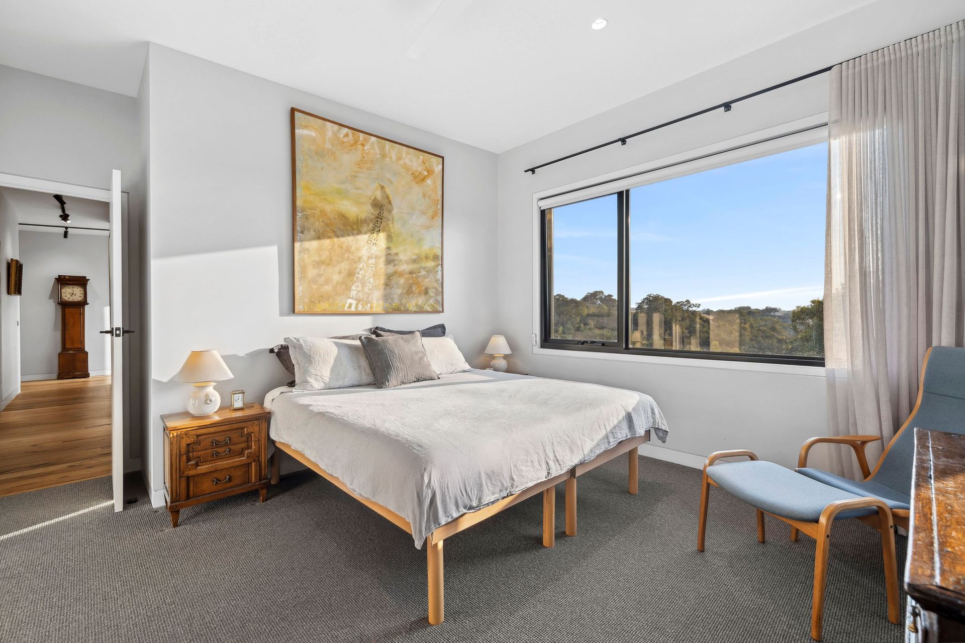 Inside, the material palette is warm, refined, and deeply connected to its surroundings. Expanses of Victorian Wormy Chestnut flooring, with its distinctive dark markings extend through the living areas mirroring the natural tones of the environment. Custom-crafted elements, including a built-in office desk and window seat with integrated storage showcase the home's thoughtful design.