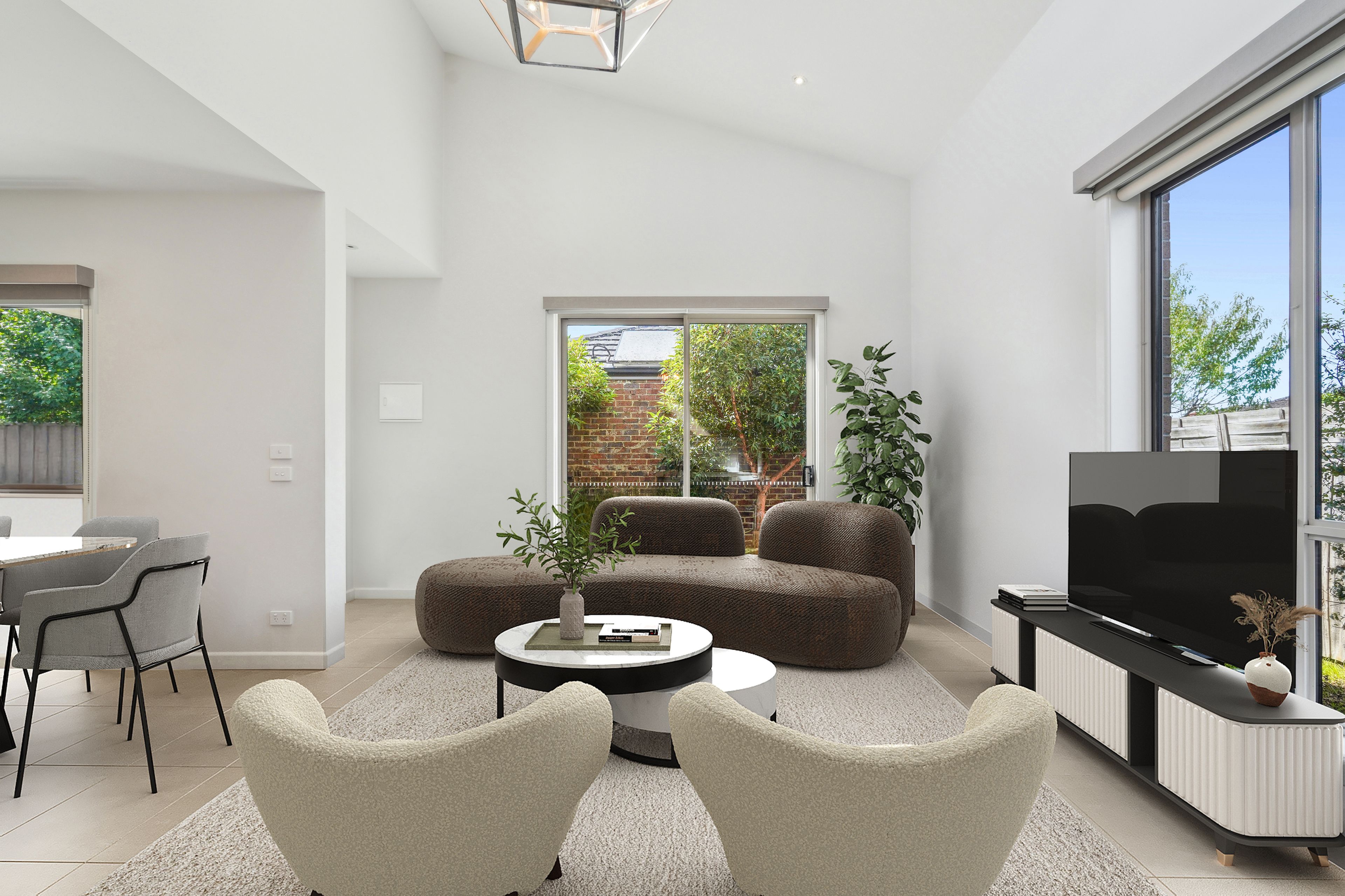 The modern open-plan living area invites you to unwind, with an abundance of natural light that creates a warm, welcoming atmosphere. Whether you're enjoying a quiet evening in or entertaining friends, the space offers the perfect setting for all occasions.
