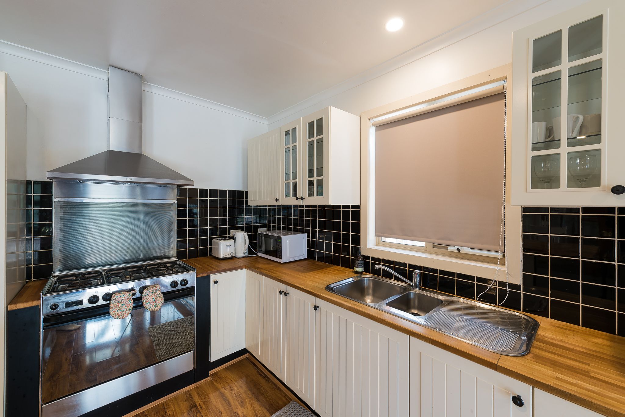 new dishwasher, stainless gas stove, oven and range-hood. Easy clean wood effect laminate