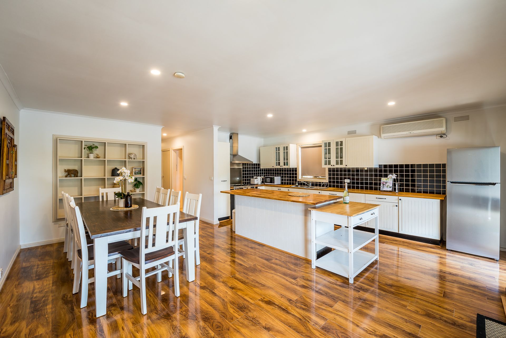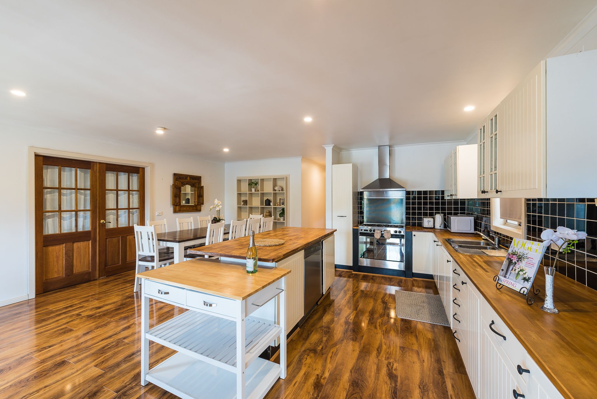 • Country style kitchen with large dining area. Fully equipped with timber work surfaces,