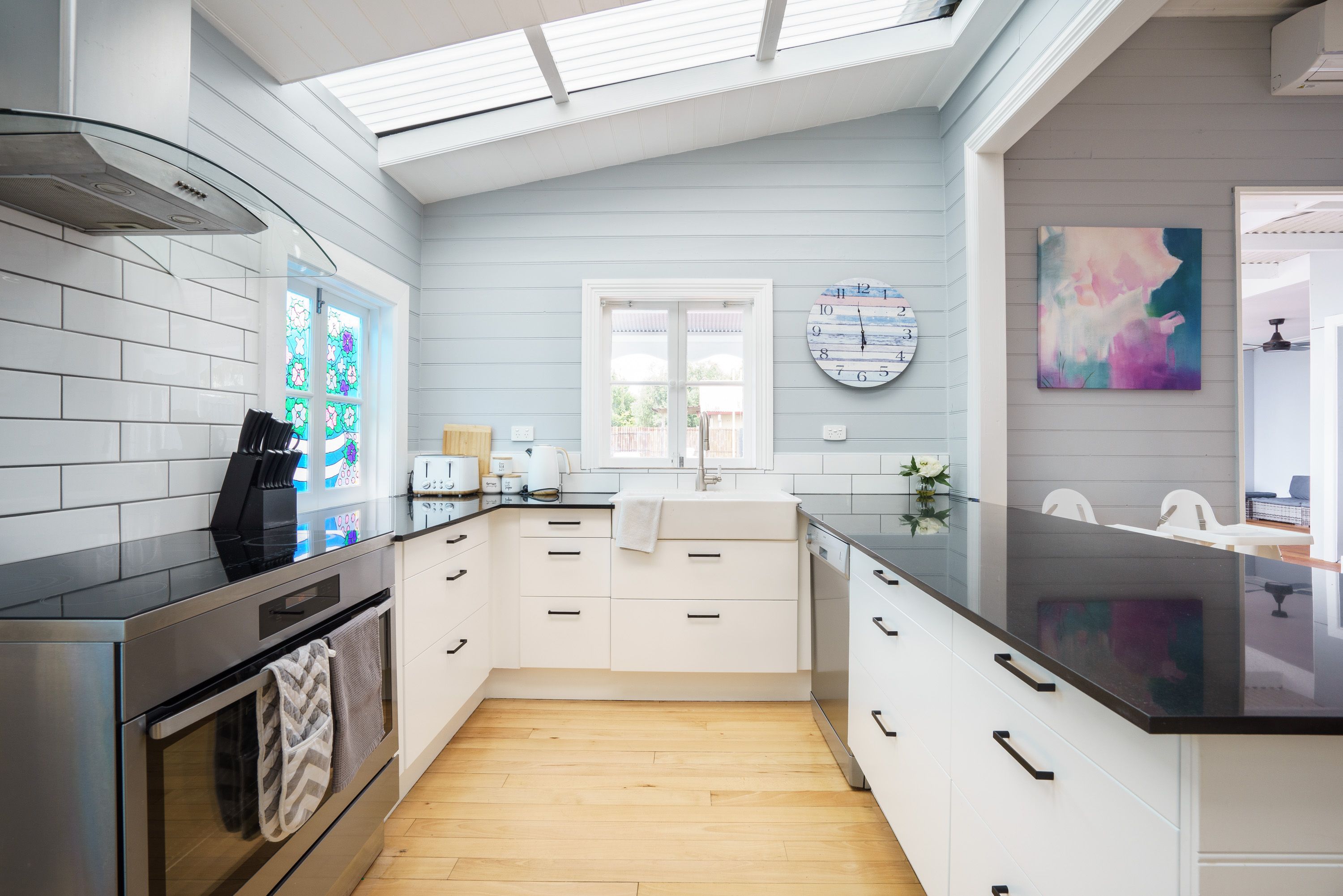 The fully equipped kitchen features smooth stone surfaces, subway tiling, custom cabinetry, sky lights and premium appliances.