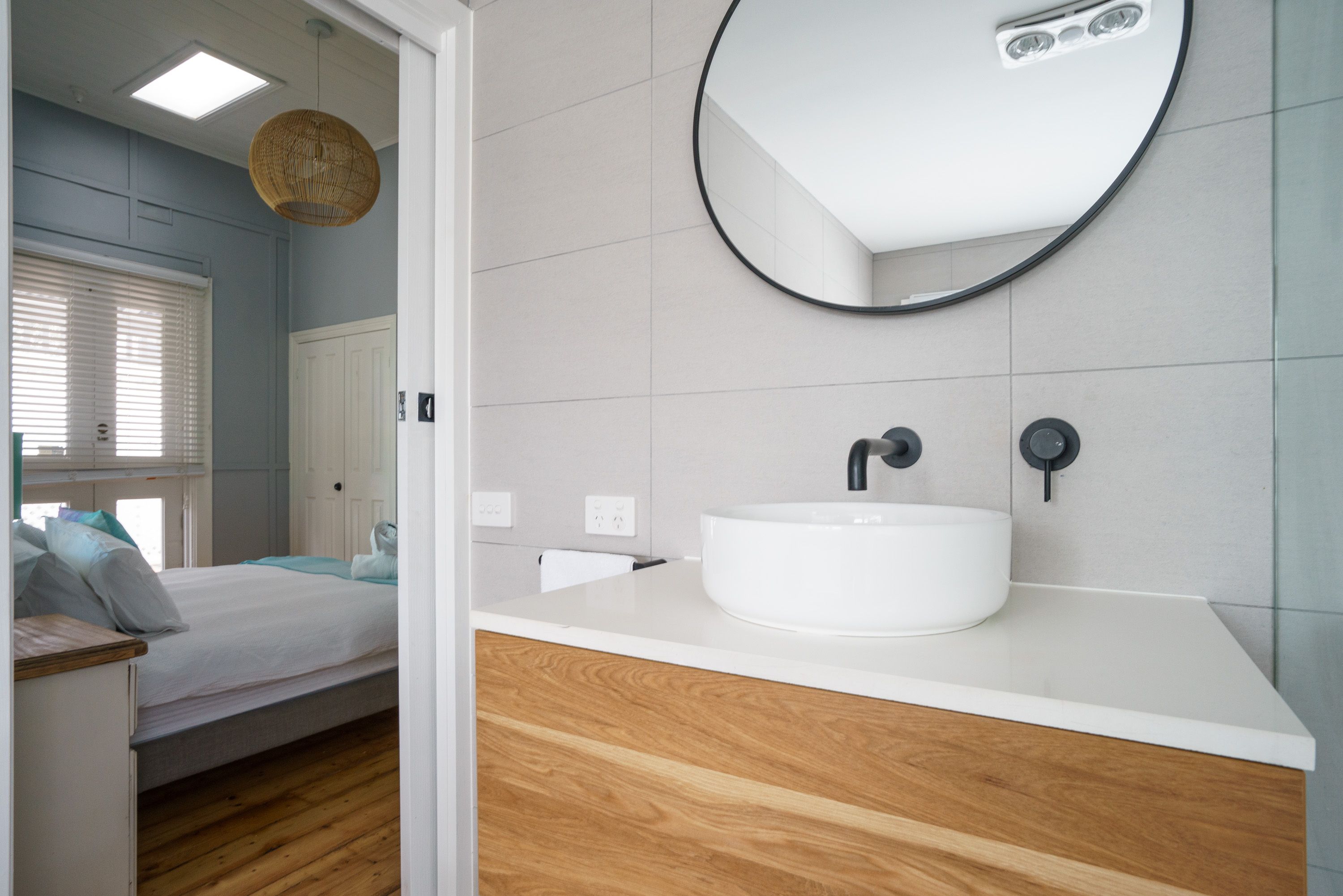 Located at the front of the home with private veranda access, a large primary bedroom suite comprises built-in robes and an ultra-modern ensuite featuring floor-to-ceiling tiling, spa bath, walk-in shower, black fixtures and fittings and a stone vanity countertop.