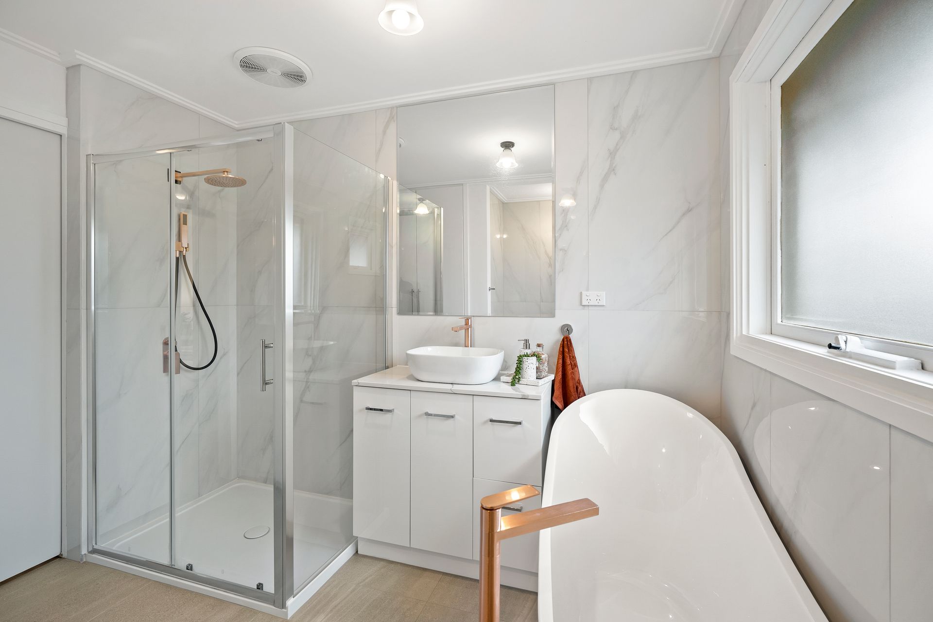 • Deluxe main bathroom with elegant freestanding bath