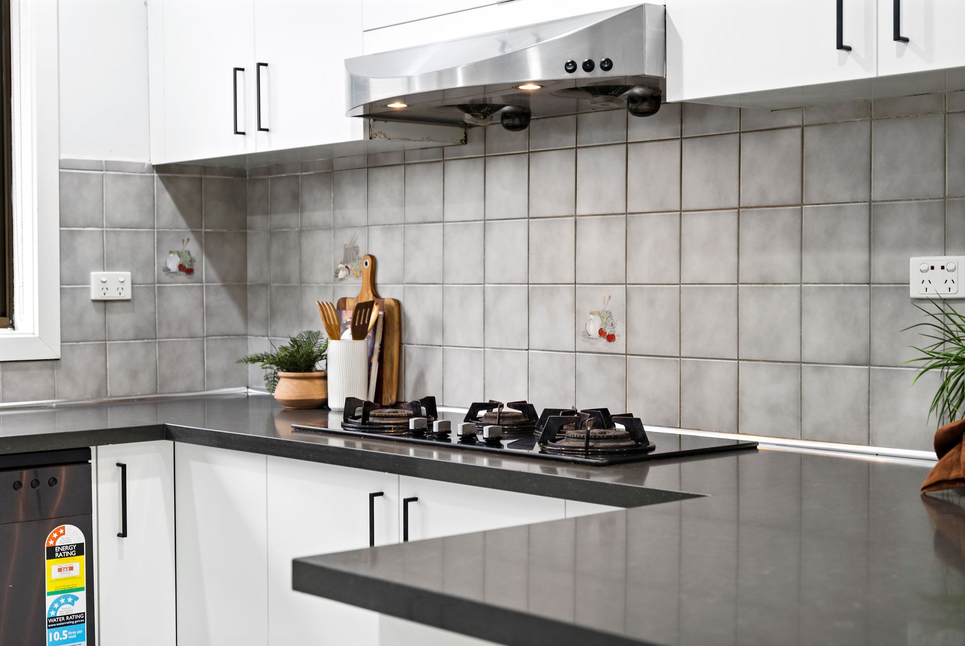 • Kitchen featuring stone benchtops walk in pantry and tiled splashback