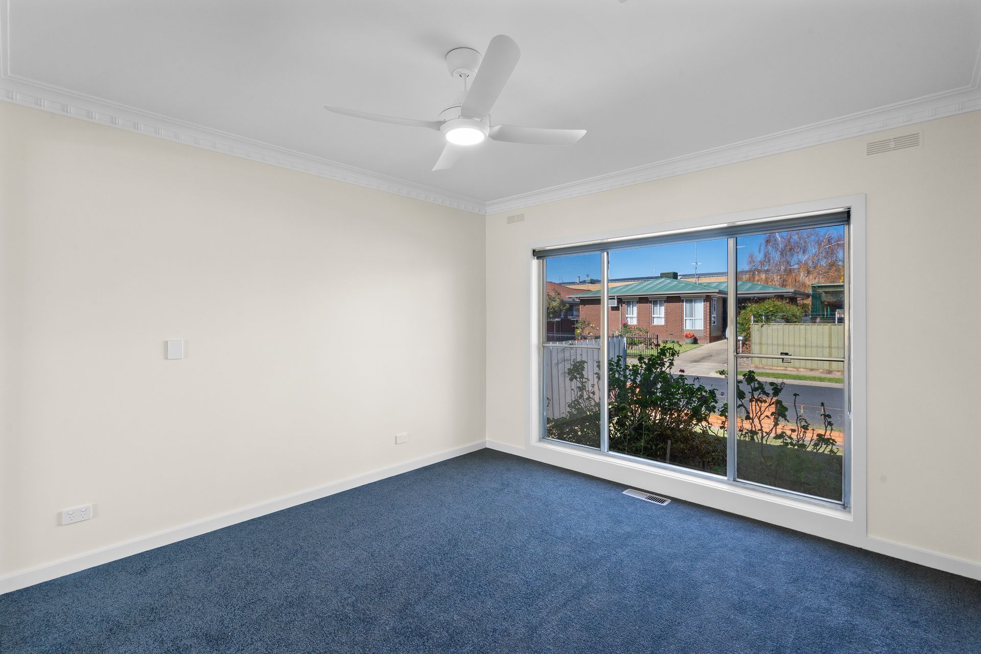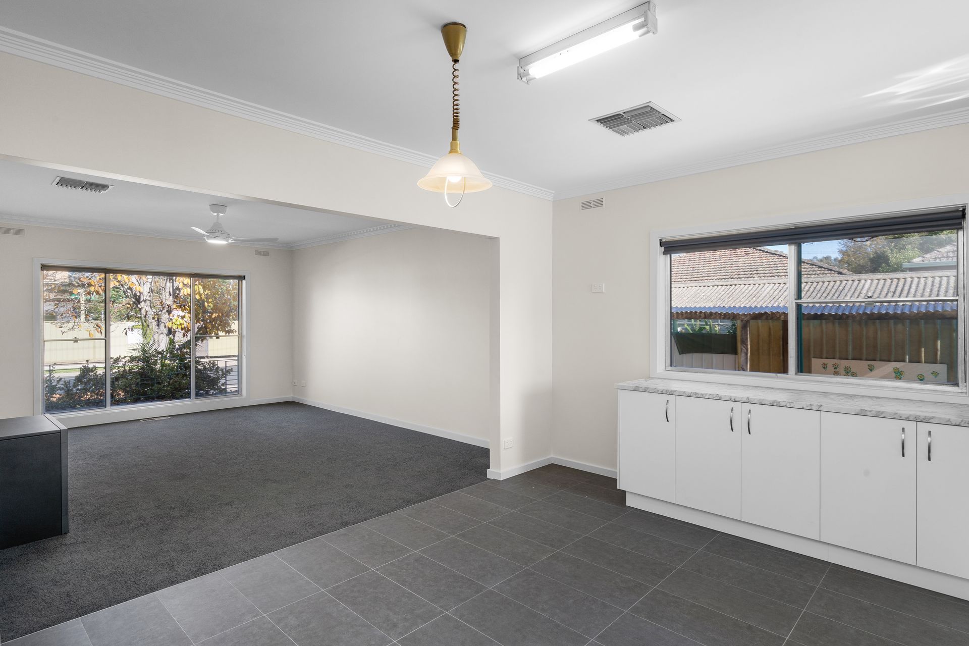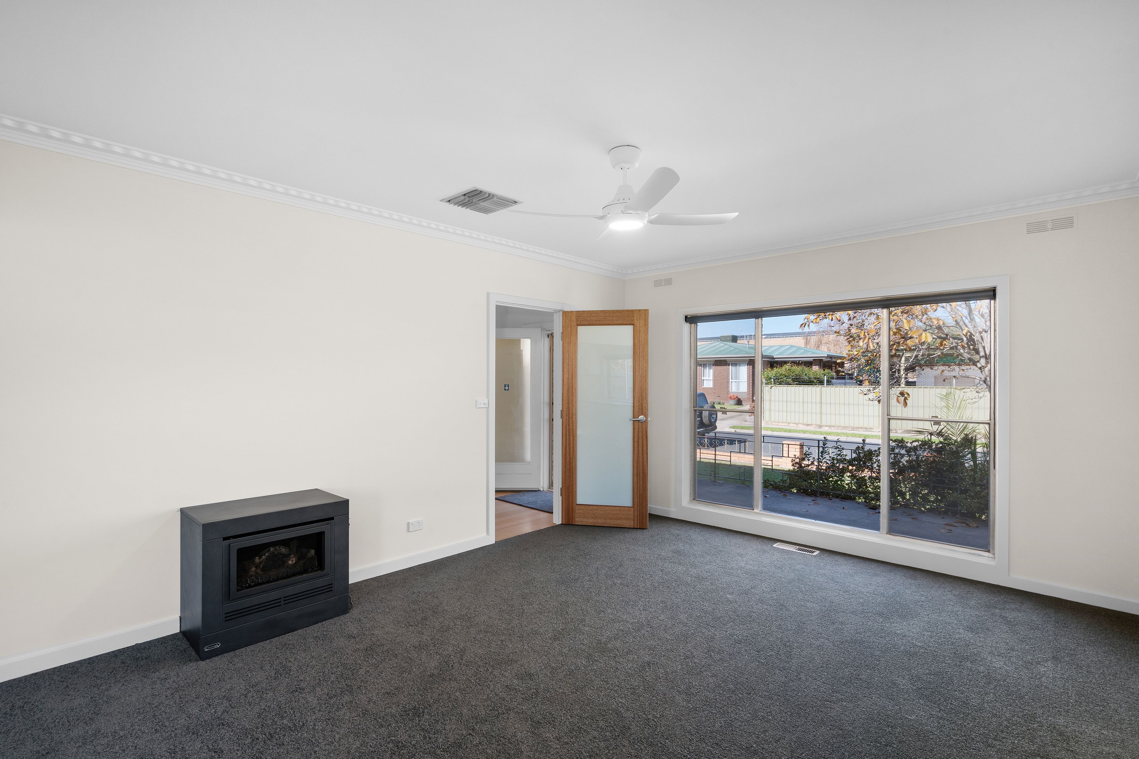 Step into the freshly carpeted lounge, offering a tranquil garden view through large windows, leading seamlessly to an open plan living area anchored by a cozy gas fireplace. The modern kitchen and bathroom add contemporary flair to the home.