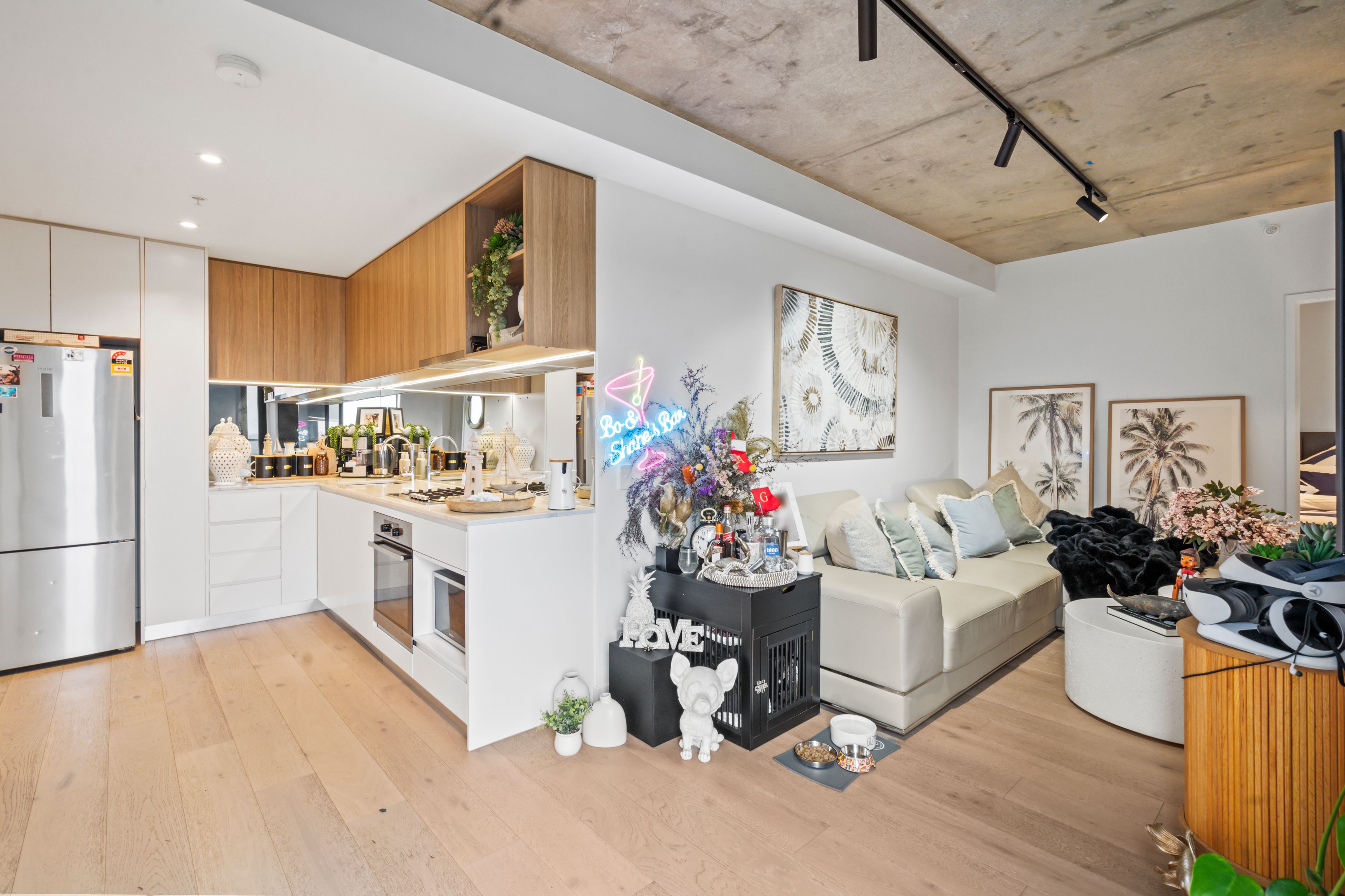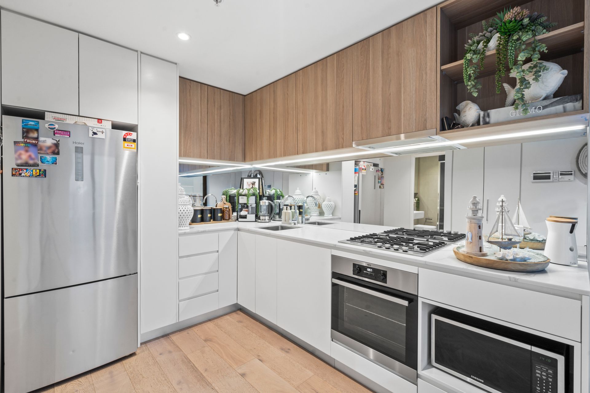 • Modern kitchen with LED lighting, gas cooktop, stainless steel appliances & dishwasher.