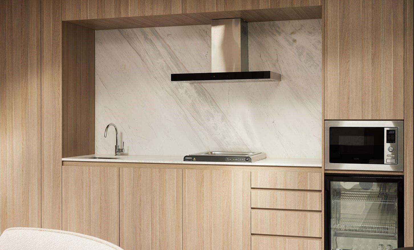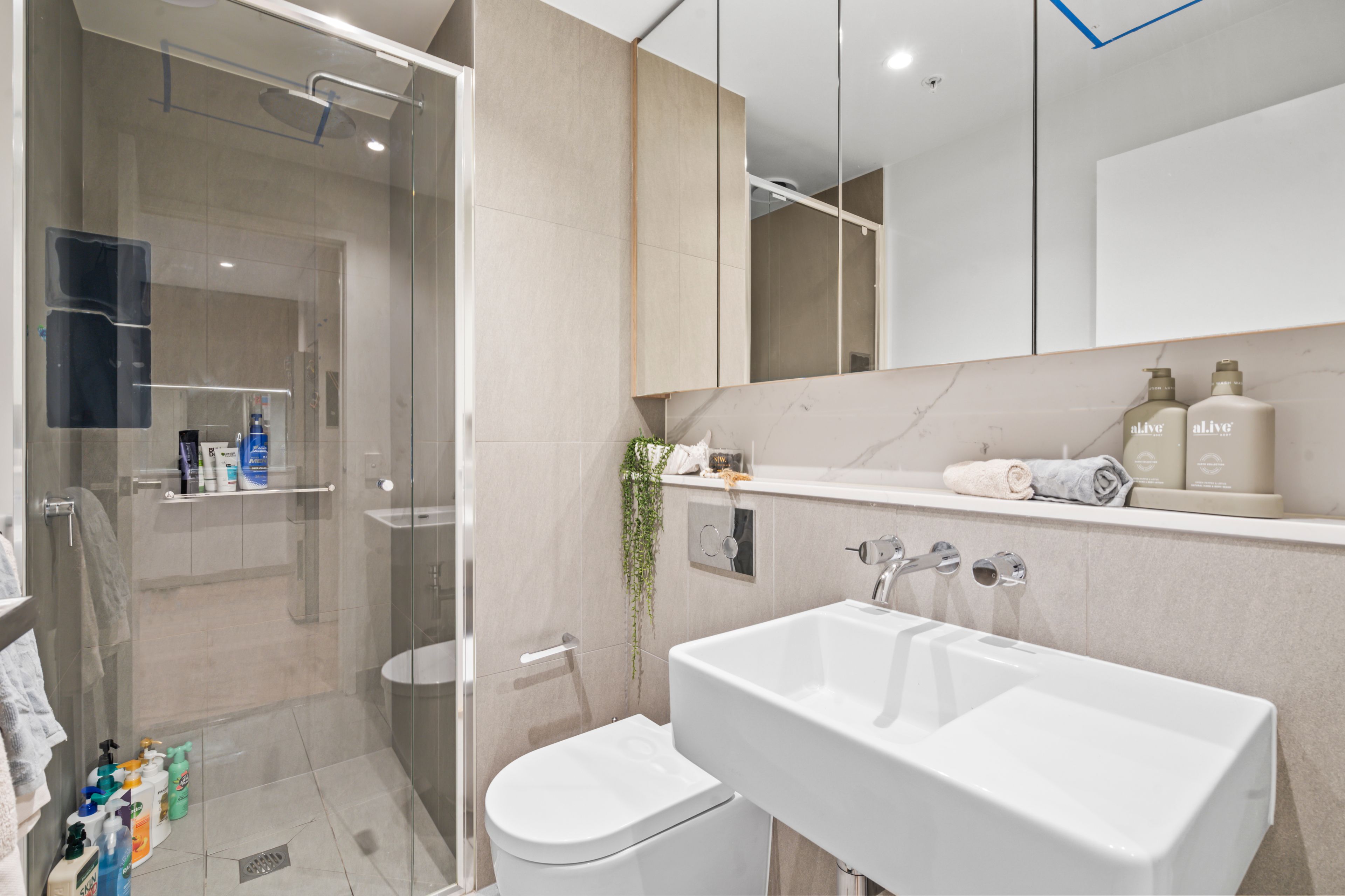 • Stylish bathroom with waterfall shower head and ample storage.