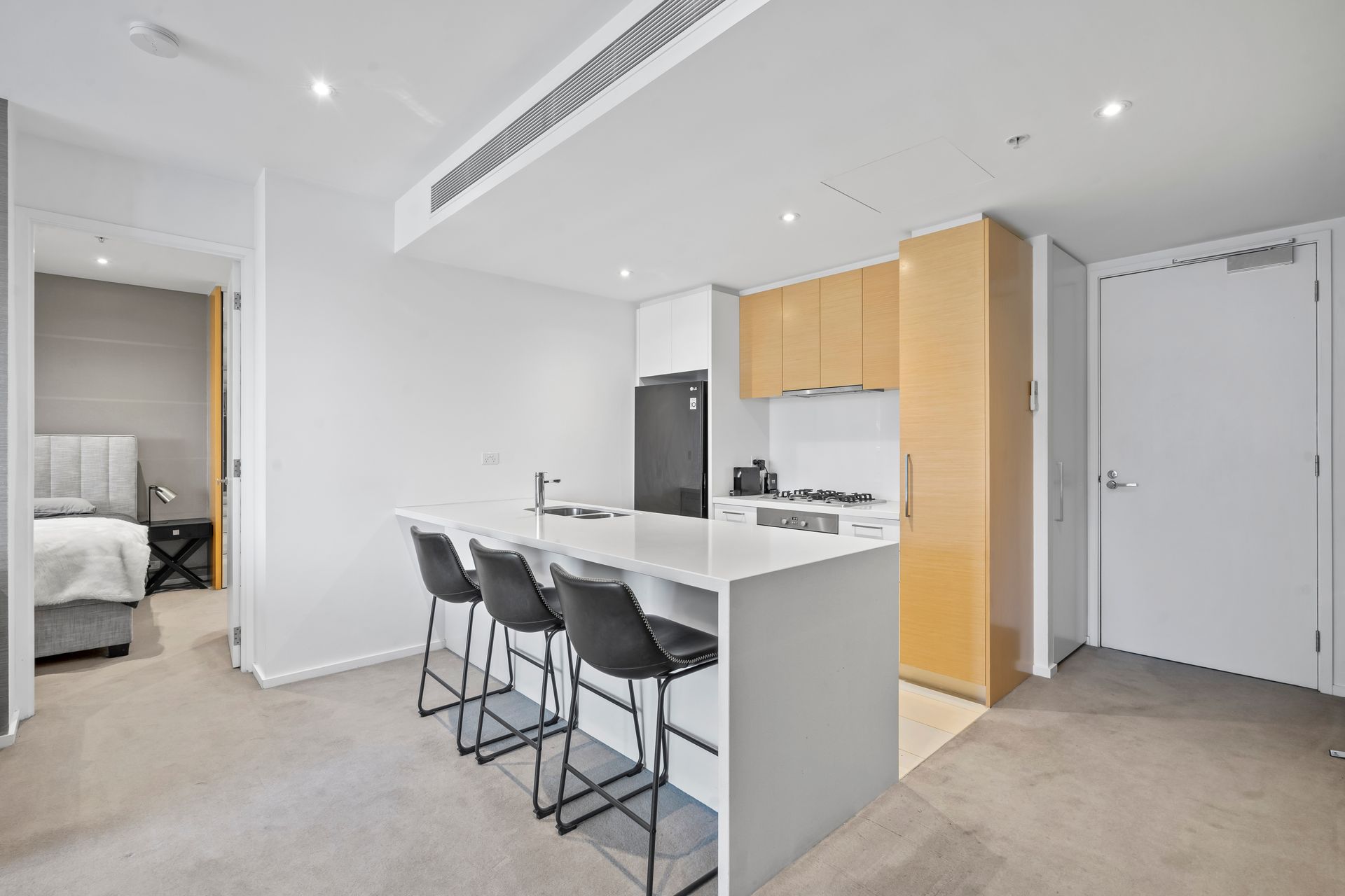 The residence features a sleek stone kitchen with premium Miele appliances, 2-Pack white and timber veneer cabinetry, and a chic central bathroom with elegant tapware. Additional highlights include a separate laundry, study area a concealed reverse cycle heating and cooling system for ultimate comfort, and two secure car parks , completing this remarkable abode.