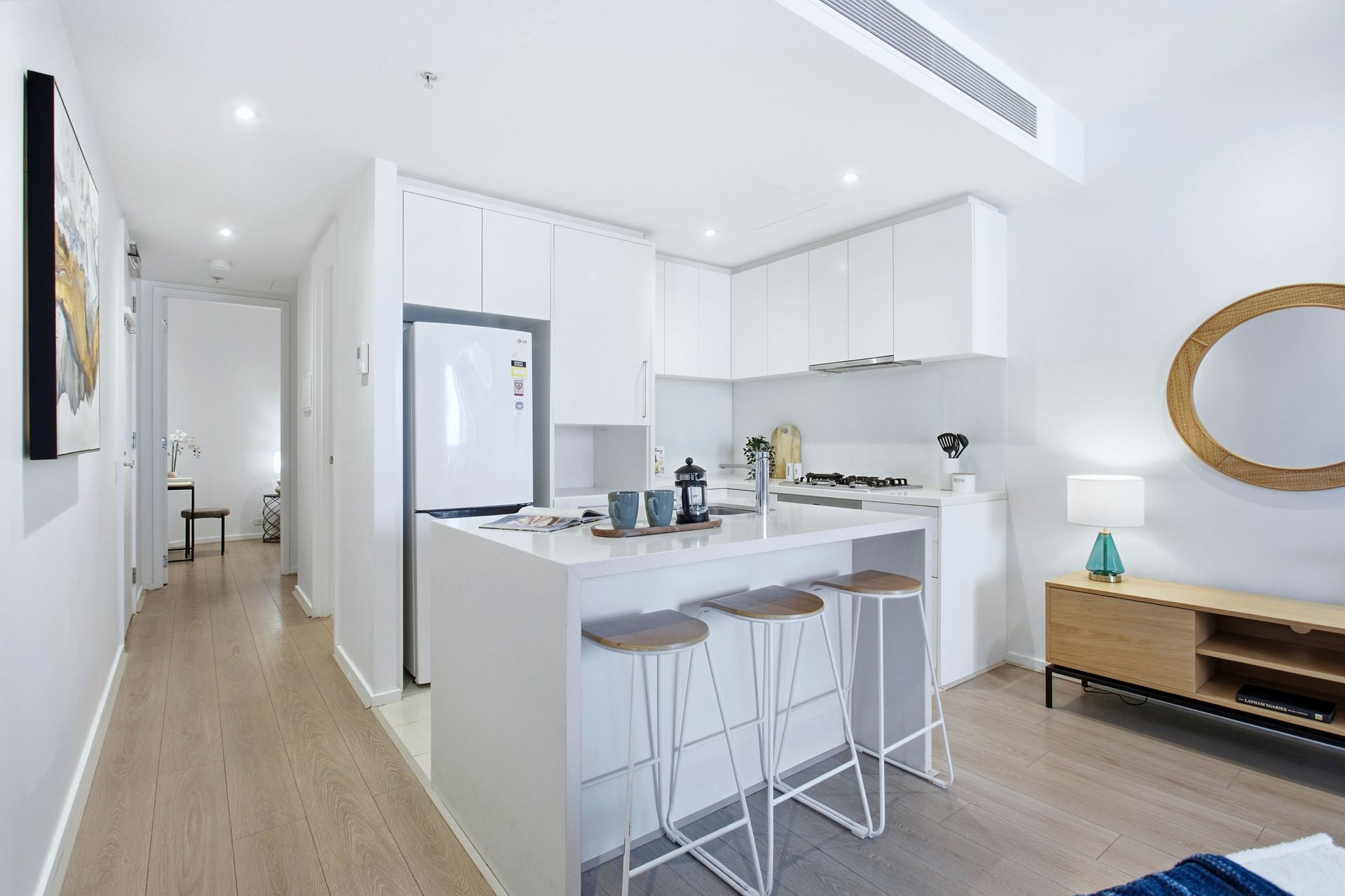 The open-plan living and dining zone flows seamlessly to a private undercover balcony, creating the perfect space to relax, entertain, or simply soak in the outlook. The sleek kitchen features quality stone benchtops, a central island, premium Miele appliances, a large pantry and abundant storage - designed for effortless everyday living and entertaining.