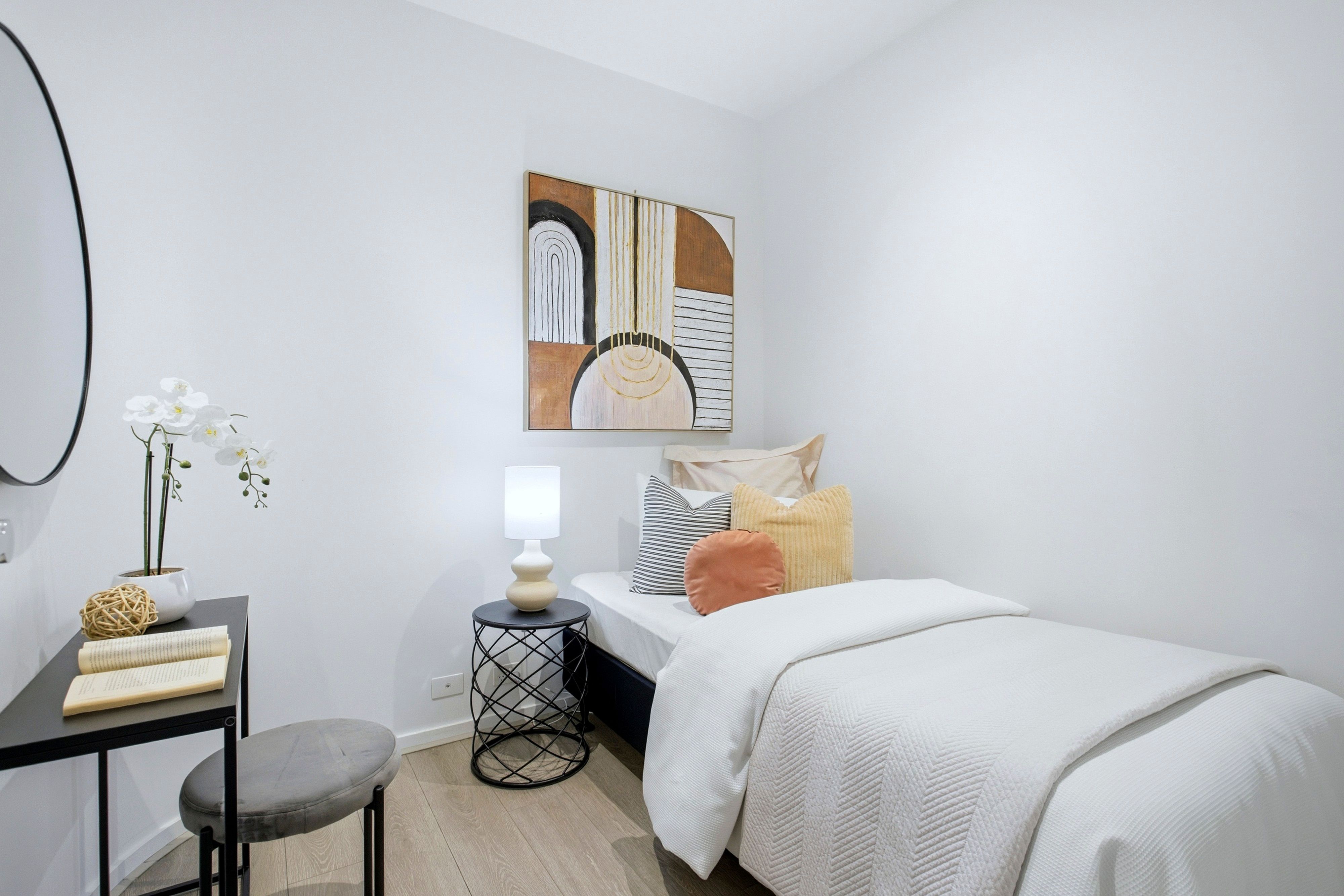 The main bedroom features mirrored built-in robes and a stunning outlook, while the second bedroom provides versatile space for a home office, guest room, or creative retreat. A stylish bathroom with luxury finishes, European laundry, ducted heating and cooling, and double-glazed windows complete the apartment's refined interior.