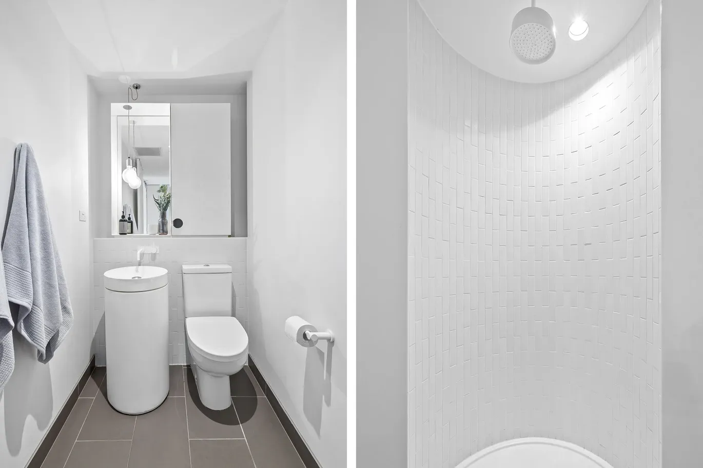 • Modern bathroom with rainfall shower and ample vanity storage
