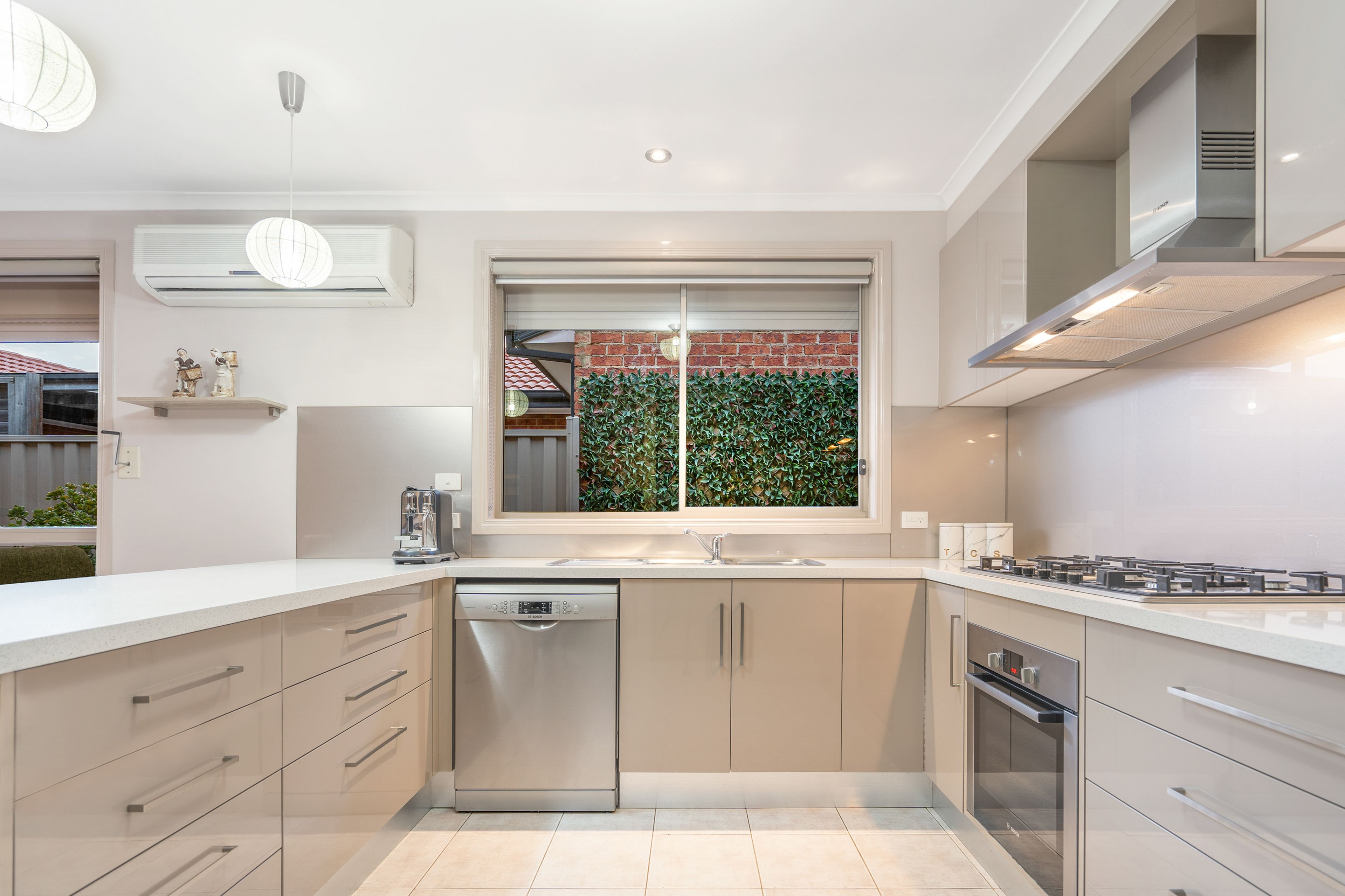 * Modern kitchen with stone benchtops, two pack cabinets and soft close drawers