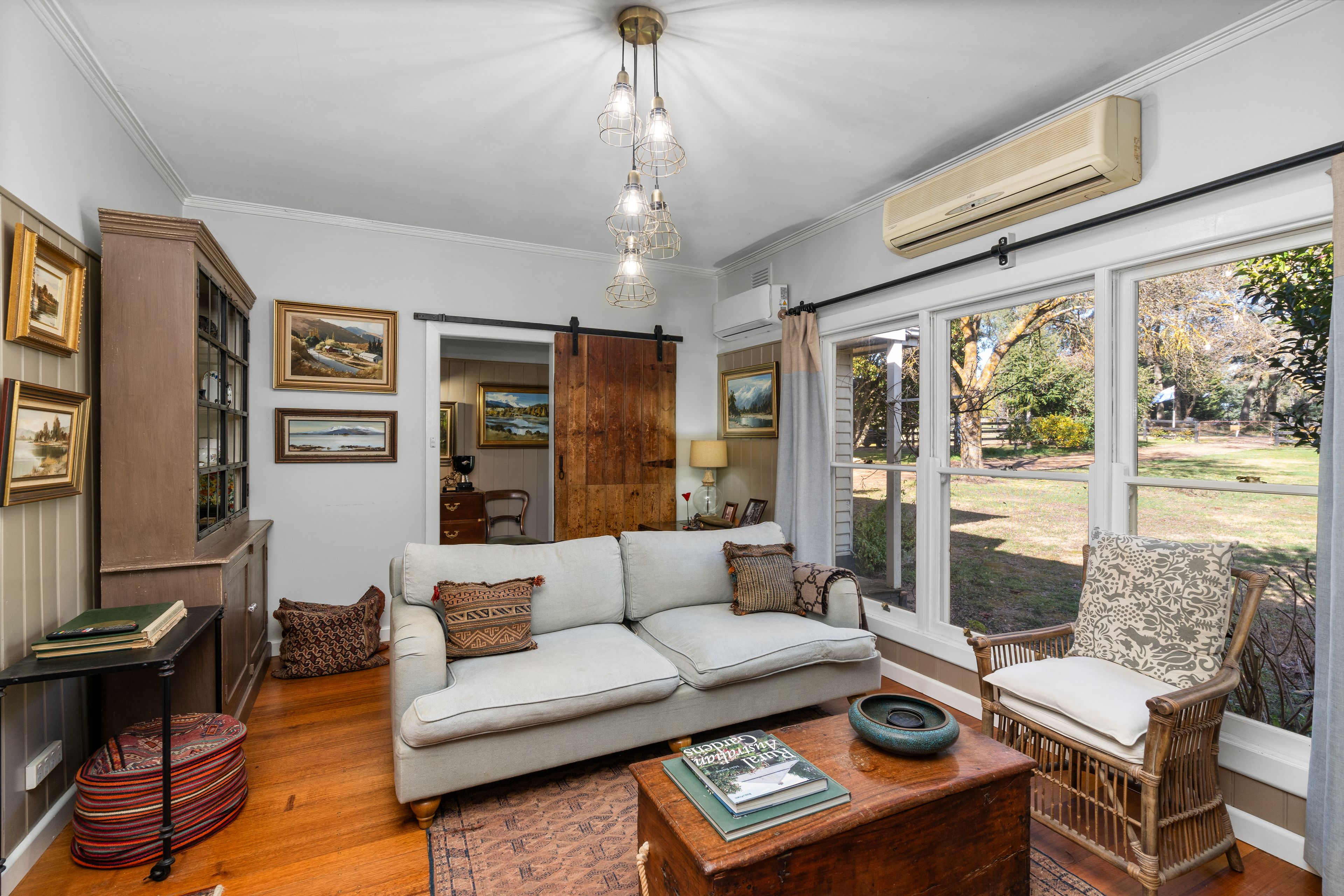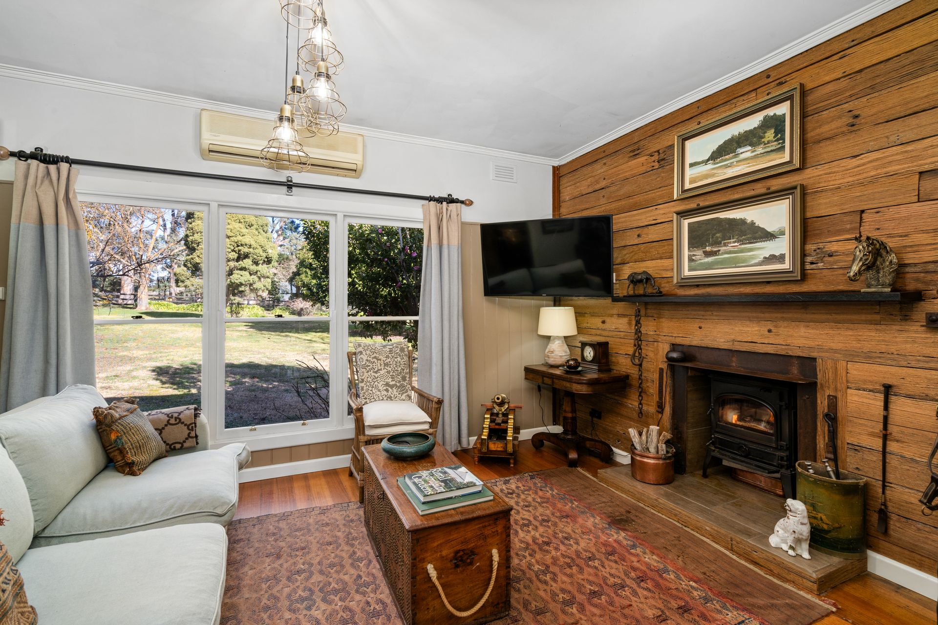 • Feature wall in the lounge the owner has created from recycled timber out of the shearing shed