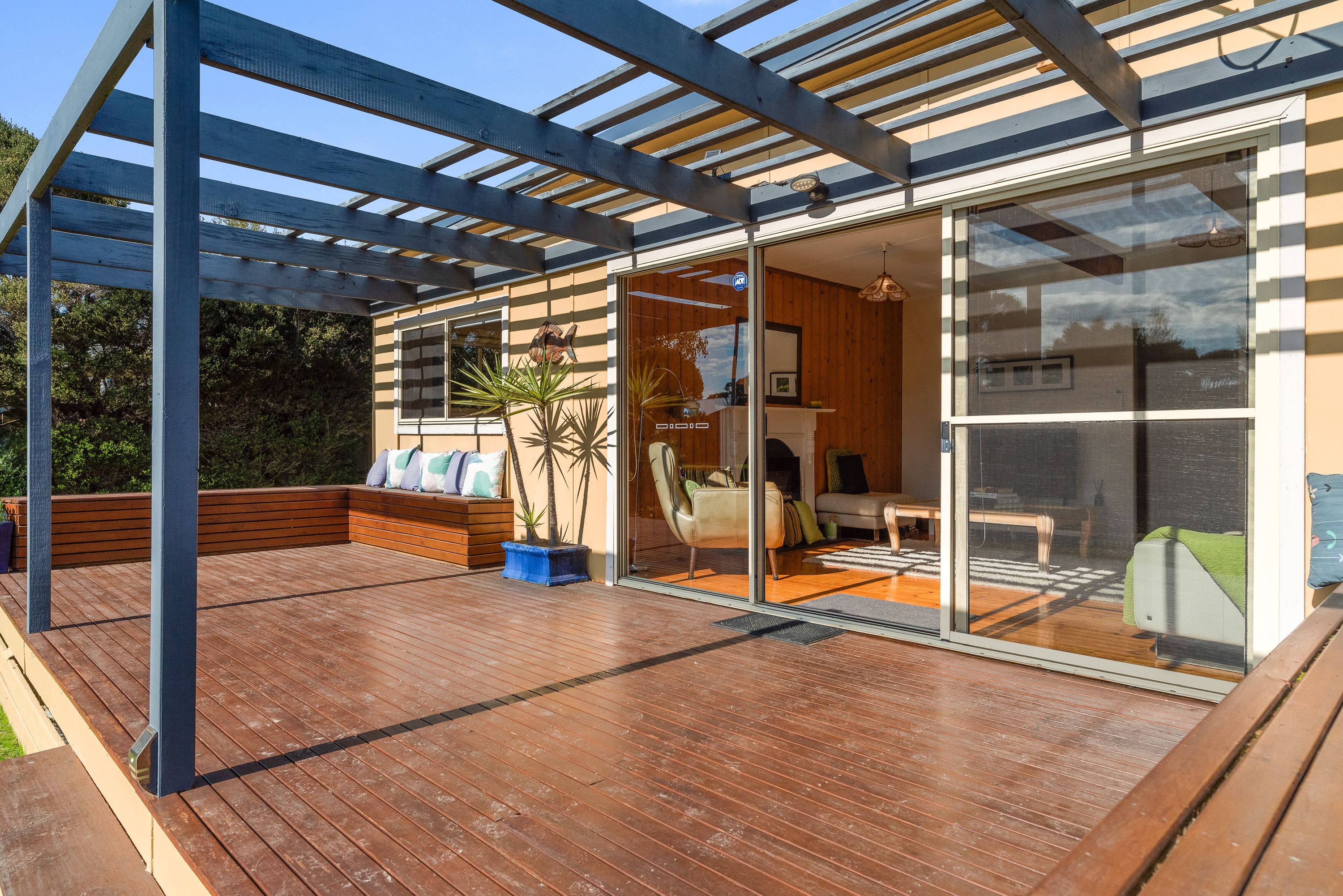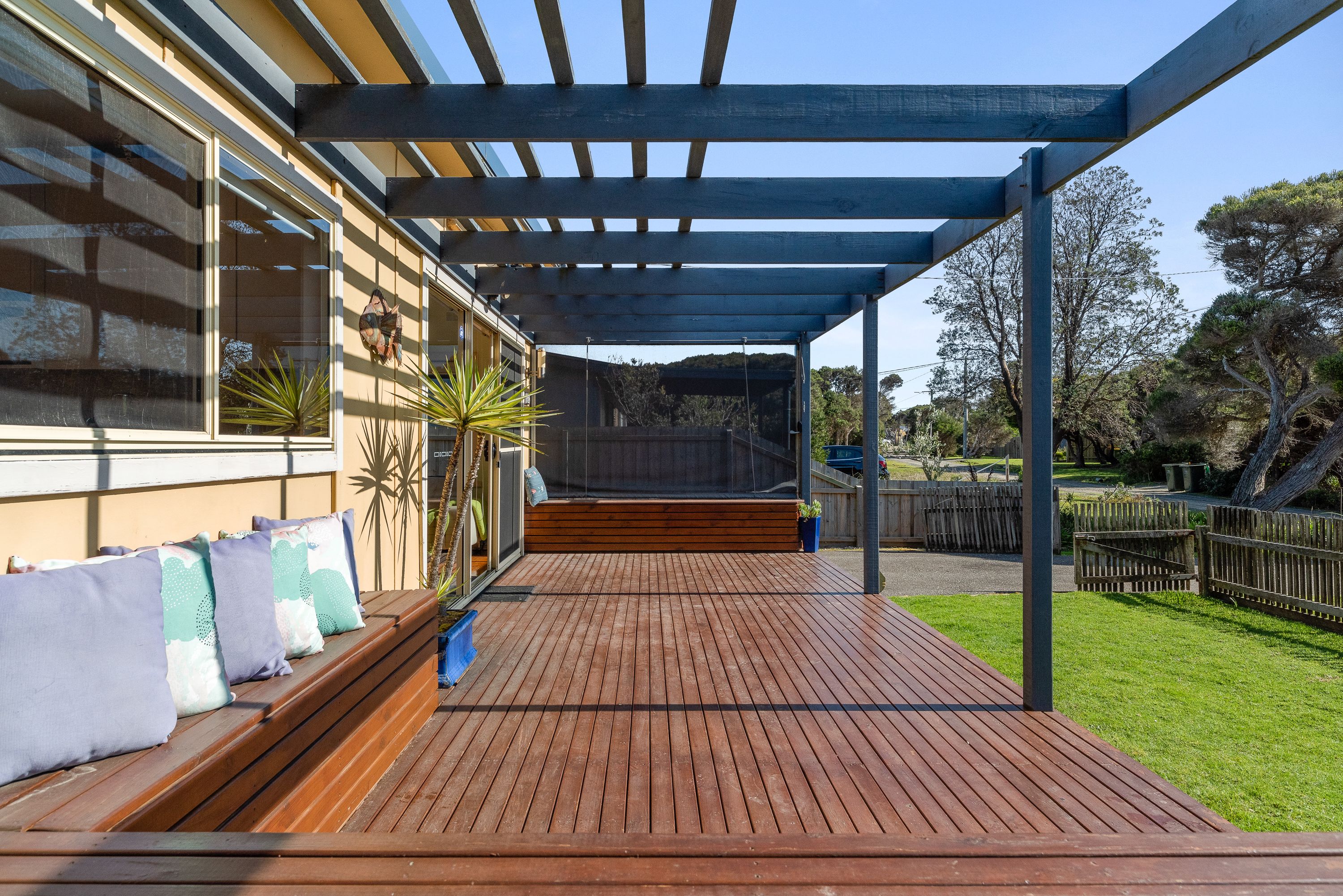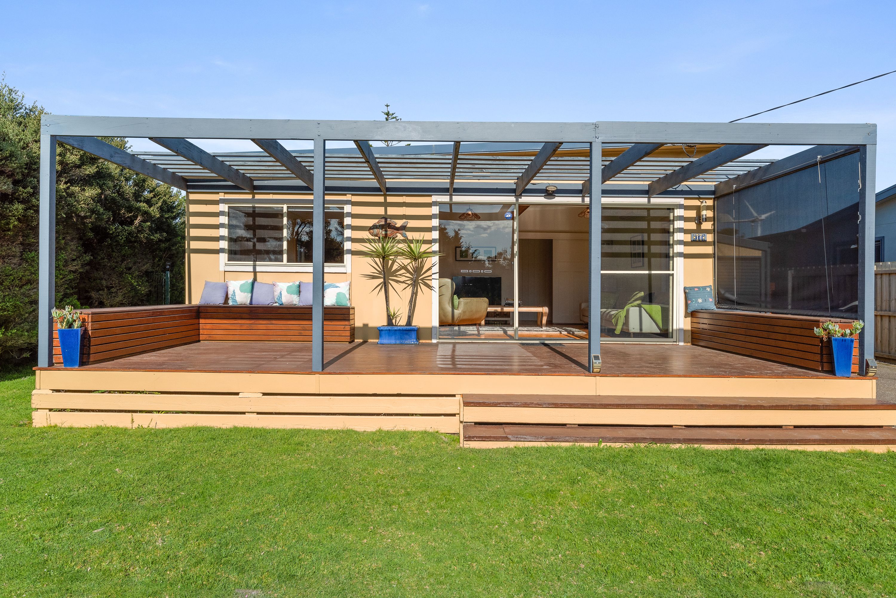 The back living room opens out on to the back decking area, partially enclosed with cafe blinds for year round use, and overlooking the large backyard with mature trees, lush green lawn and garden.