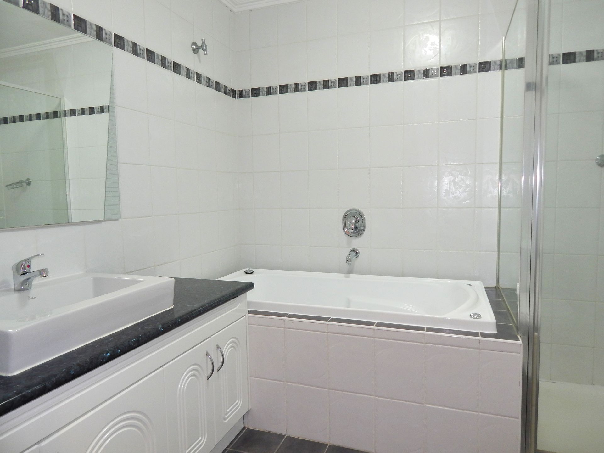 - Sparkling two way bathroom with bath and shower