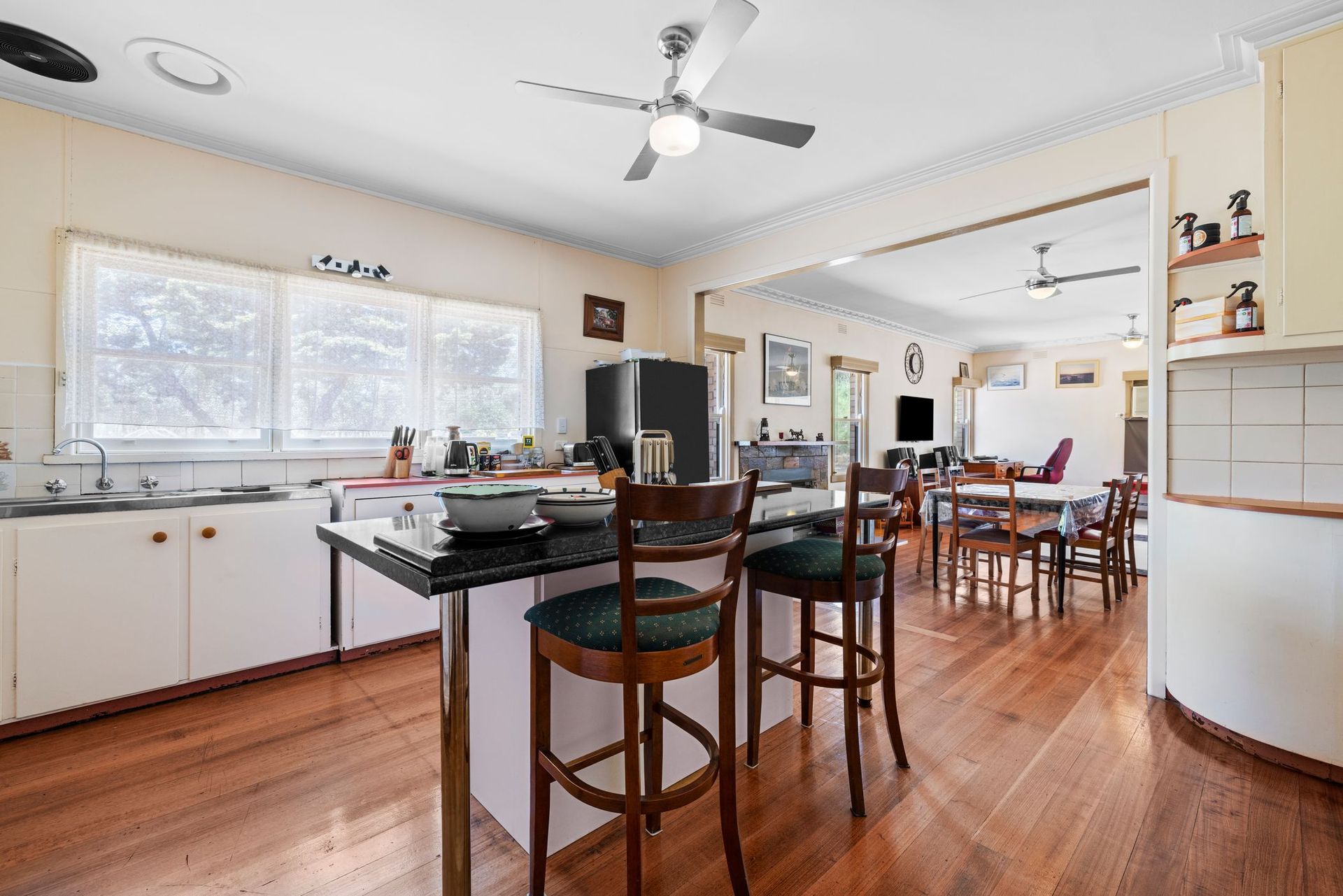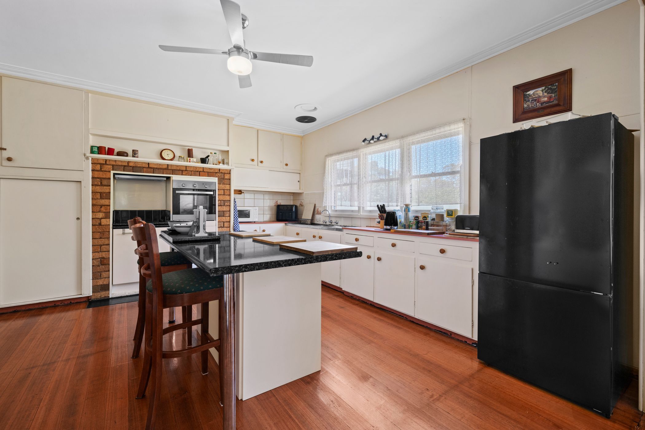 The generous kitchen boasts an electric cooktop and oven, plenty of storage, a convenient breakfast bar, and an open layout that flows into the dining area. The dining room also has original hardwood flooring, sash windows, a cozy wood combustion heater with slate surrounds, and an overhead fan, creating a warm and inviting atmosphere.