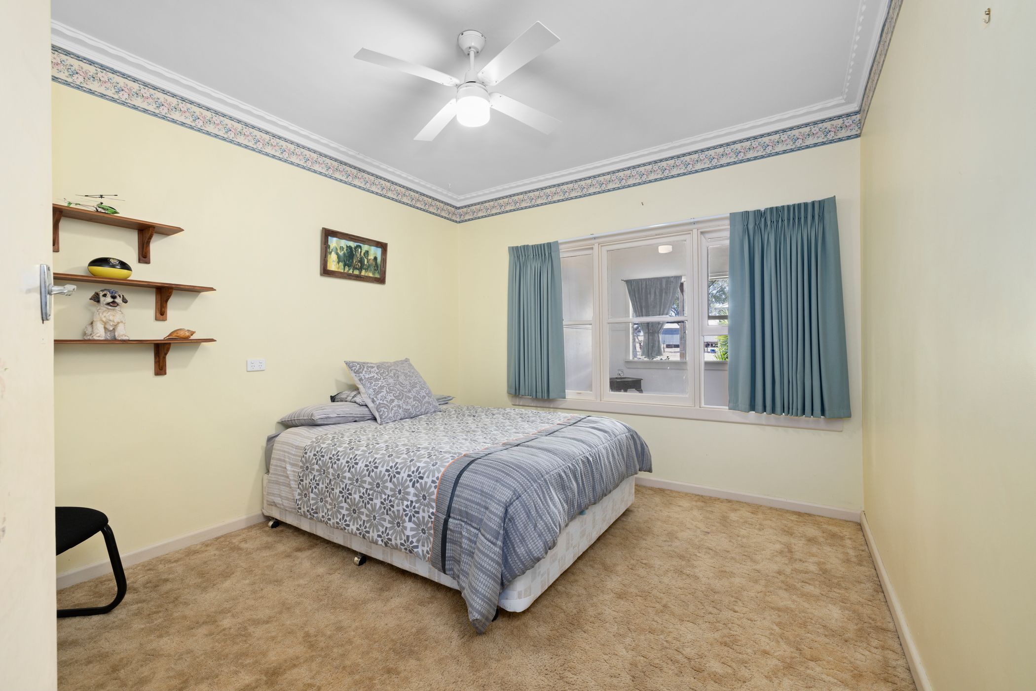 As you step inside, a spacious hallway with 14 inbuilt cupboards provides ample storage. The expansive lounge seamlessly connects to the open-plan kitchen and dining area, featuring beautiful original hardwood floors, sash windows, an overhead fan, and a wall-mounted air conditioner for cooling.
