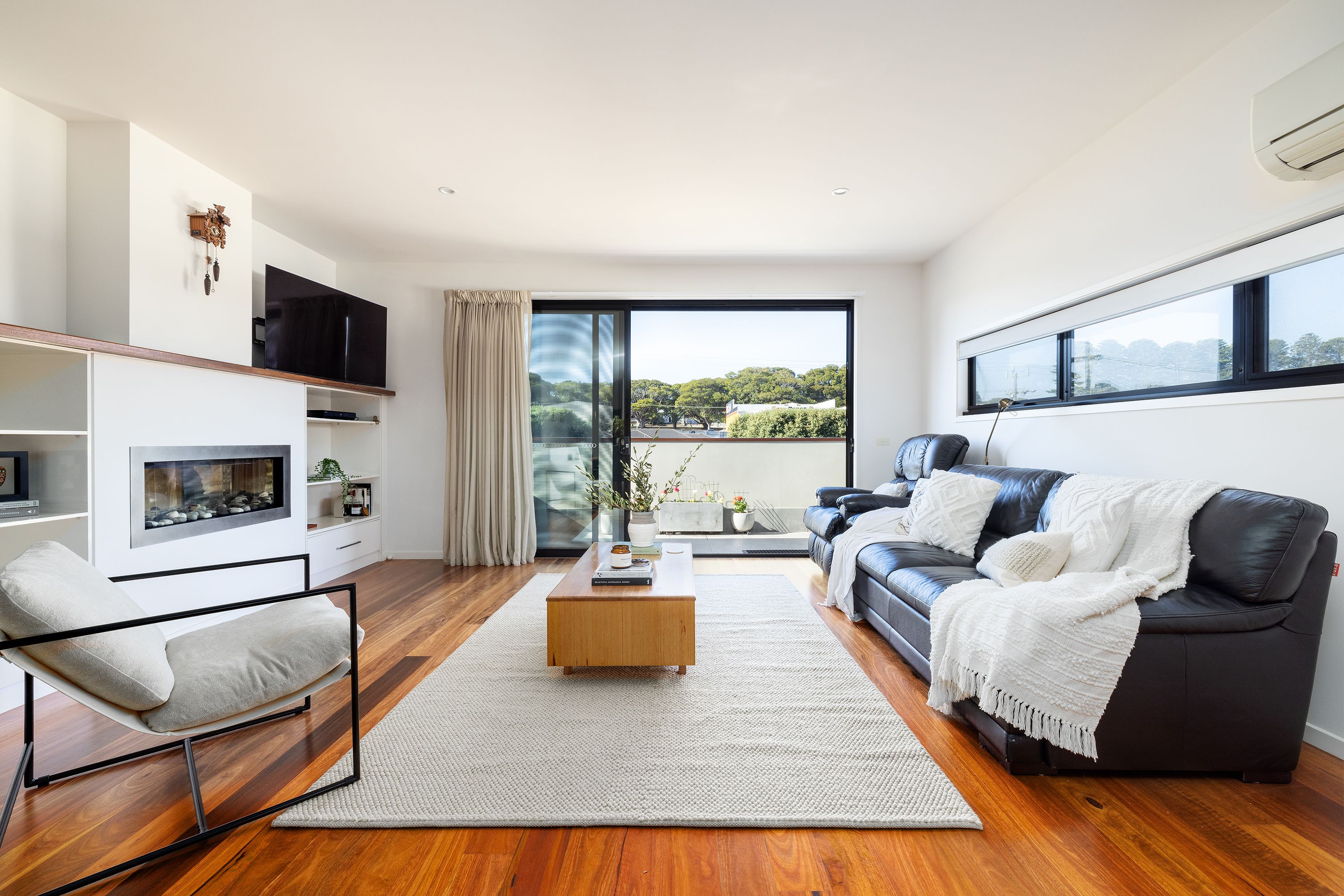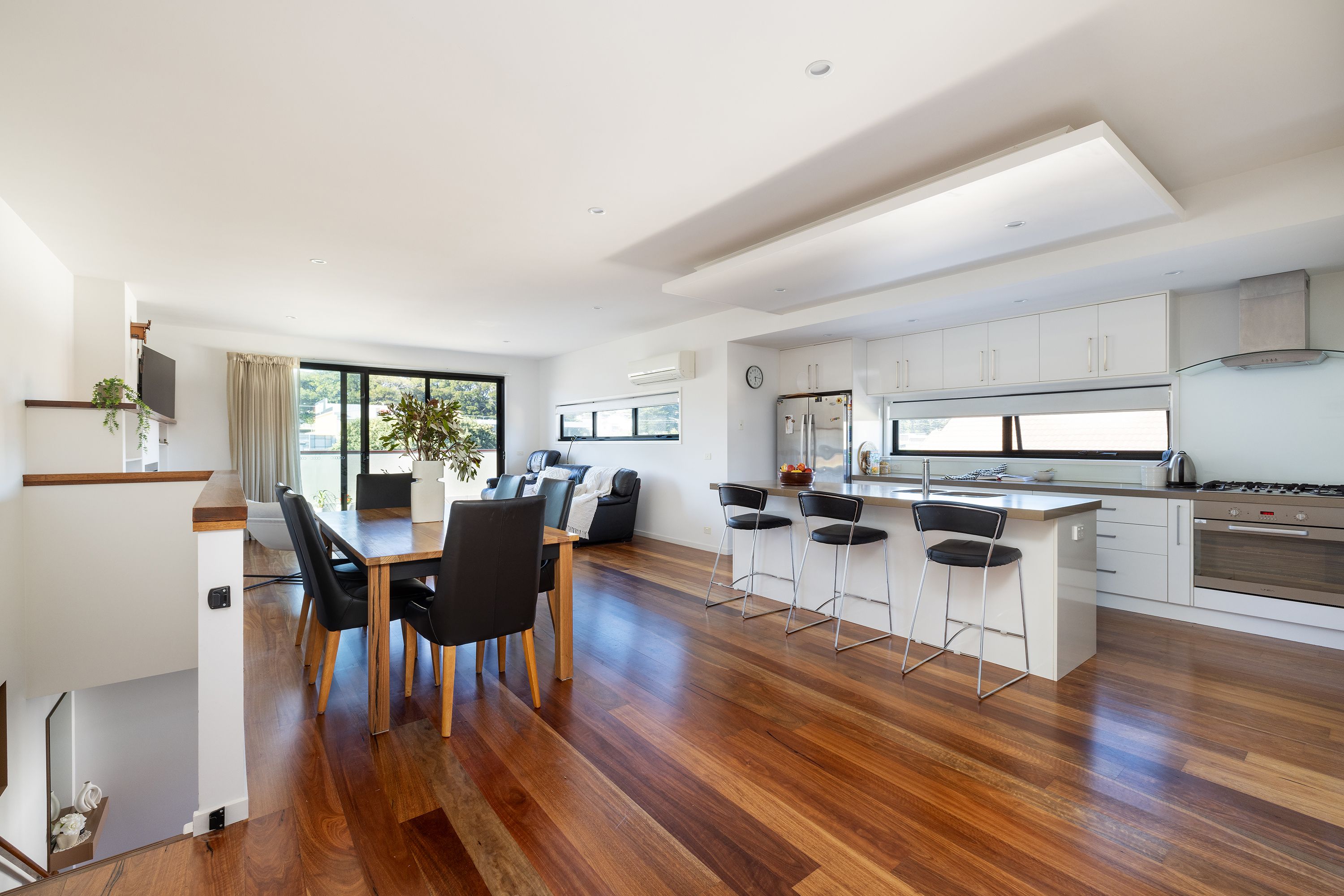 The kitchen includes stainless steel appliances and features a floating bulkhead. Along with the upper level including a reverse cycle unit and gas log fire.