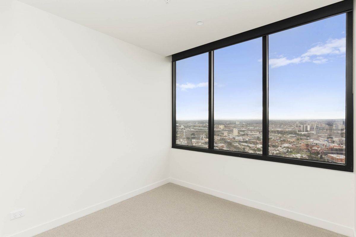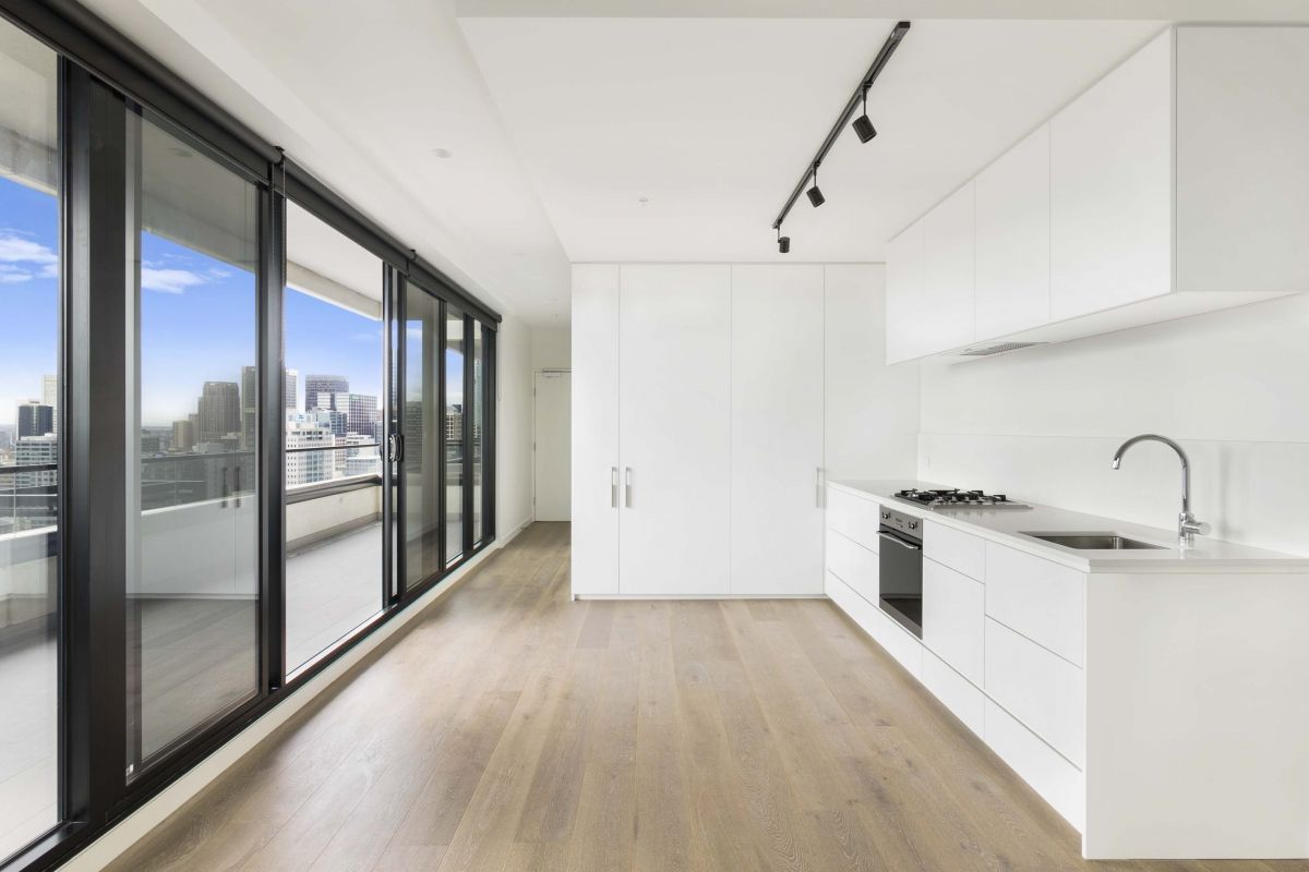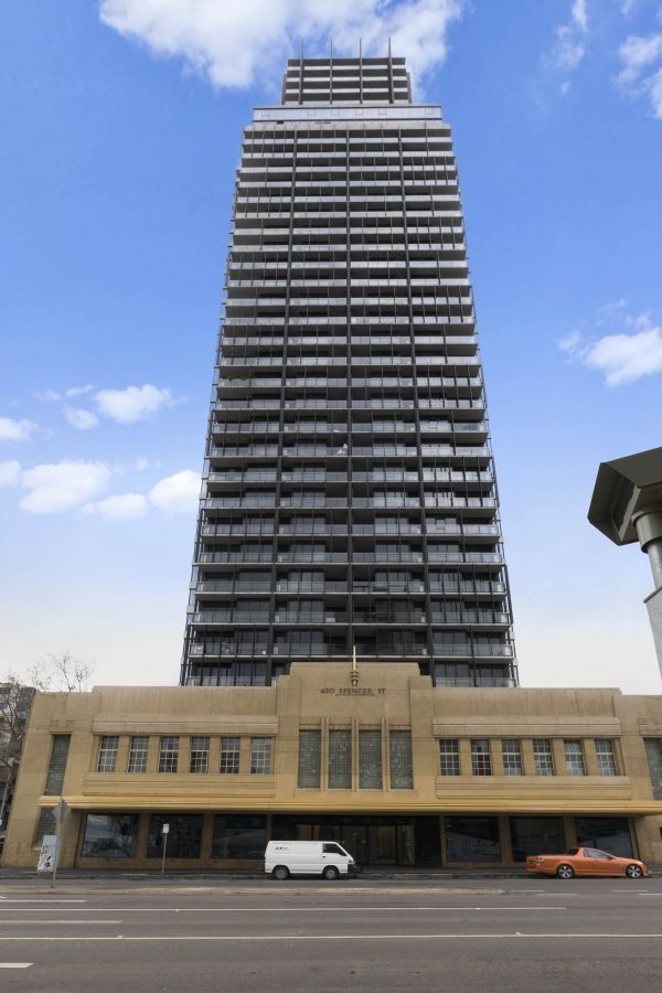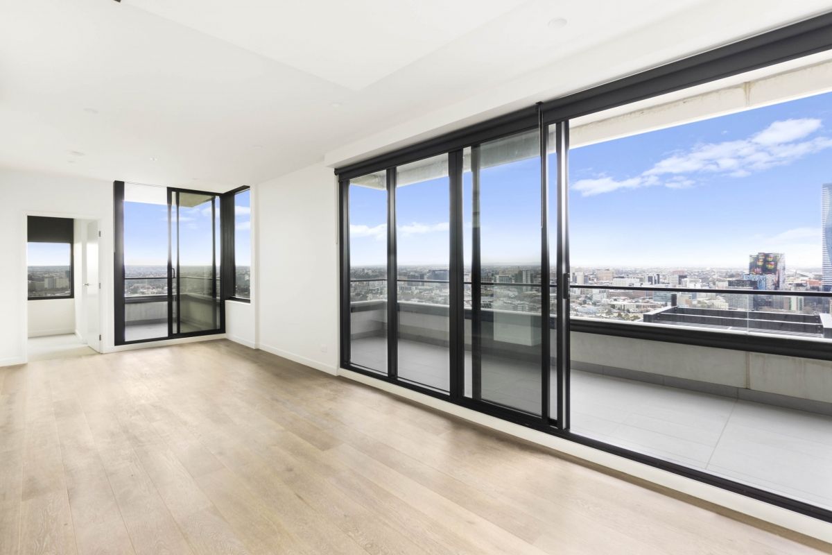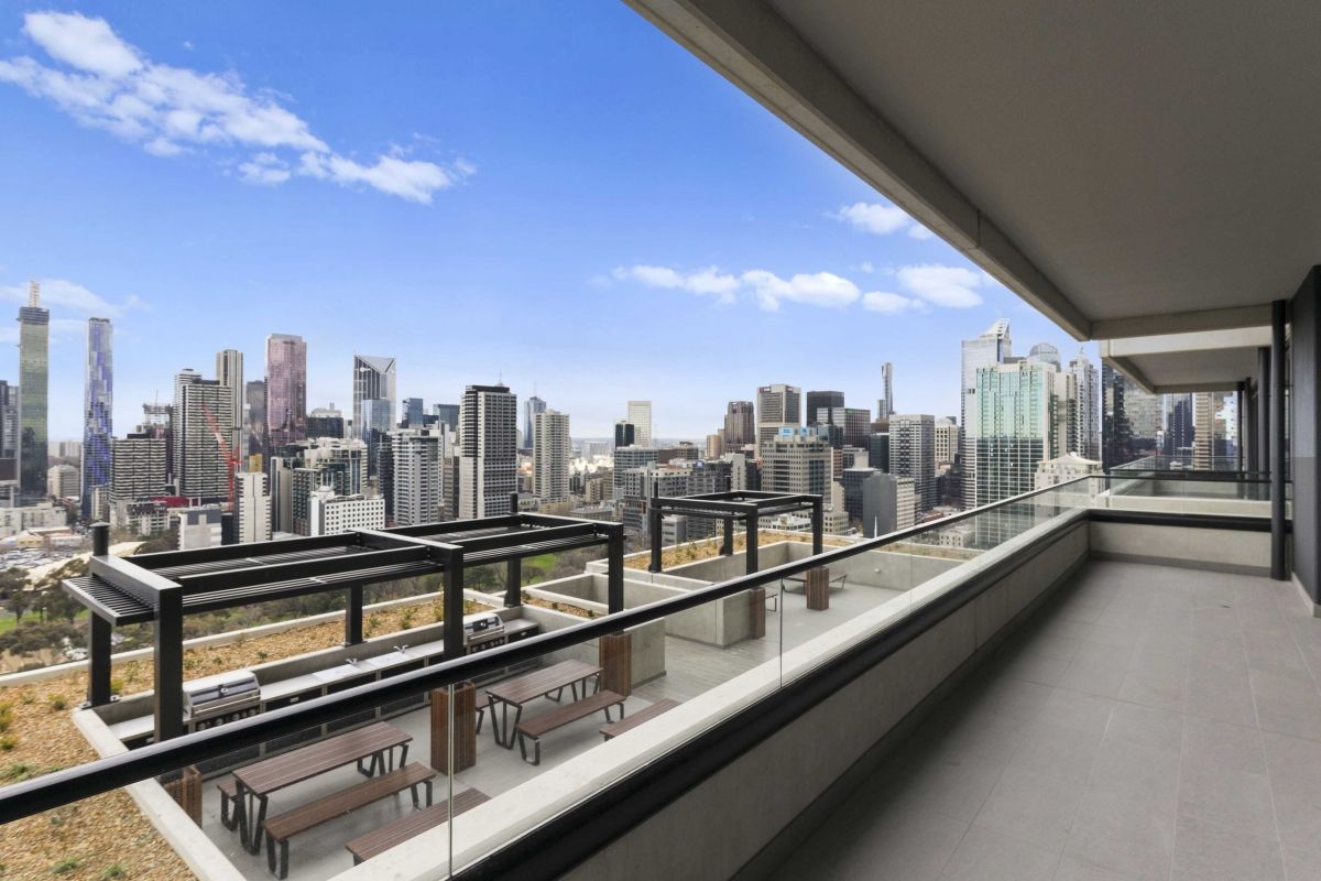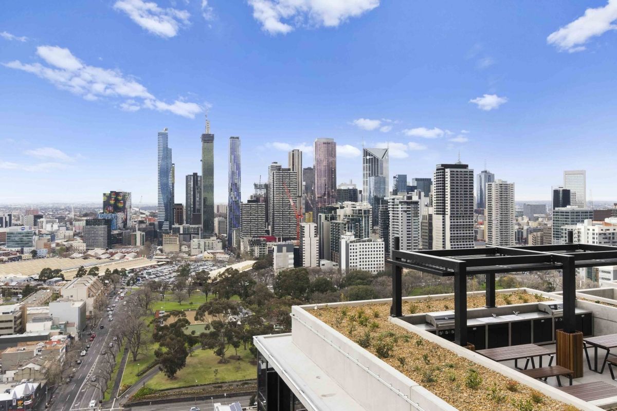 Larger balcony with double sliding facing south east overlooking the Queen Victoria Market and Flagstaff Gardens.