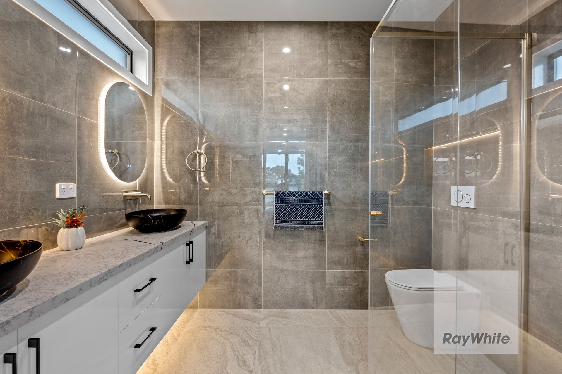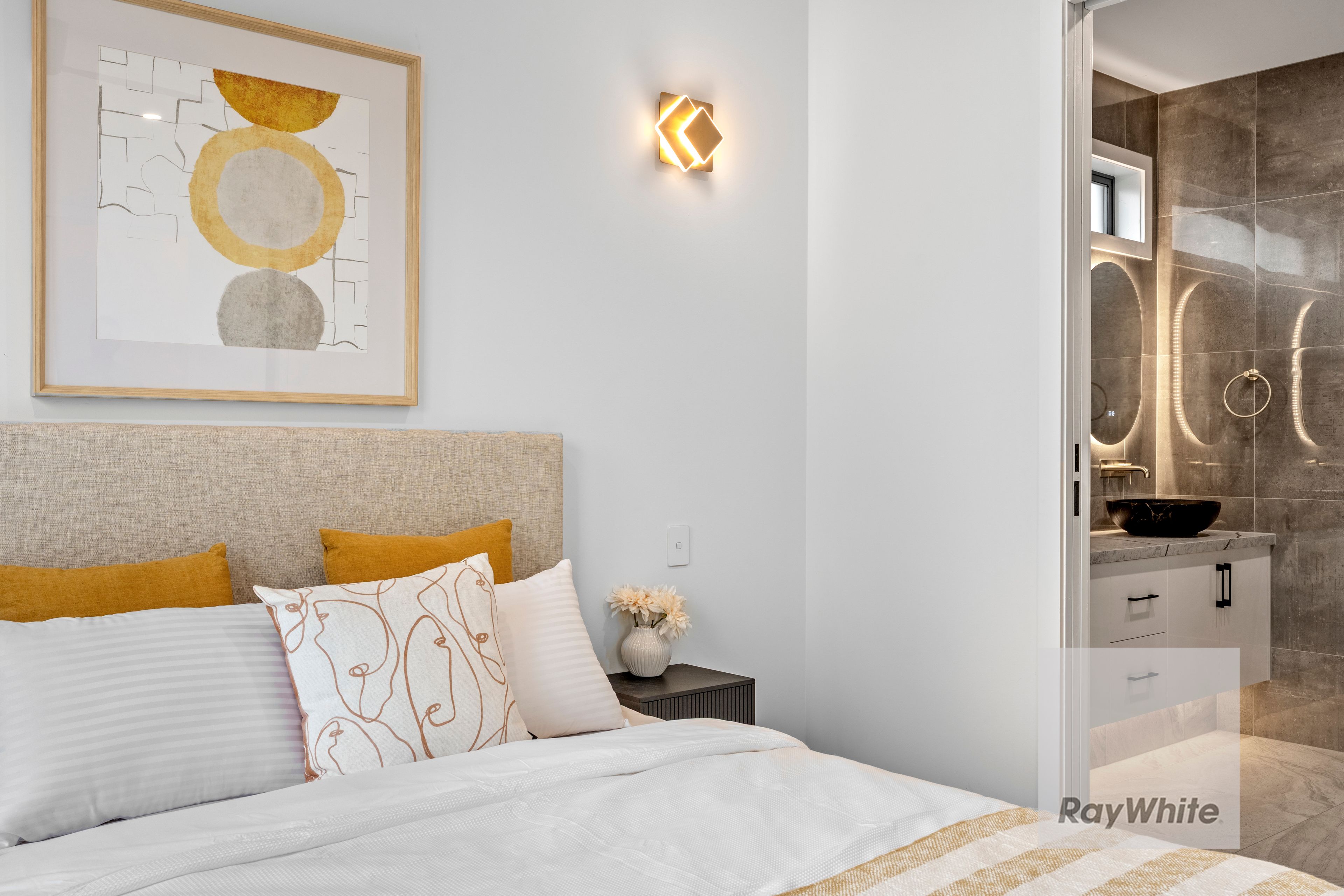 The thoughtfully designed floorplan offers four generously sized bedrooms, including a luxurious master suite complete with a designer ensuite featuring floor-to-ceiling tiles, frameless glass shower, floating vanity with stone benchtops, illuminated LED mirrors, and premium fittings-delivering a true hotel-style bathroom experience. Both bathrooms are finished with smart, contemporary fixtures that blend elegance with everyday practicality.