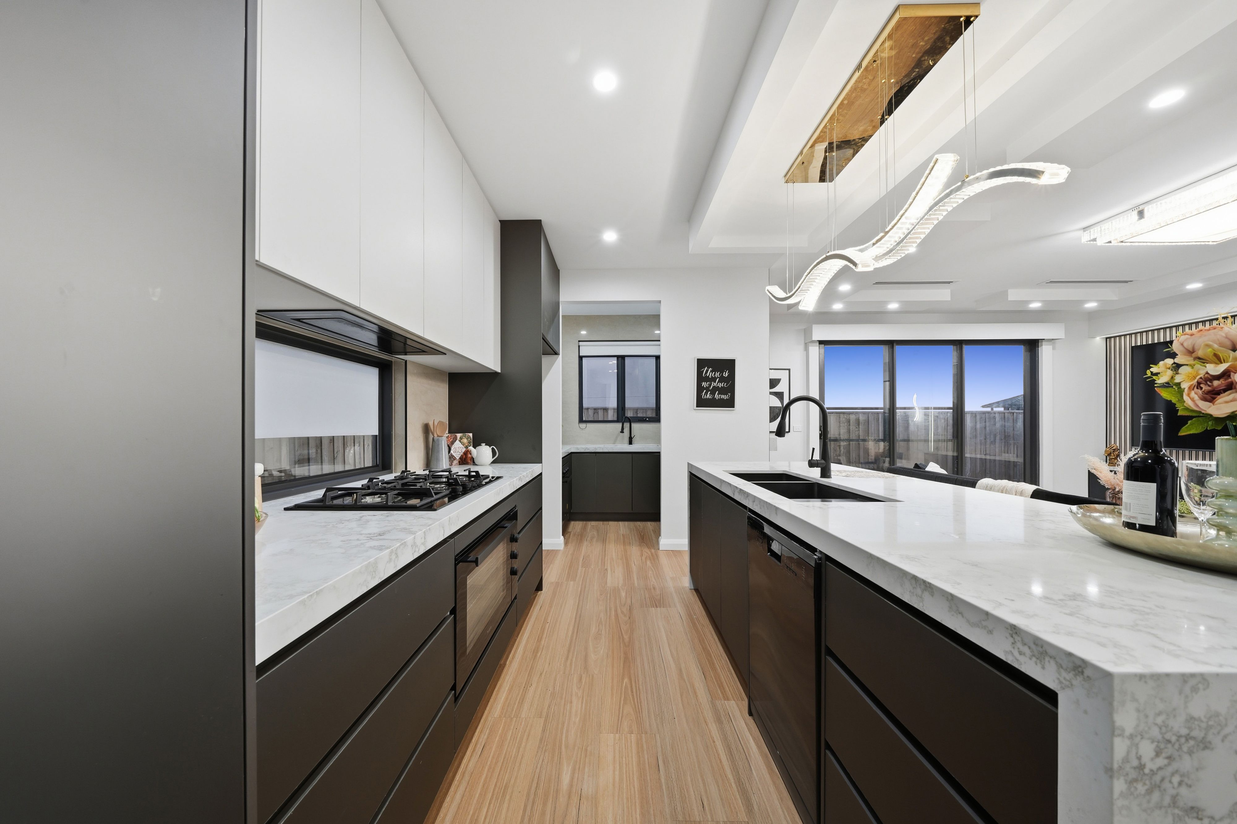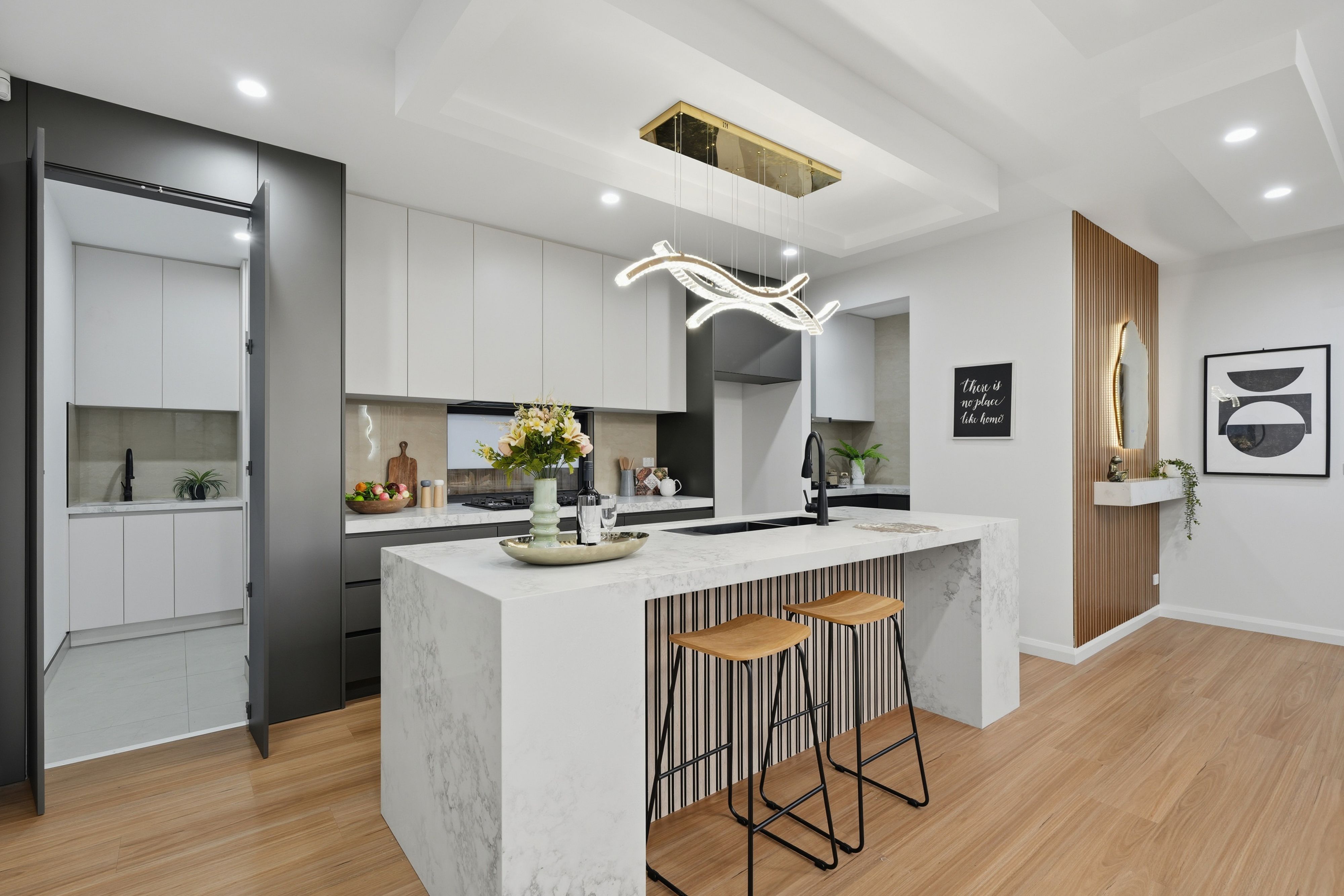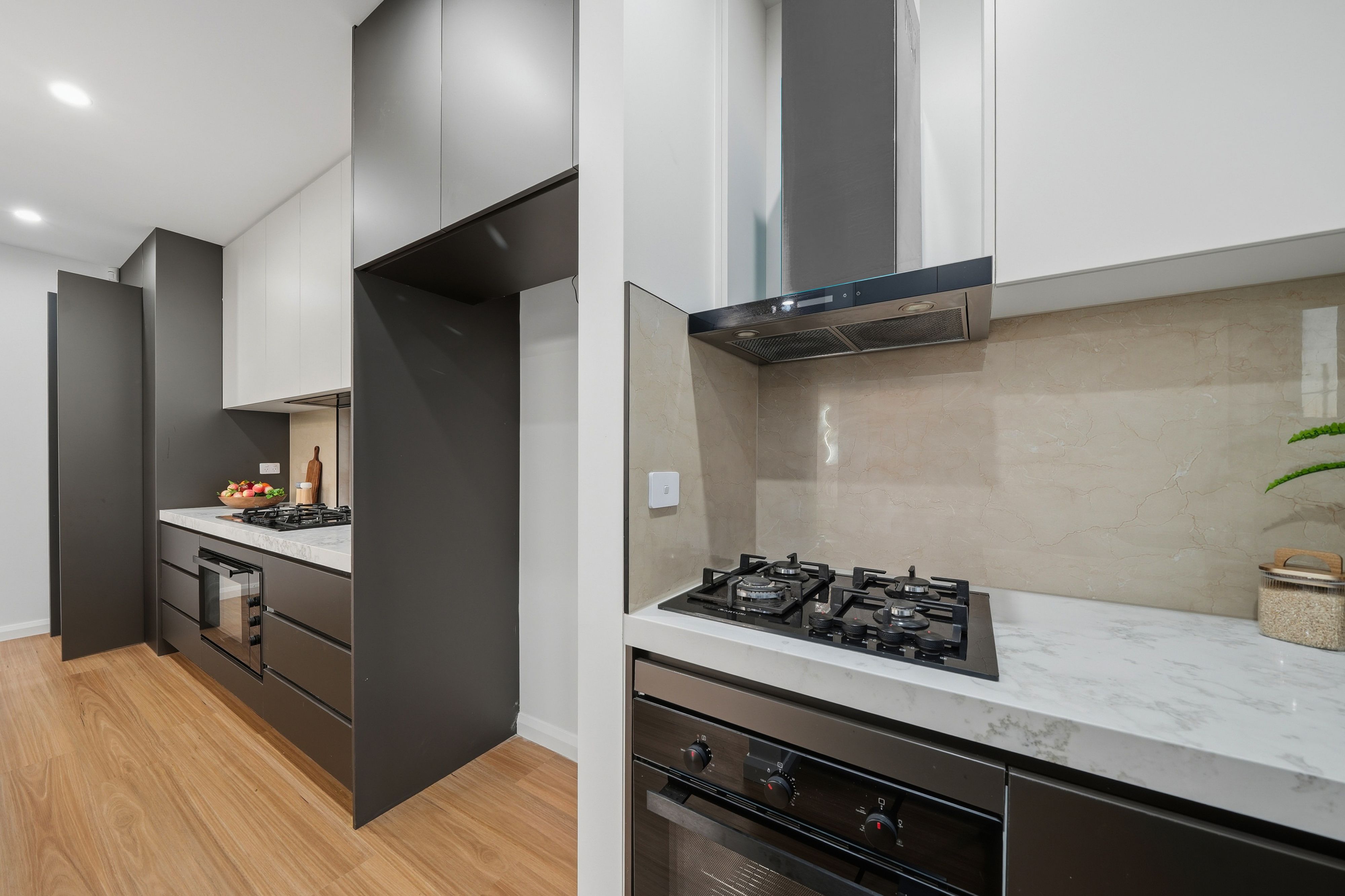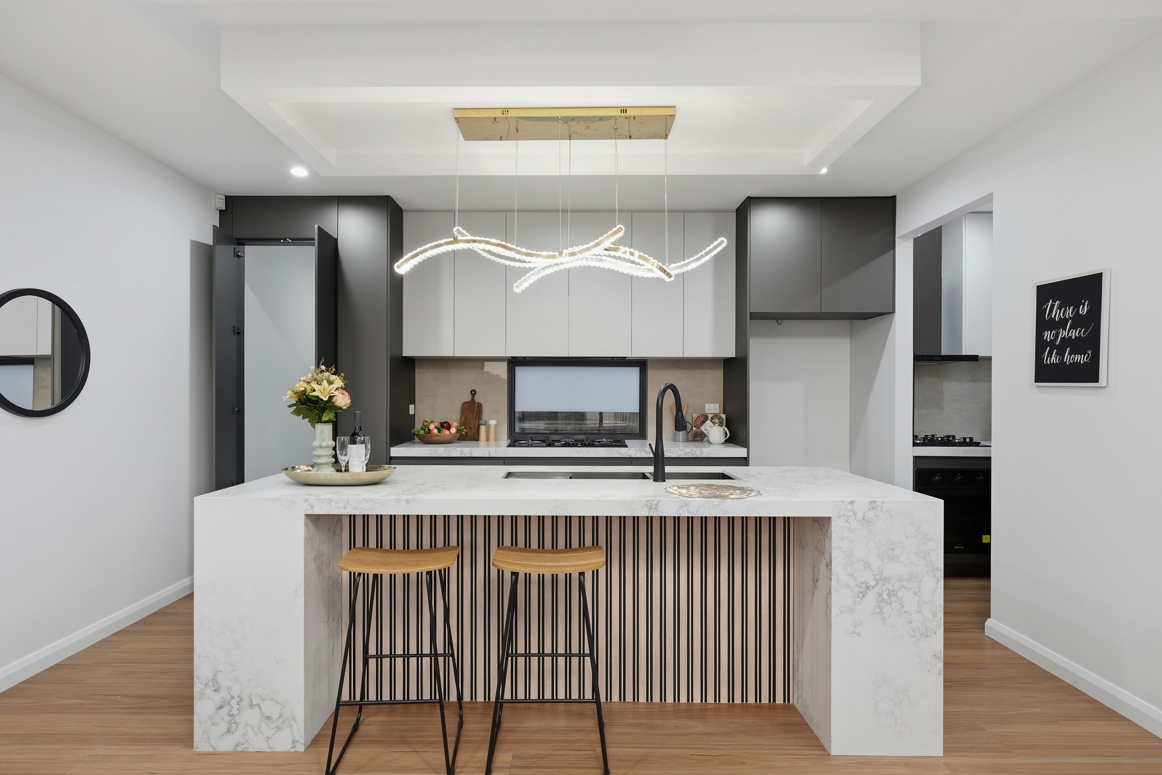 Stylish kitchen featuring 900mm appliances, stone bench tops, and ample storage