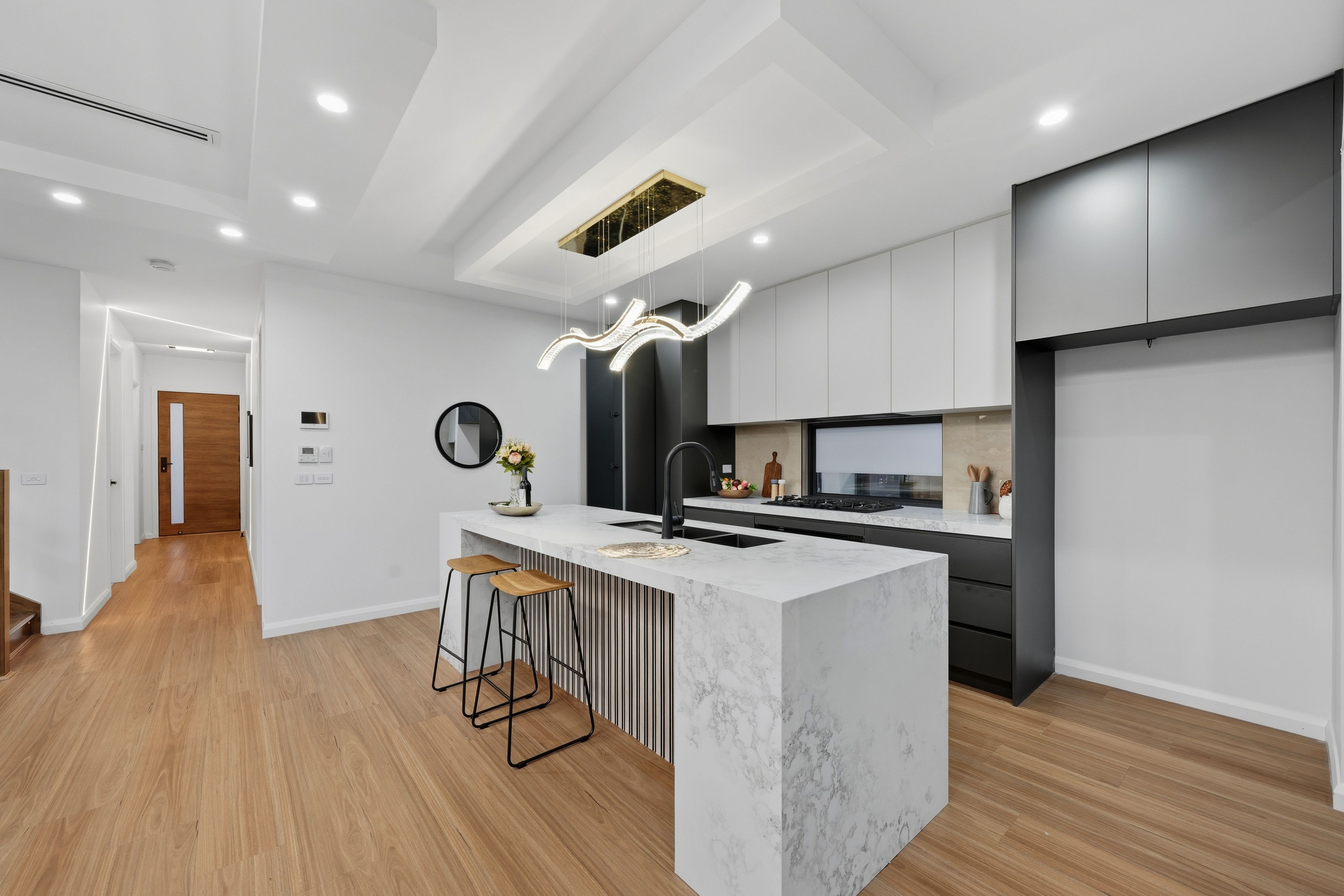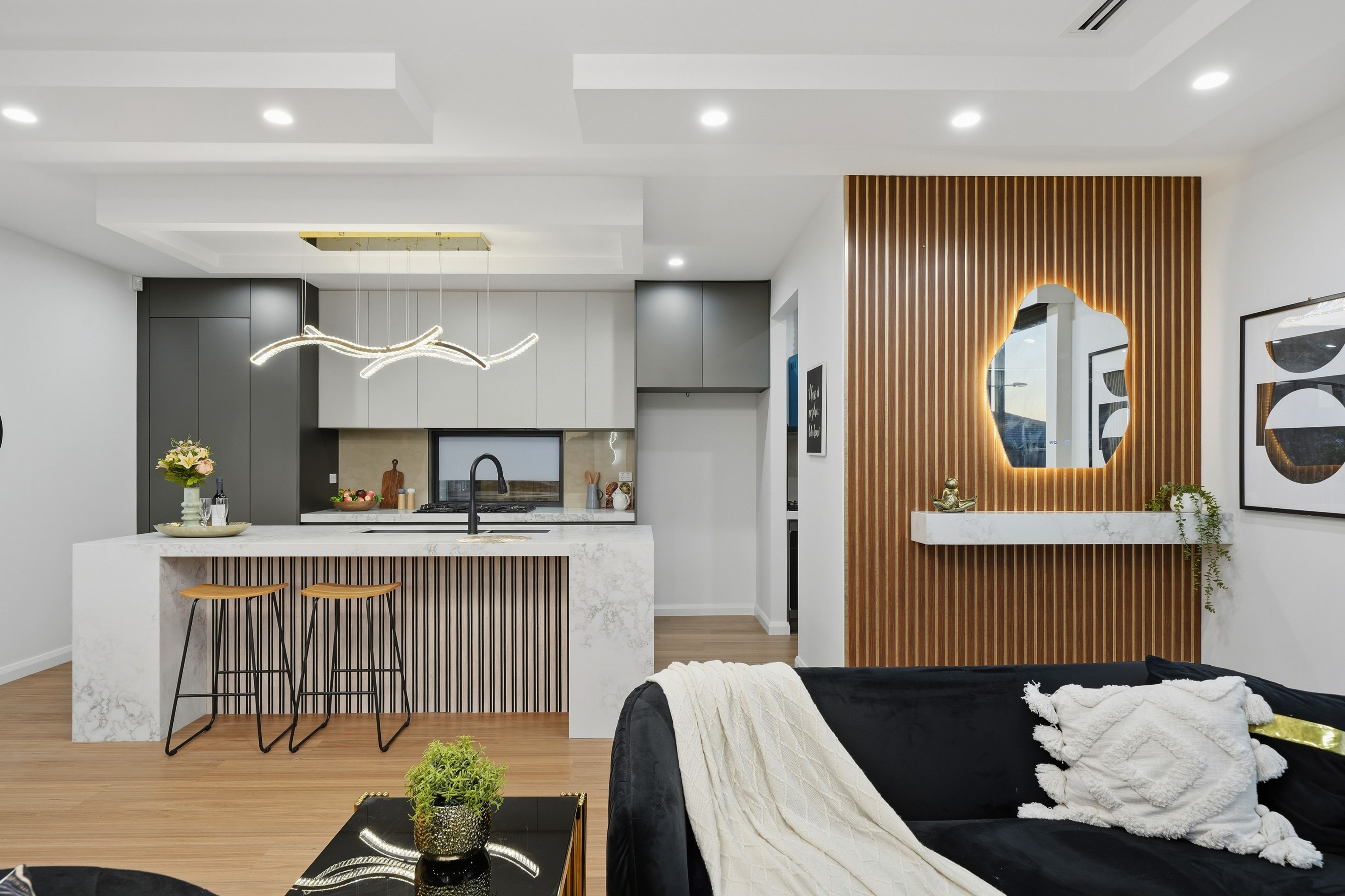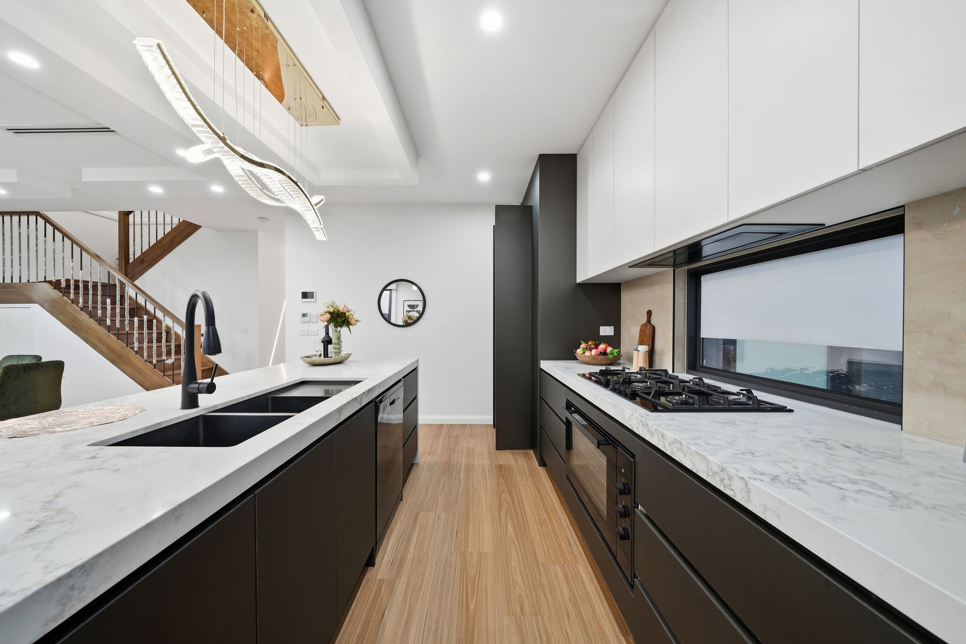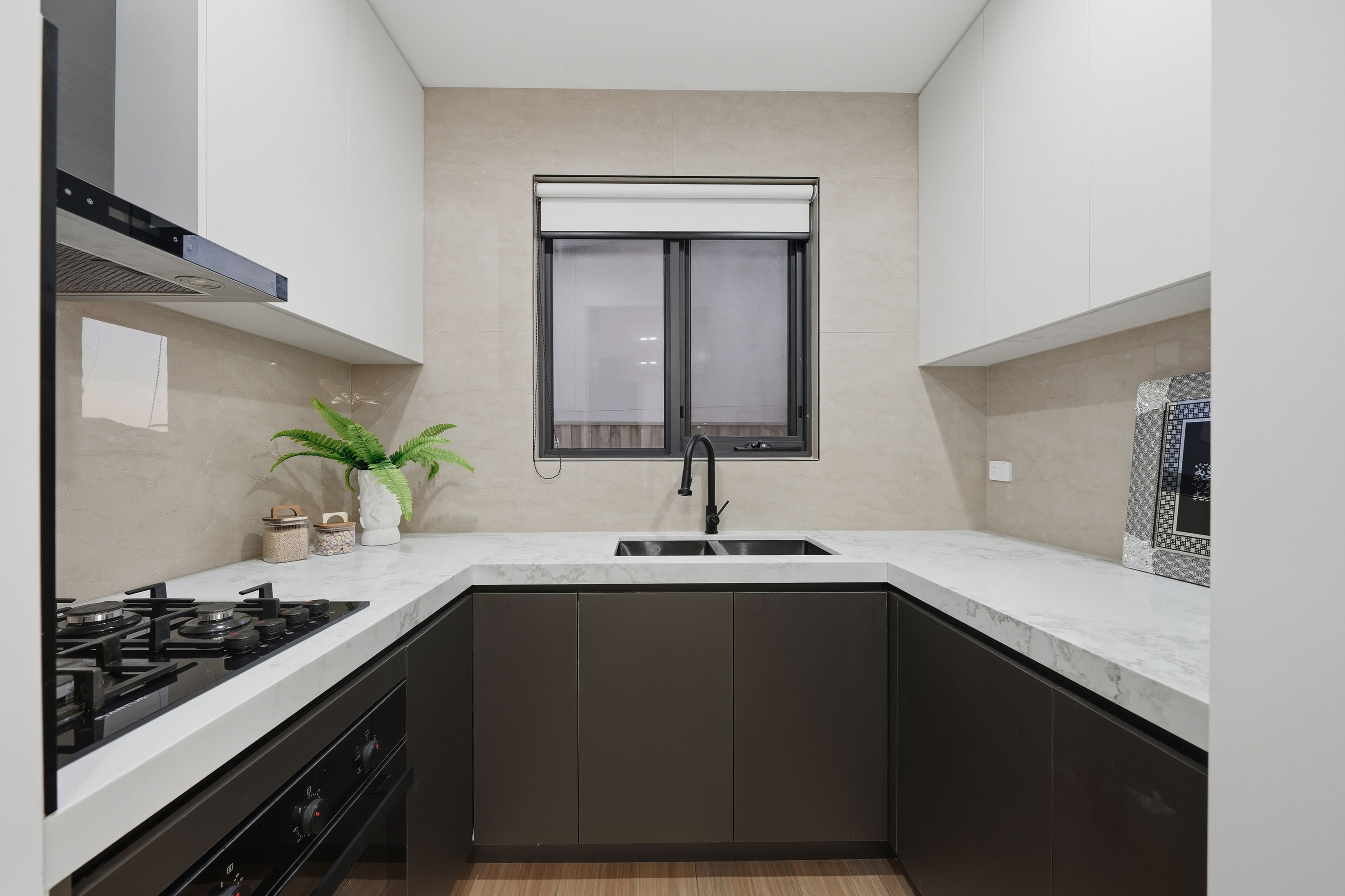 Stylish kitchen featuring 900mm appliances, stone bench tops, and ample storage